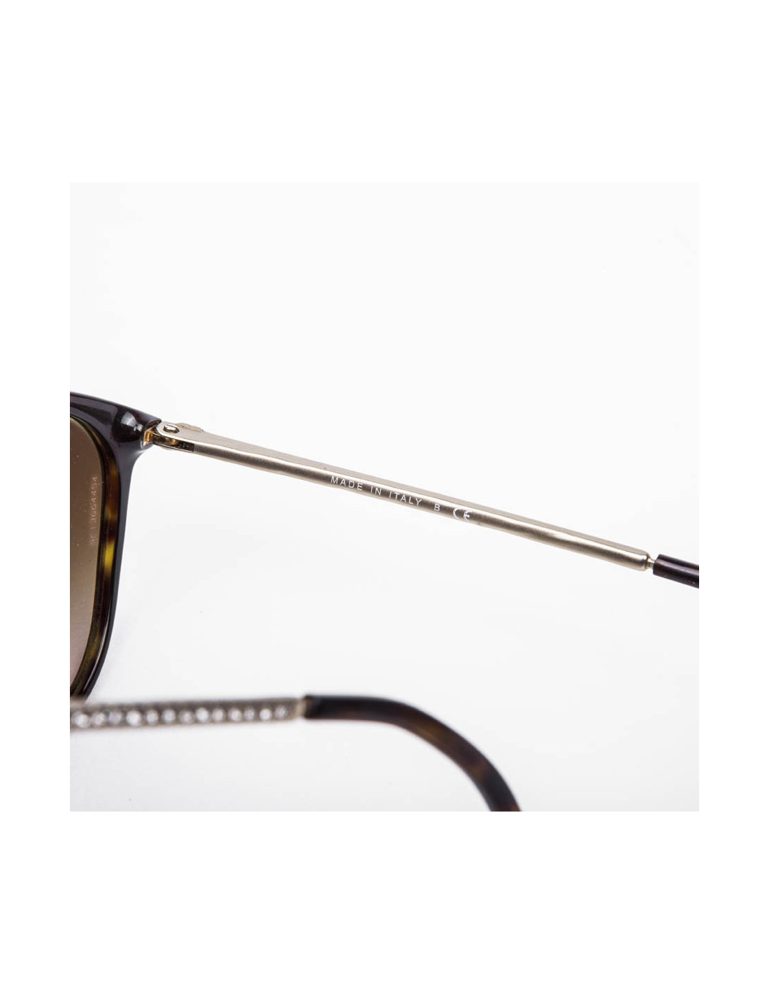 Lunettes de soleil Chanel en plexiglas marron et métal doré avec strass. Couleur des verres : dégradé de marron. En très bon état. Made in Italy.