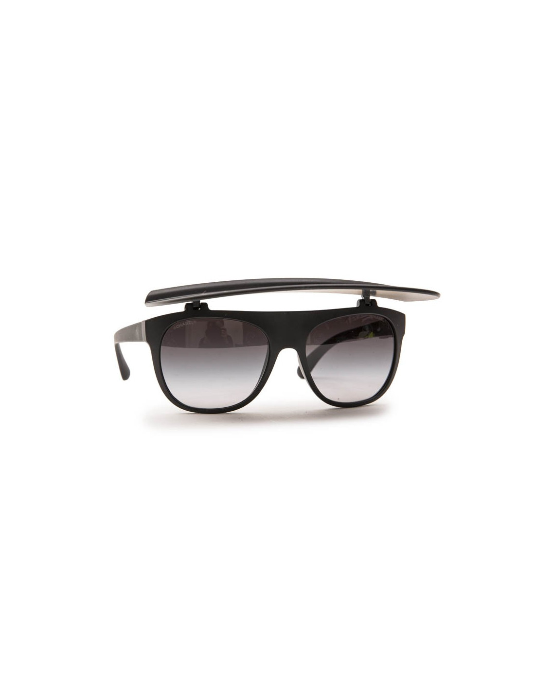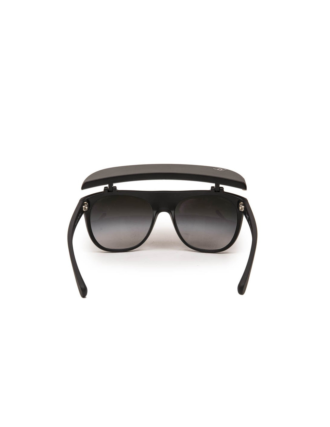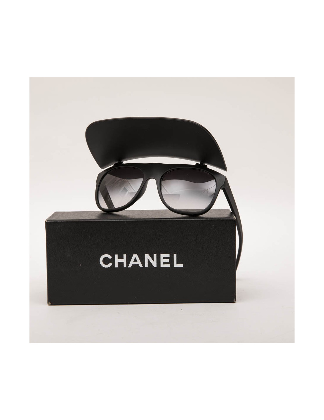 Lunettes de soleil Chanel en plastique noir mat avec visière pliante. Verres : dégradé de noir. Verres et monture en très bon état.
