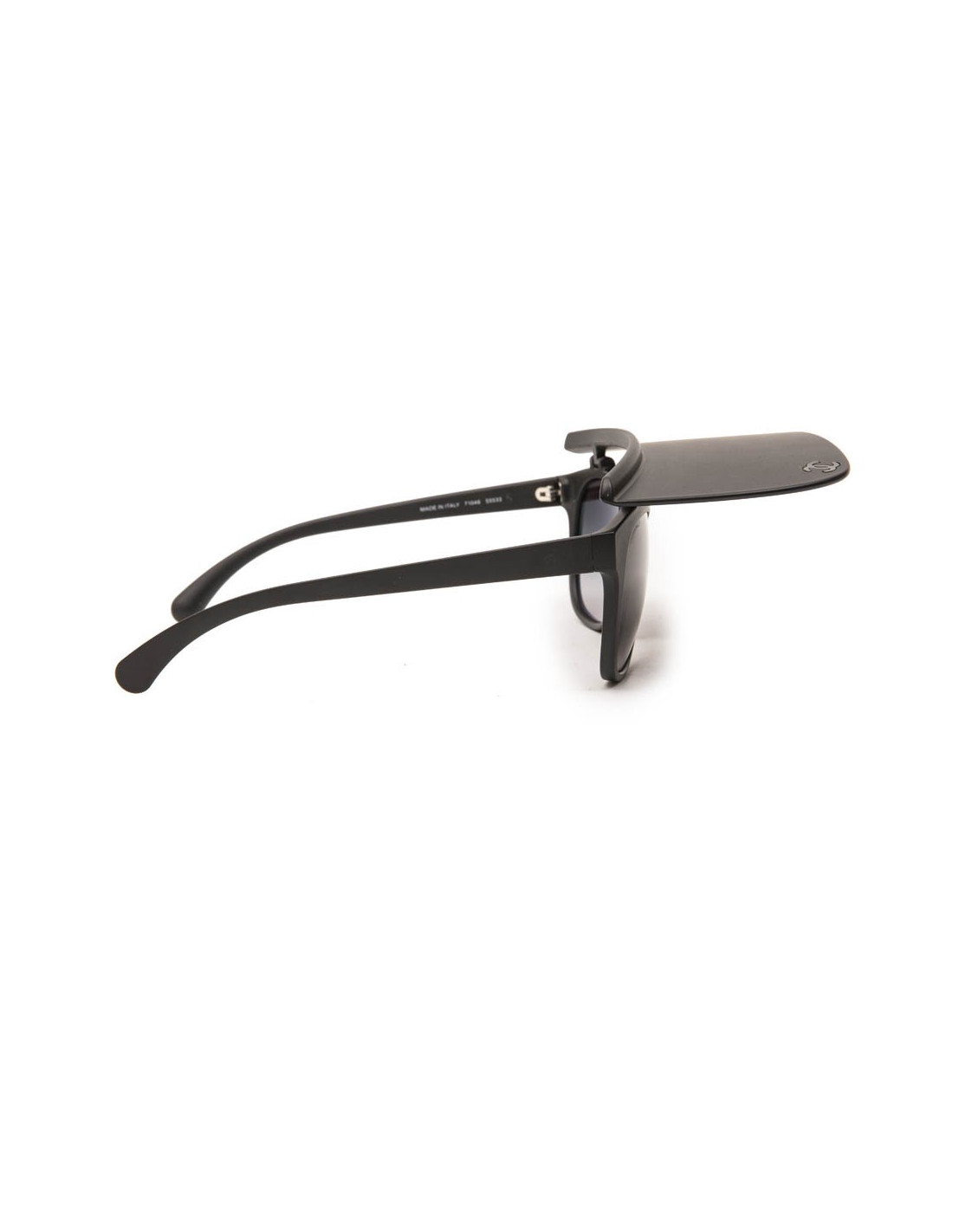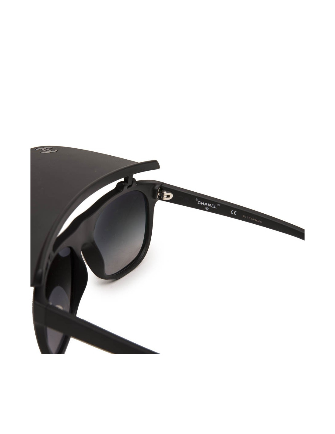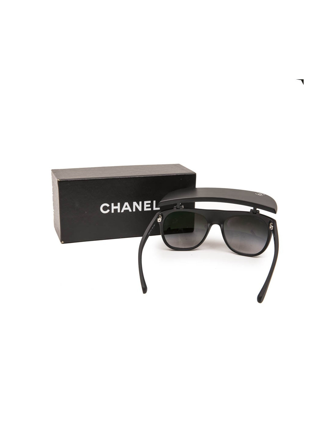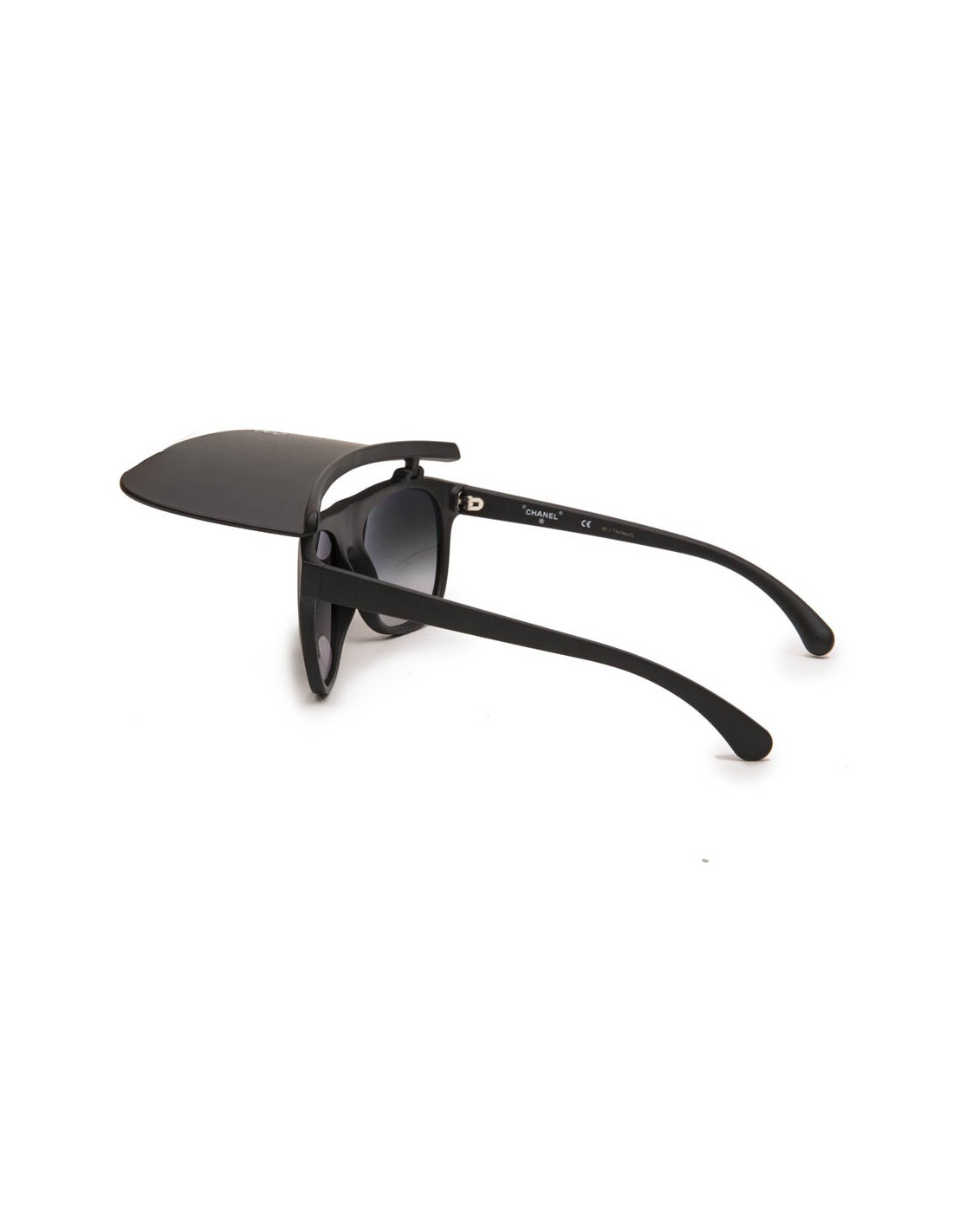 Lunettes de soleil Chanel en plastique noir mat avec visière pliante. Verres : dégradé de noir. Verres et monture en très bon état.