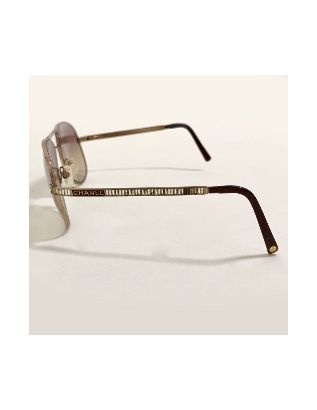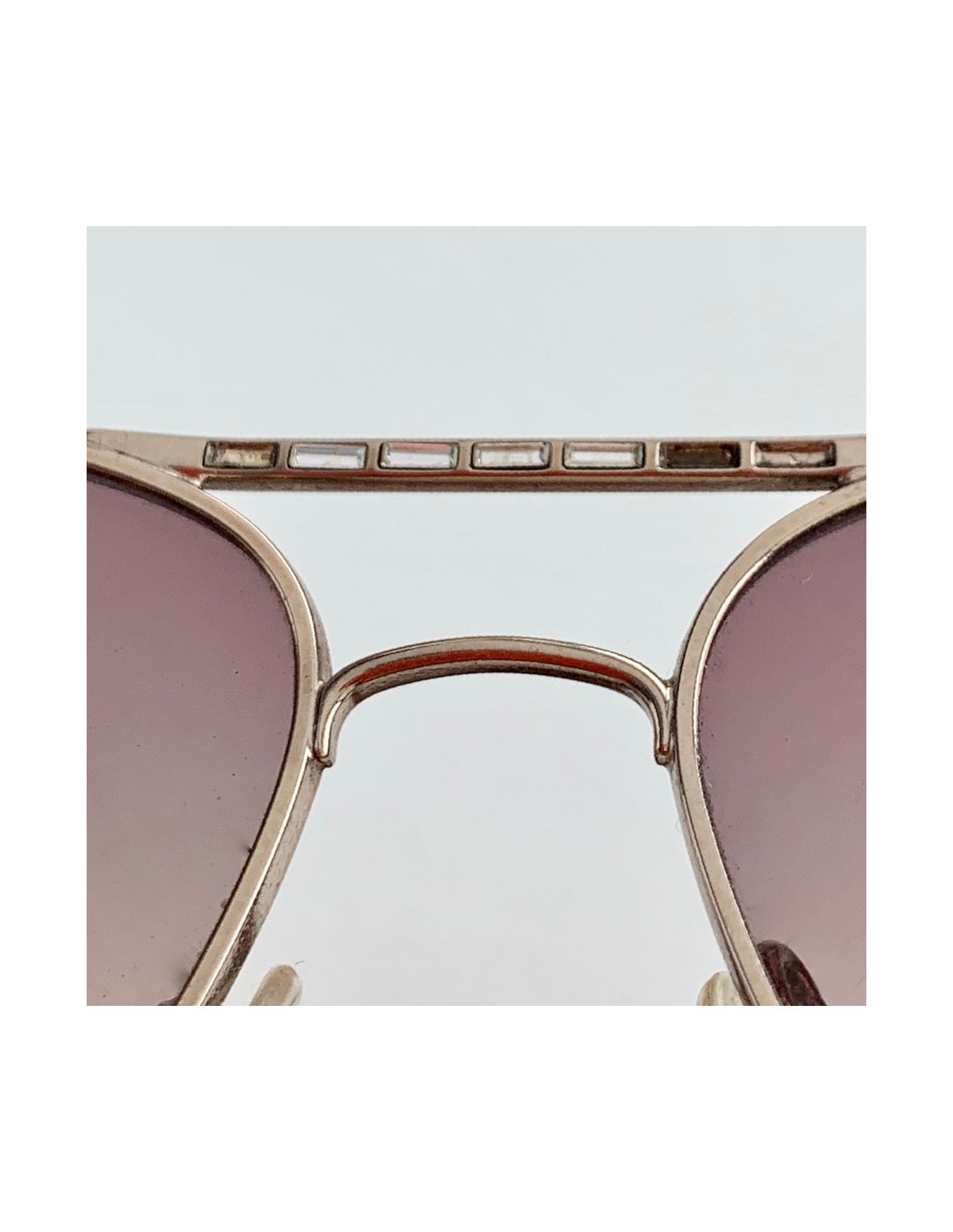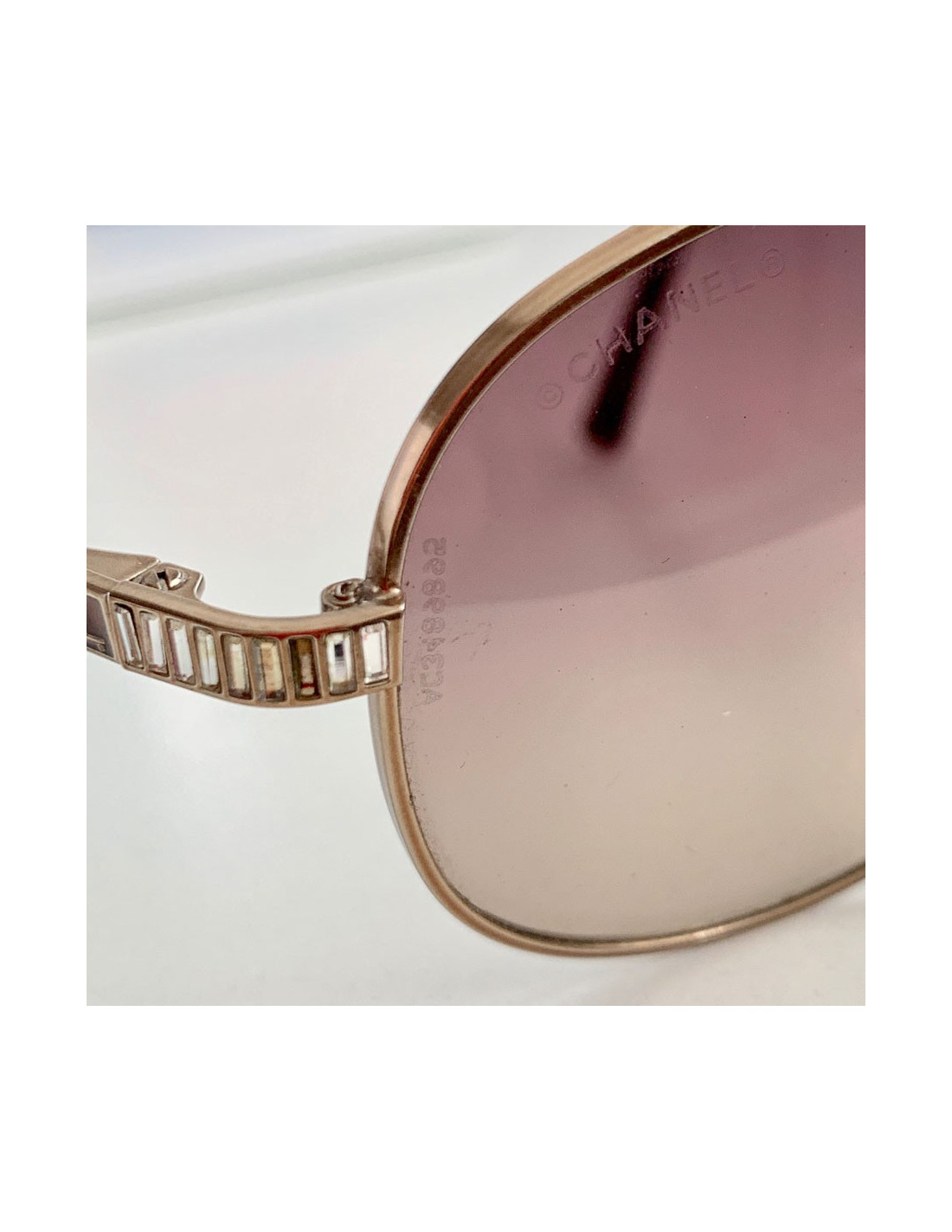 Détails : les branches et le dessus des verres sont sertis de cristaux baguettes blancs. La teinte des verres est un dégradé de marron. Il manque quelques cristaux sur les branches. Les verres sont en bon état. Quelques micro rayures d'usage.