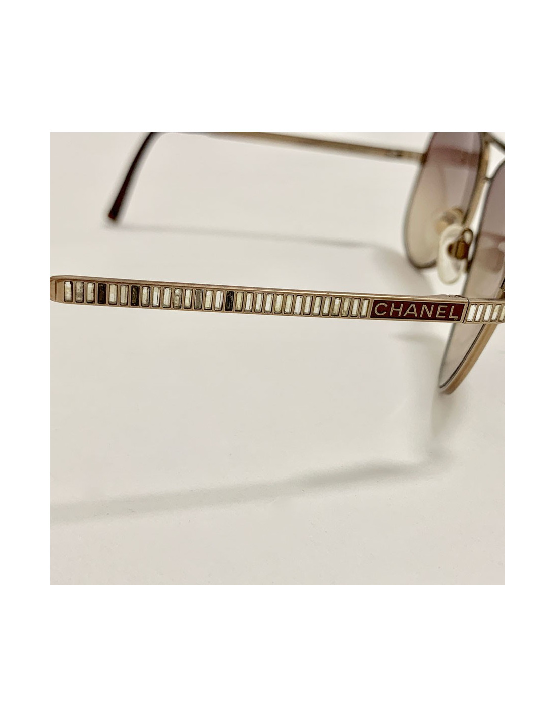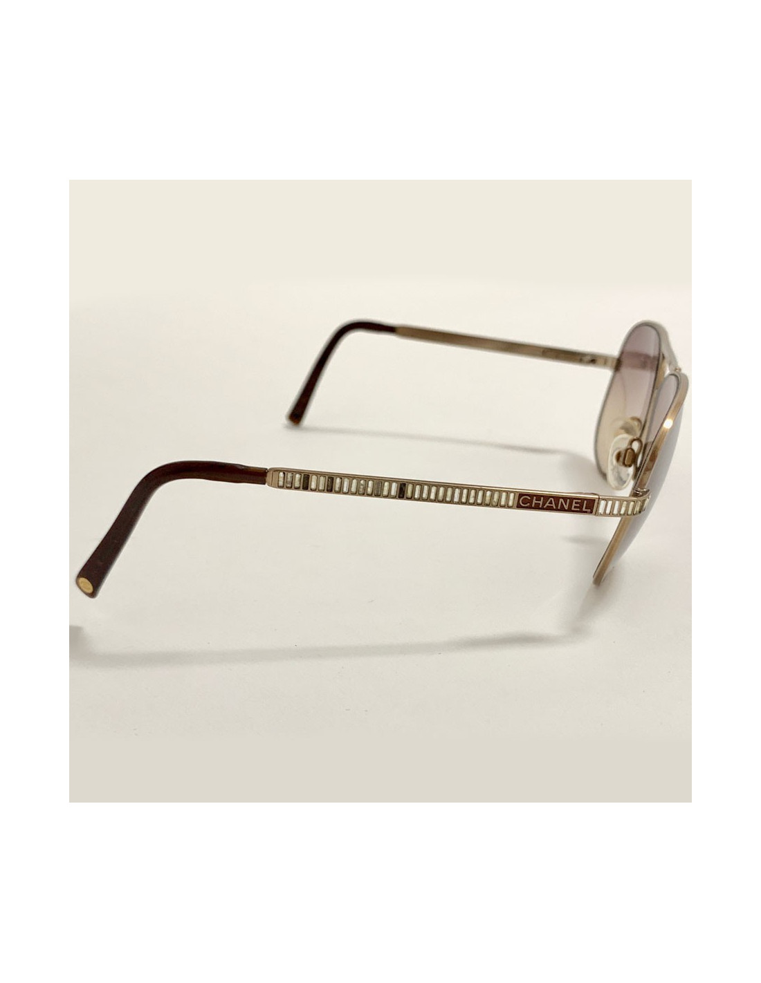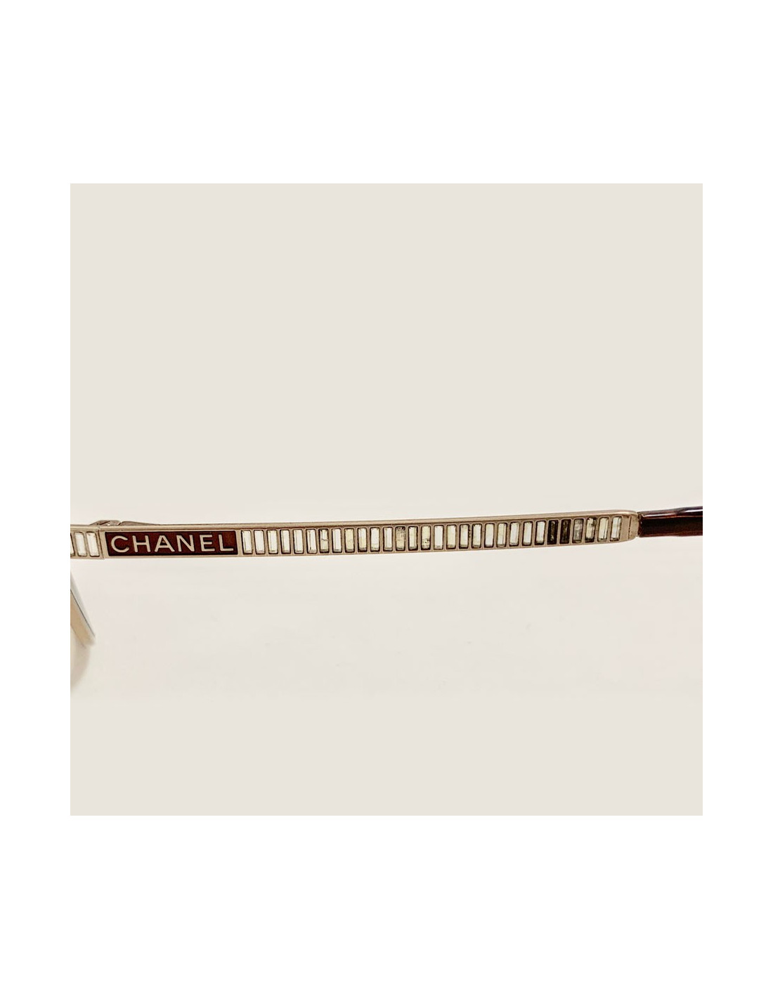 Détails : les branches et le dessus des verres sont sertis de cristaux baguettes blancs. La teinte des verres est un dégradé de marron. Il manque quelques cristaux sur les branches. Les verres sont en bon état. Quelques micro rayures d'usage.