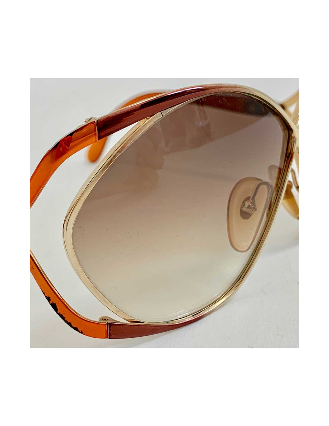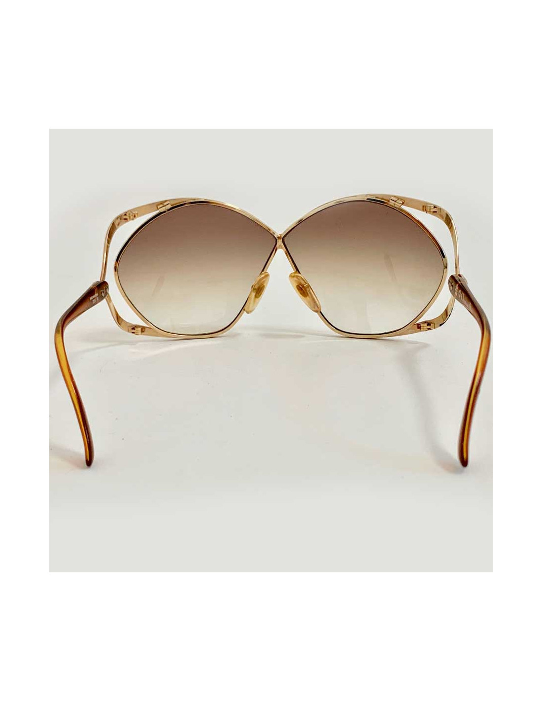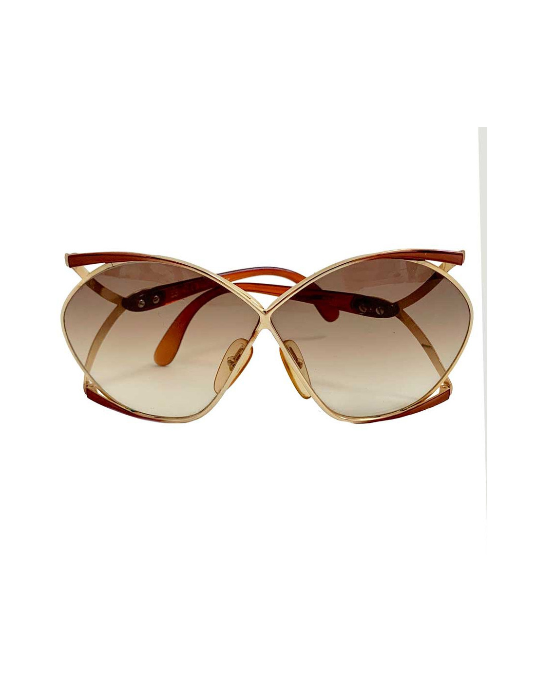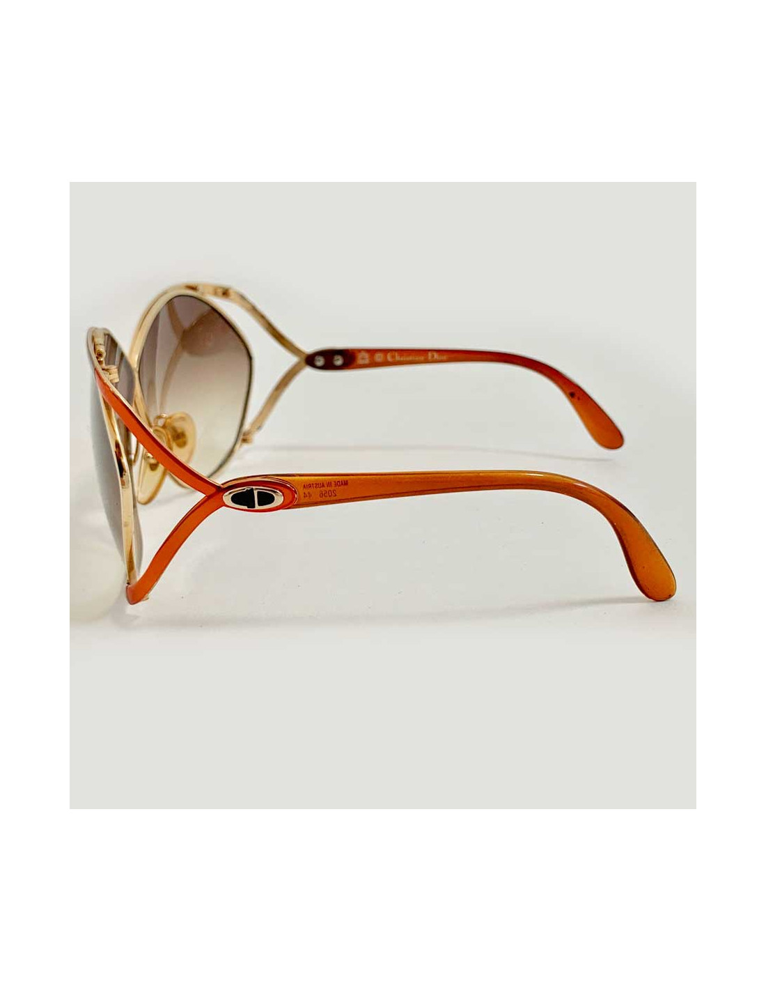 Vintage des années 70, superbe paire de lunettes oversize de la Maison CHRISTIAN DIOR. Modèle papillon, référence Optyl 2056. L'optyl de couleur ocre est le matériau des branches, matière plastique et légère qui s'adapte au visage de chacun. Le cadre est en métal de couleur or. Les initiales CD se situent au niveau des tempes. Les verres sont dans un dégradé de marron.