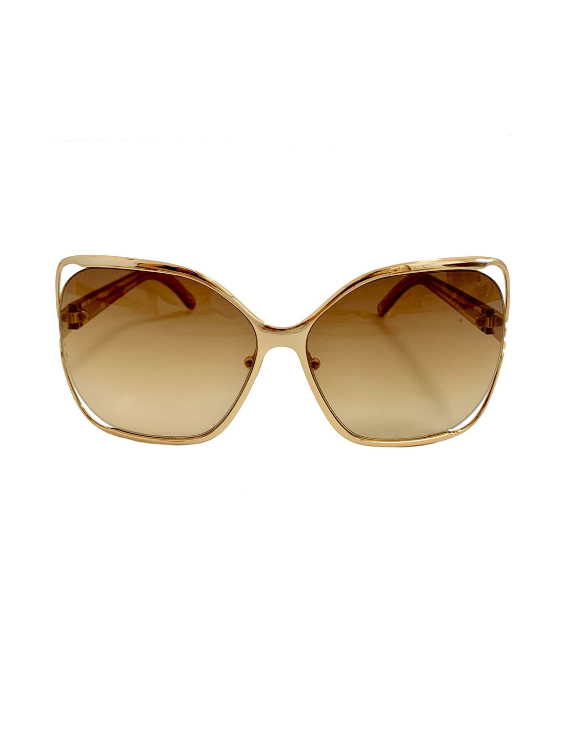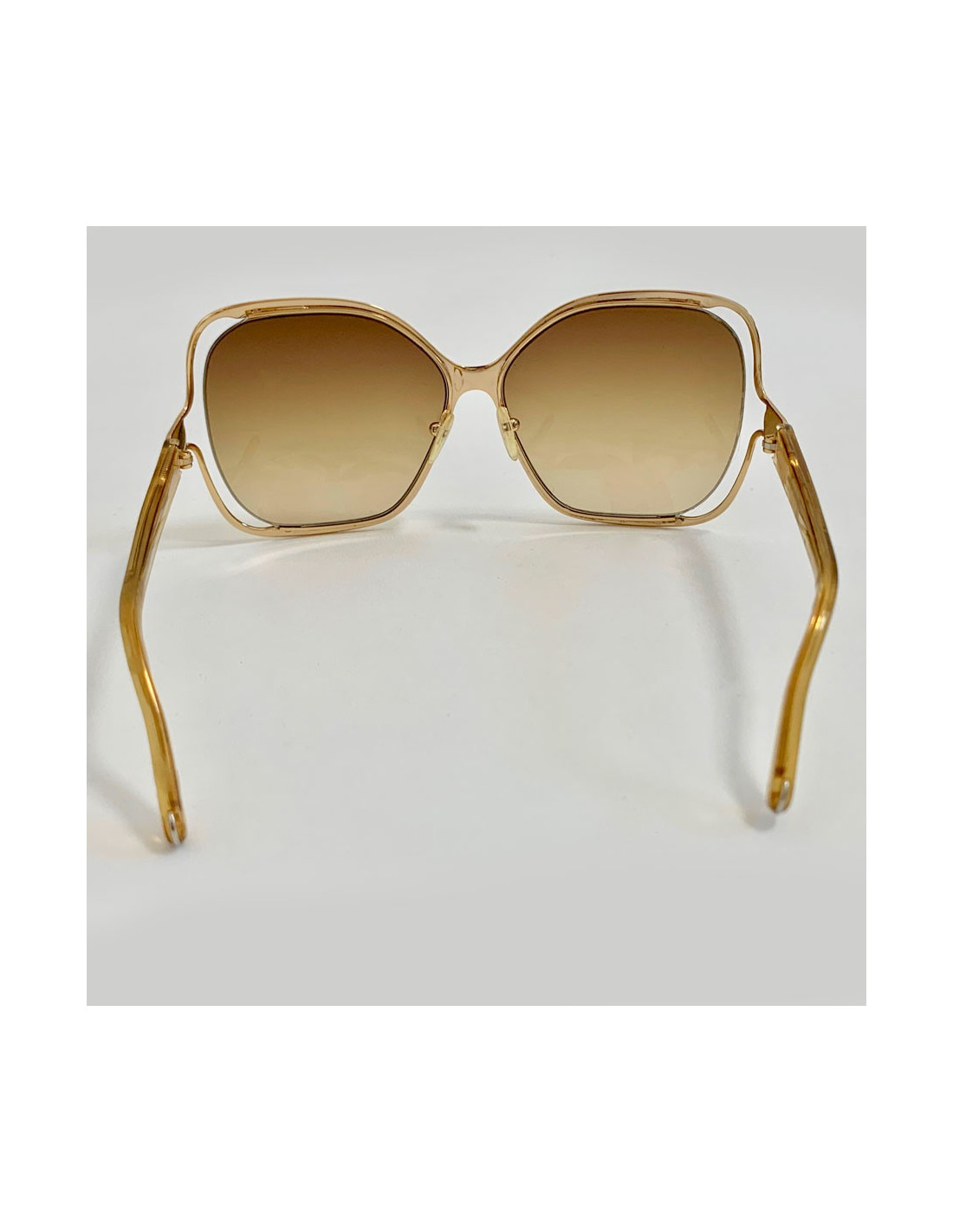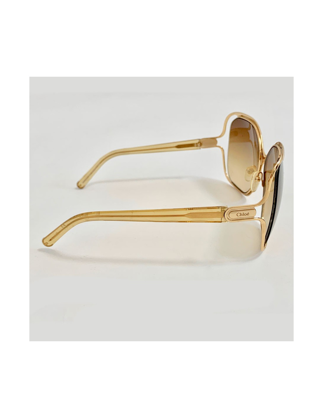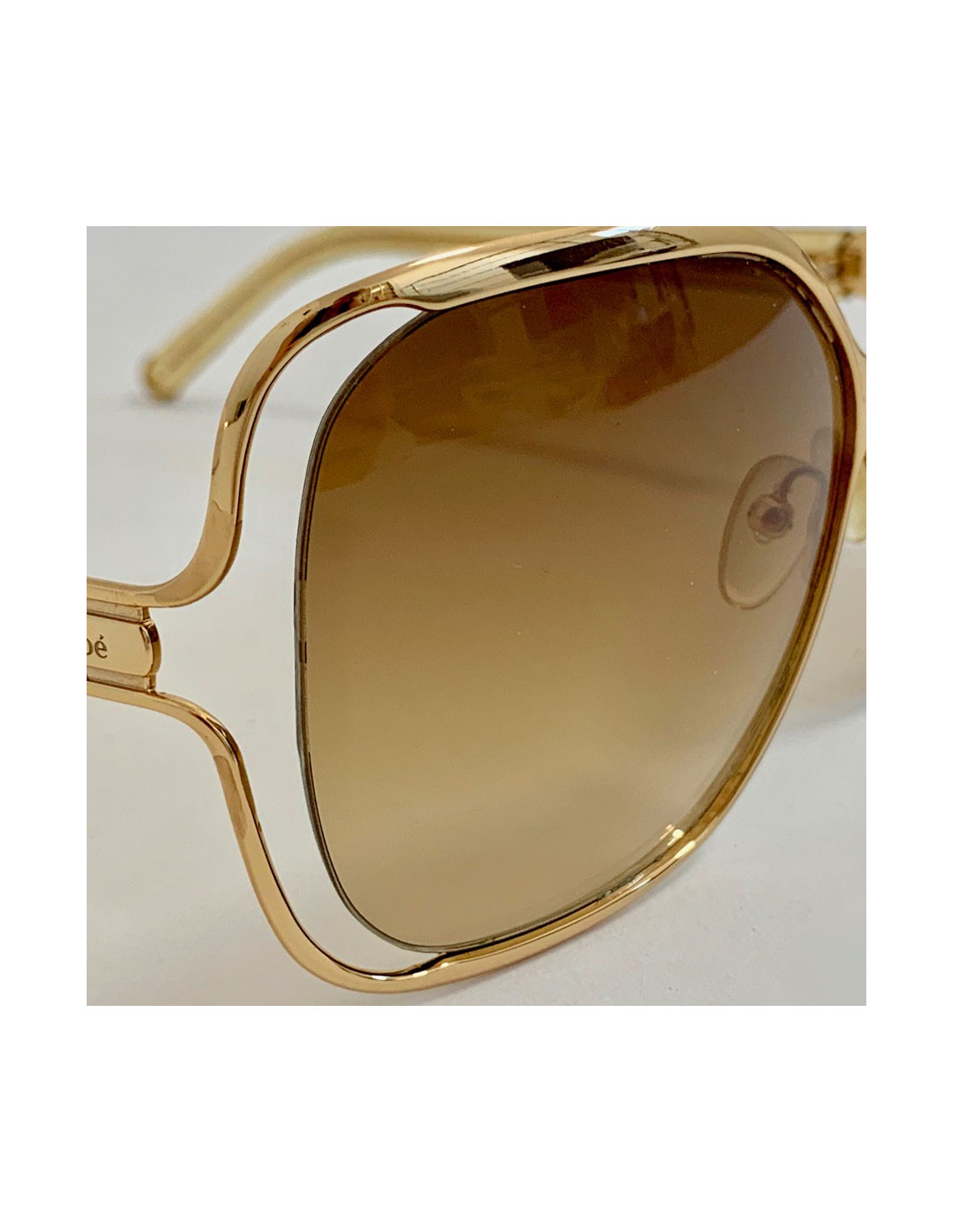 Modèle incontournable de la Maison CHLOE, lunettes de soleil oversize carrées CE108S taille 62/14. La monture est en plastique doré, les verres sont dans un dégradé de marron. Made in Italy.
