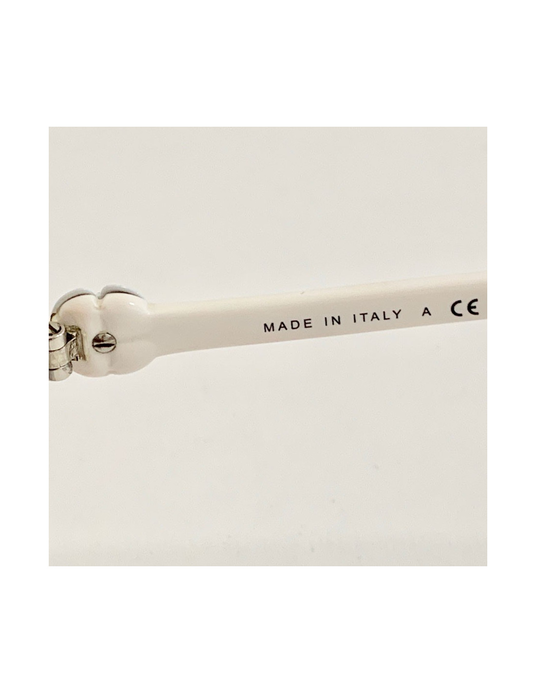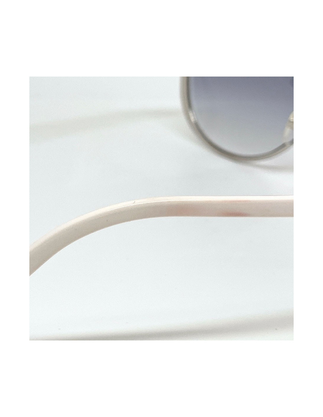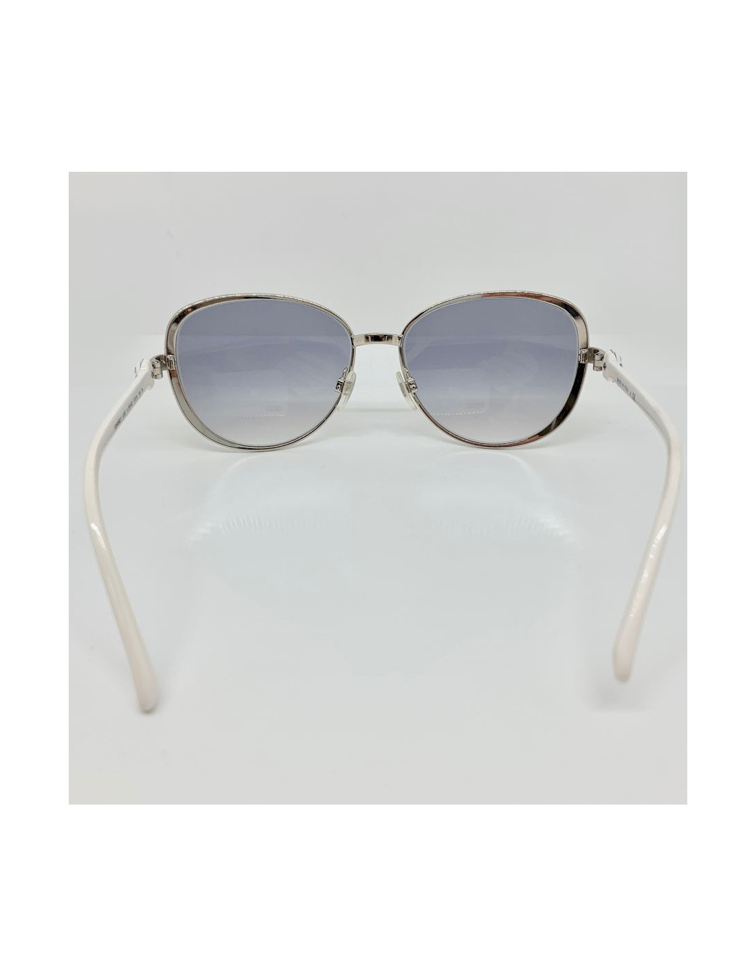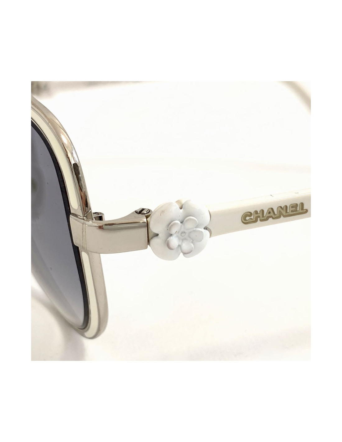 Elégante paire de lunettes de soleil Camélia CHANEL en métal argenté et blanc. Un camélia blanc se trouve sur chaque branche (voir photo). Les verres sont dans un dégradé de bleu.