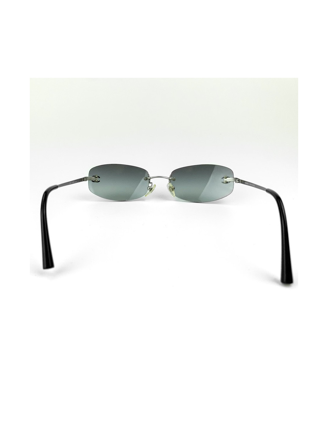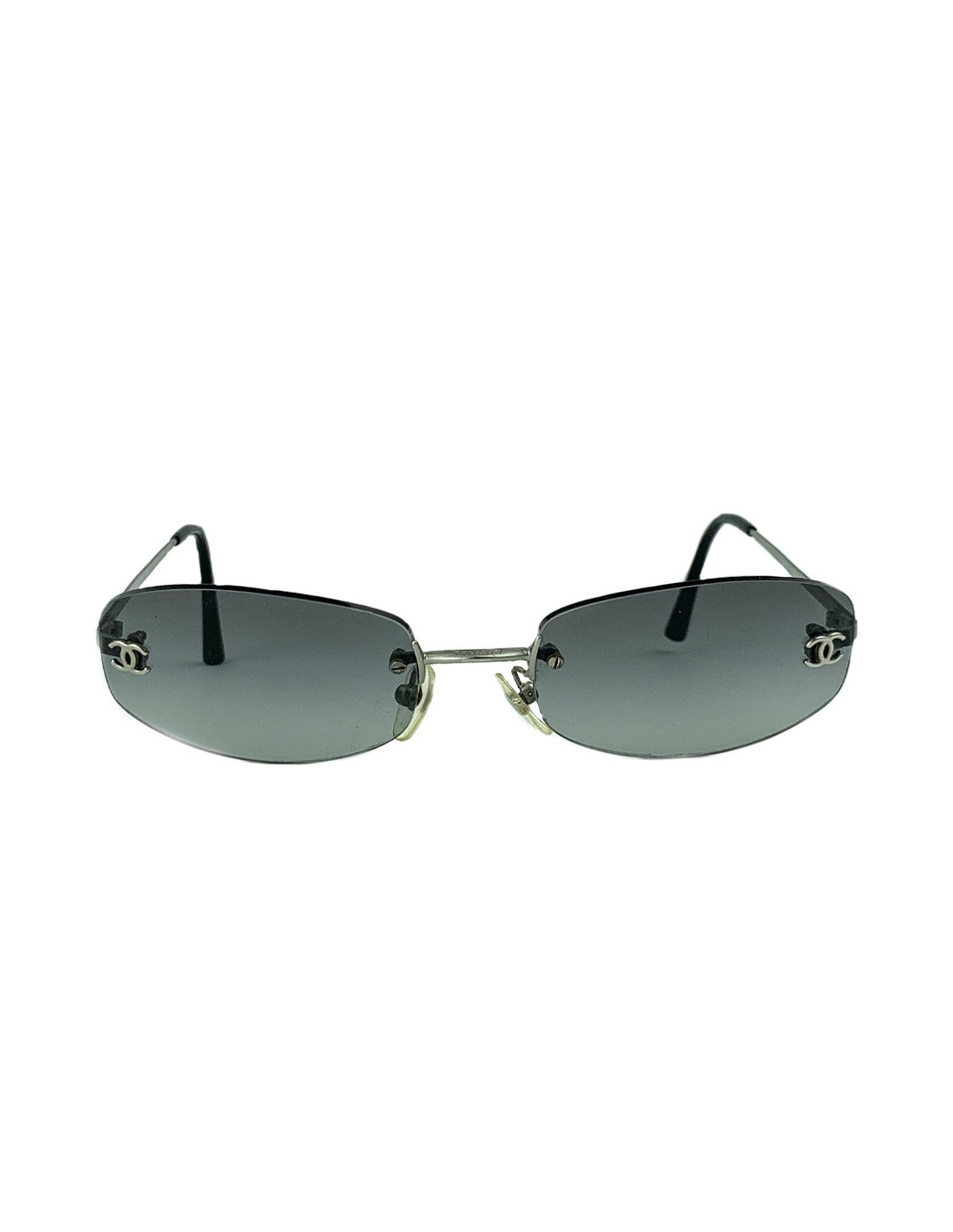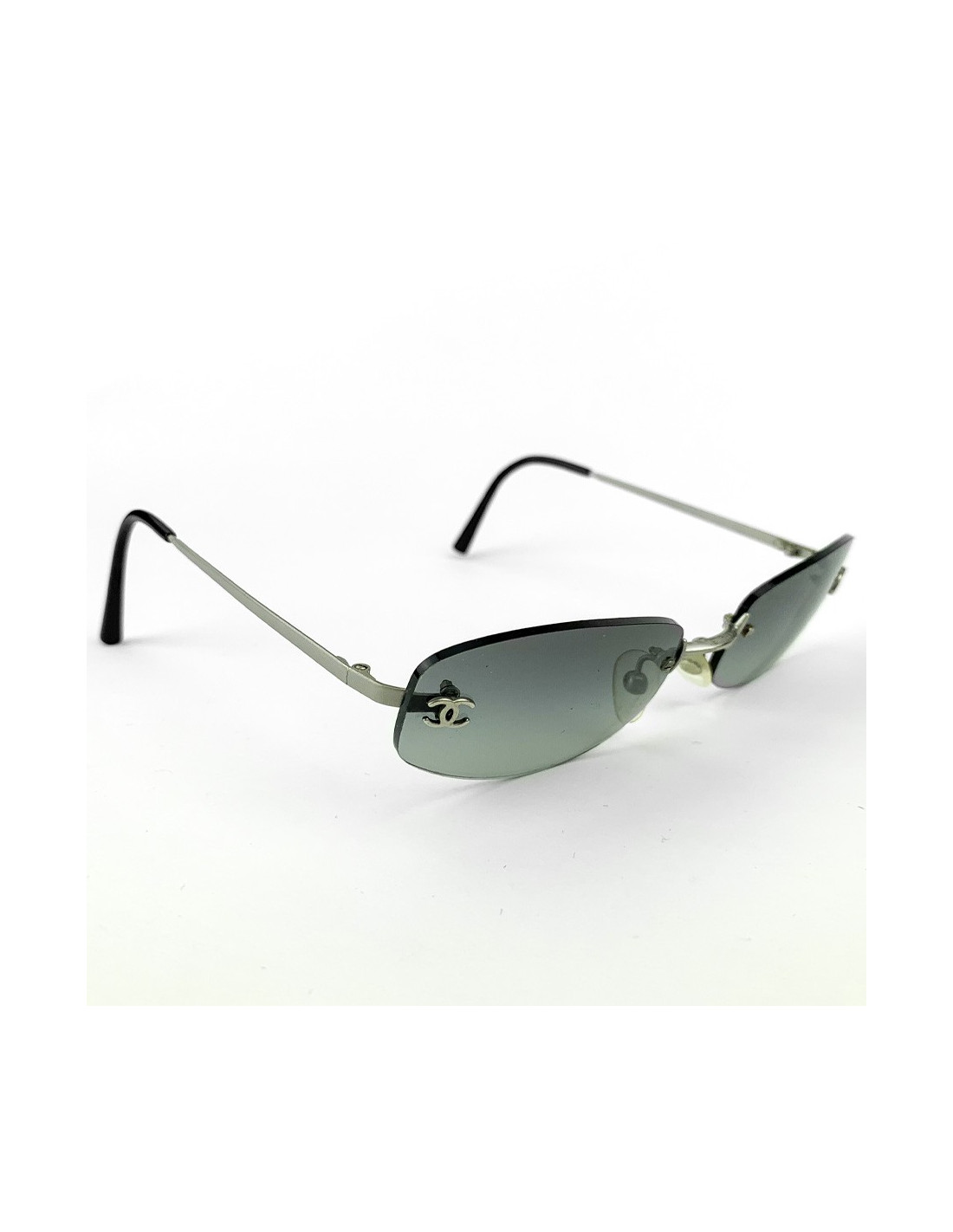 Les lunettes de soleil sont de la Maison CHANEL. Elles sont légères à porter, de forme ovale, les verres gris, et l'armature en métal argenté mat. Chaque verre comporte le CC argent mat de la marque.