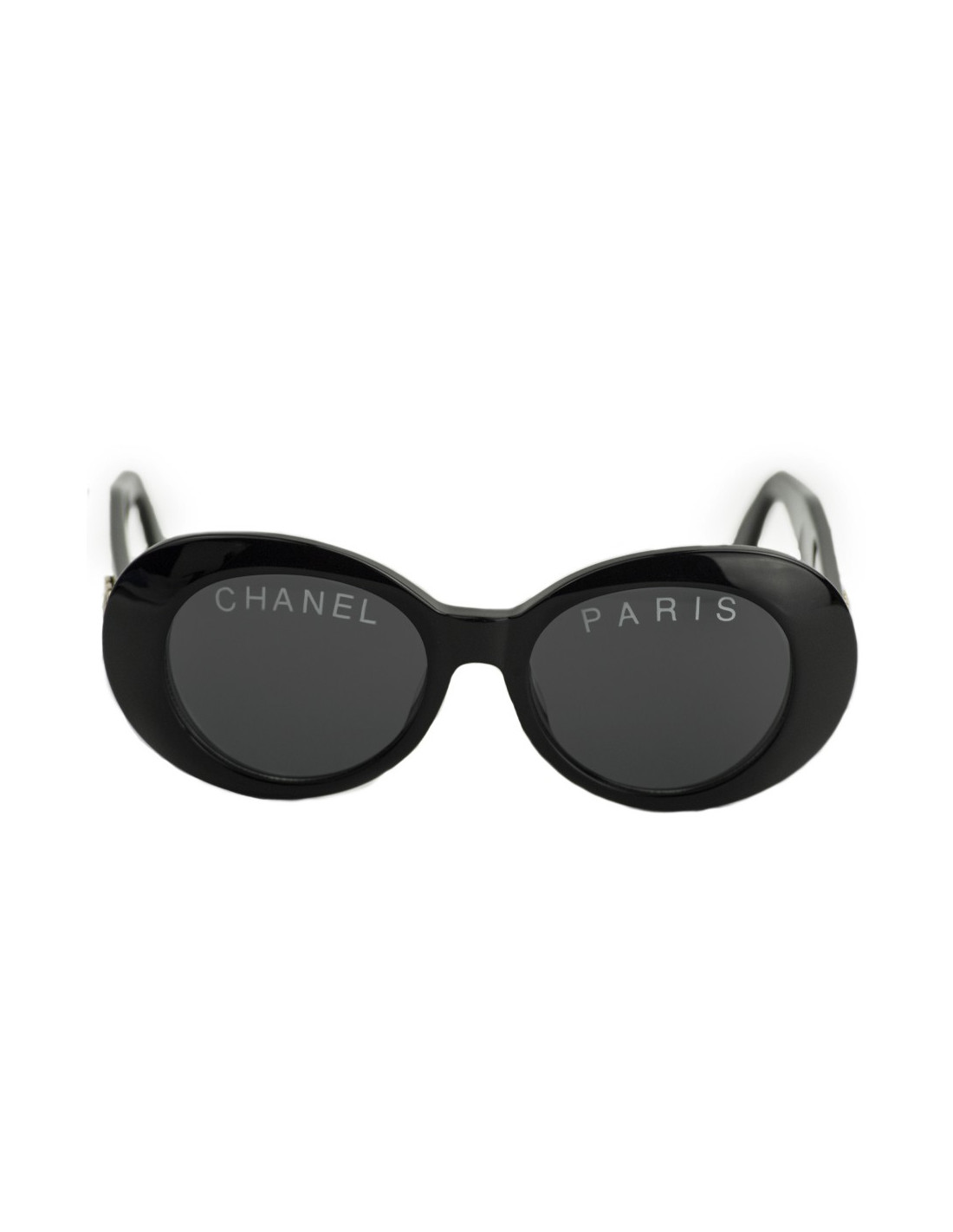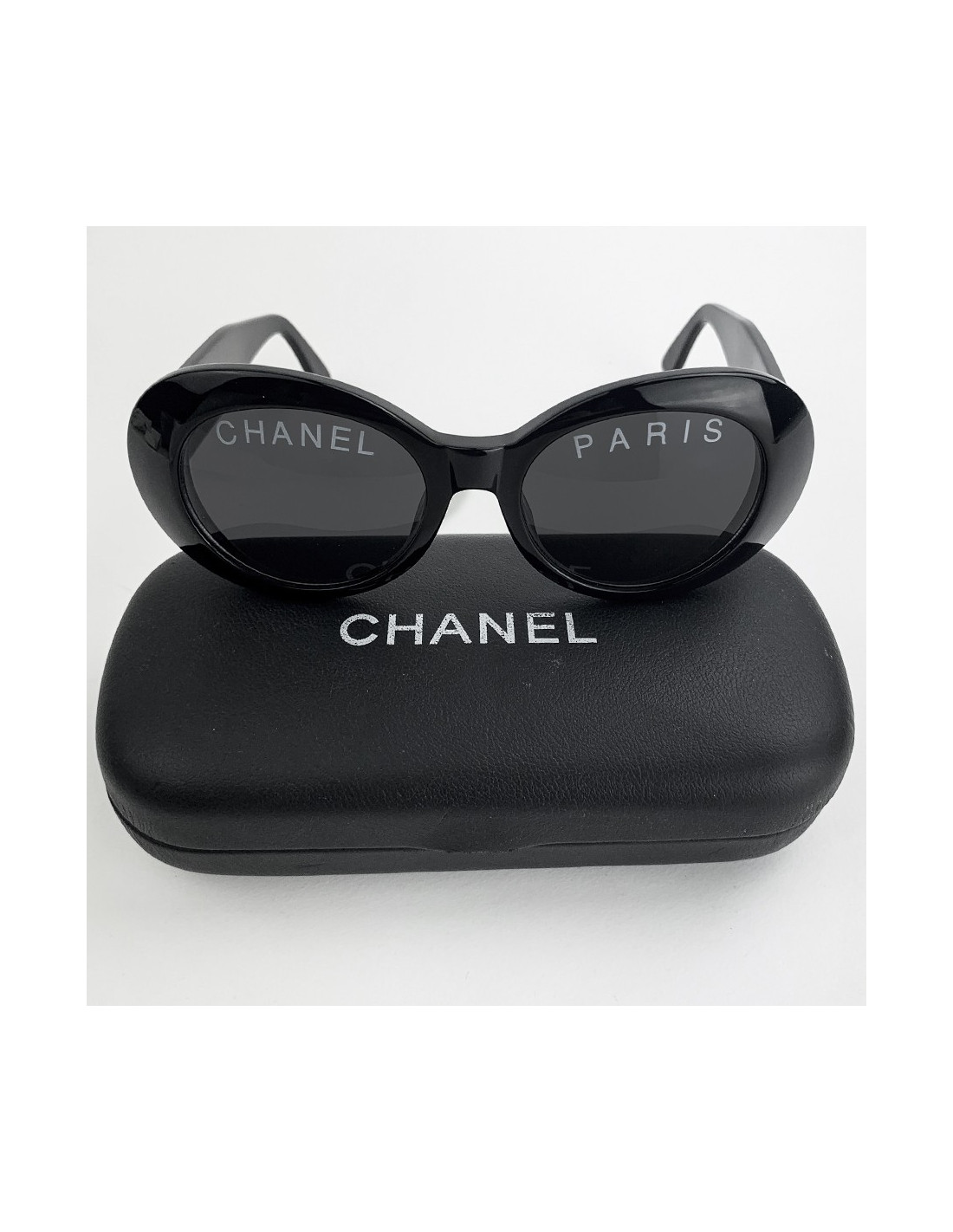 Les lunettes de soleil sont de la maison CHANEL. Elles sont de forme ovale, de couleur noire, un verre comportant l'inscription CHANEL, l'autre l'inscription PARIS. Chaque branche comporte le double C de la marque en métal doré.