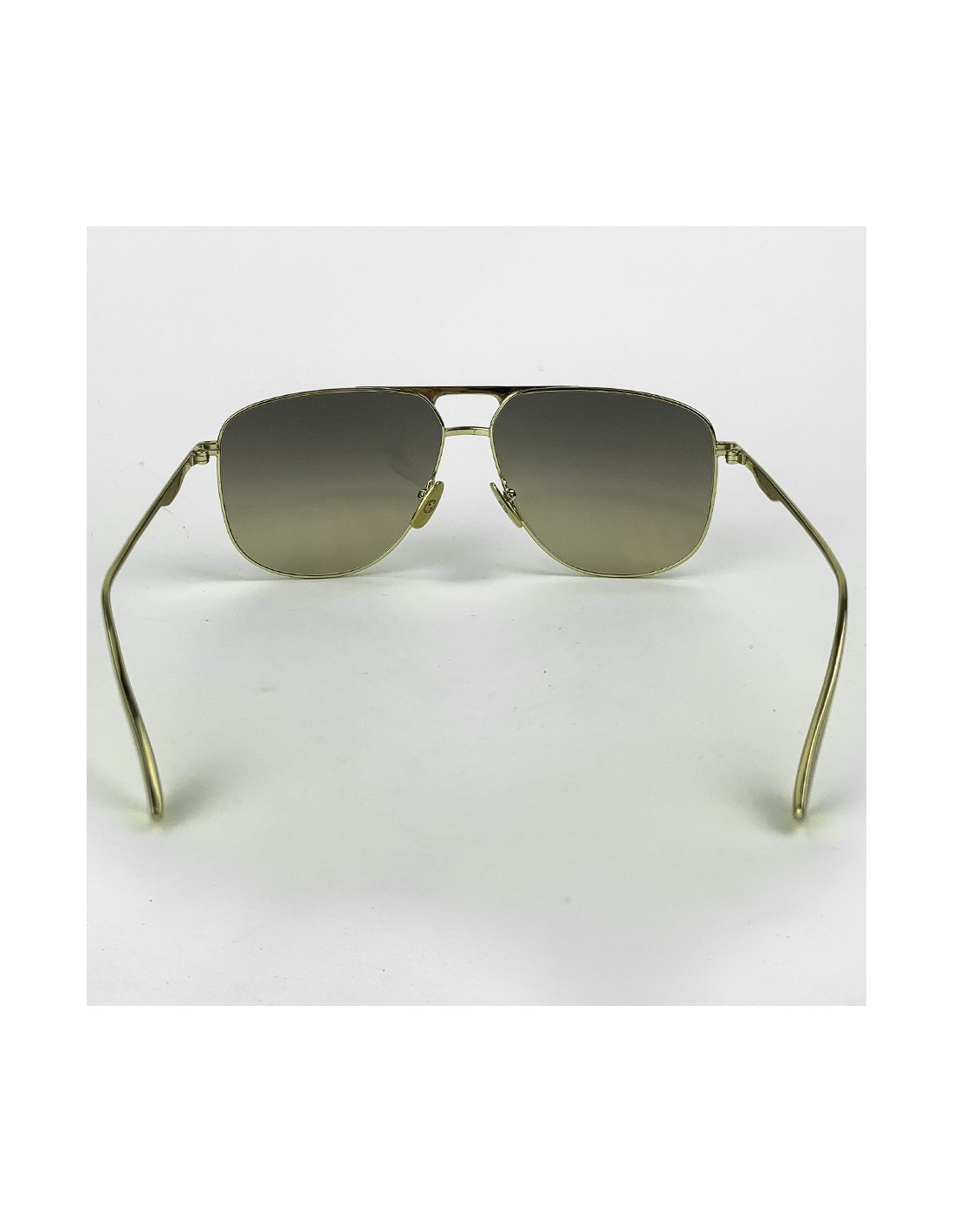 Les lunettes sont de la Maison GUCCI. La monture est en métal doré et les verres sont bruns clairs. La forme ressemble à une monture aviateur classique mais diffère ici avec un ovale beaucoup plus arrondie sur le bas.