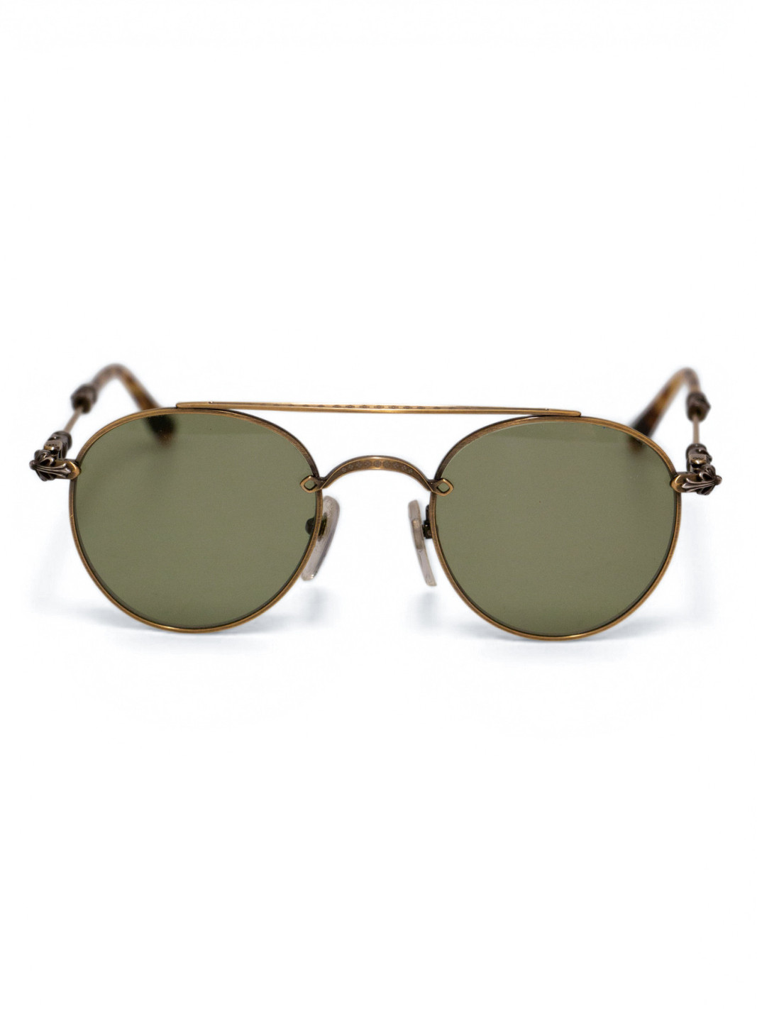 Charme intemporel avec ces lunettes de soleil Chrome Hearts vintage rondes à double pont. Fabriquées au Japon, elles garantissent une qualité et une précision exceptionnelles. La monture en métal doré antique, subtilement patinée, dégage une élégance raffinée, tandis que le double pont ajoute un caractère classique aux verres ronds teintés de vert, offrant à la fois style et protection solaire. Les branches sont finement décorées de détails sculptés, témoignant d’un savoir-faire minutieux, et se terminent par des embouts en écaille de tortue pour un confort optimal. Présentées en excellent état, avec une légère patine qui accentue leur authenticité, ces lunettes sont un véritable accessoire de luxe à porter.