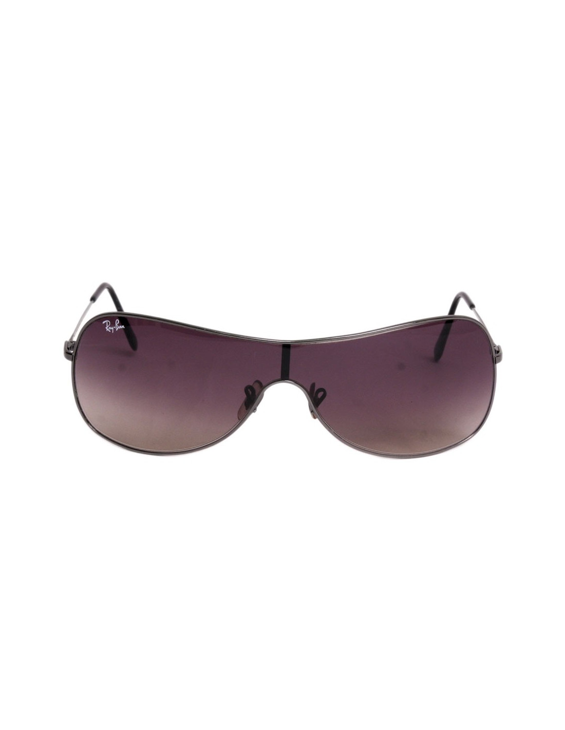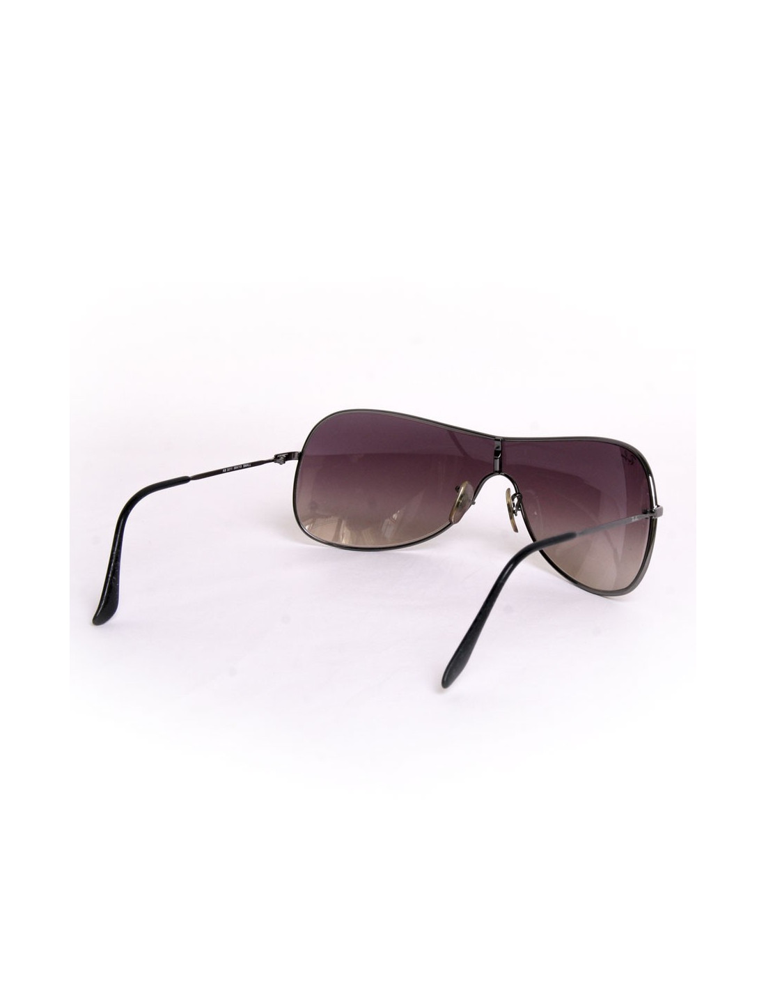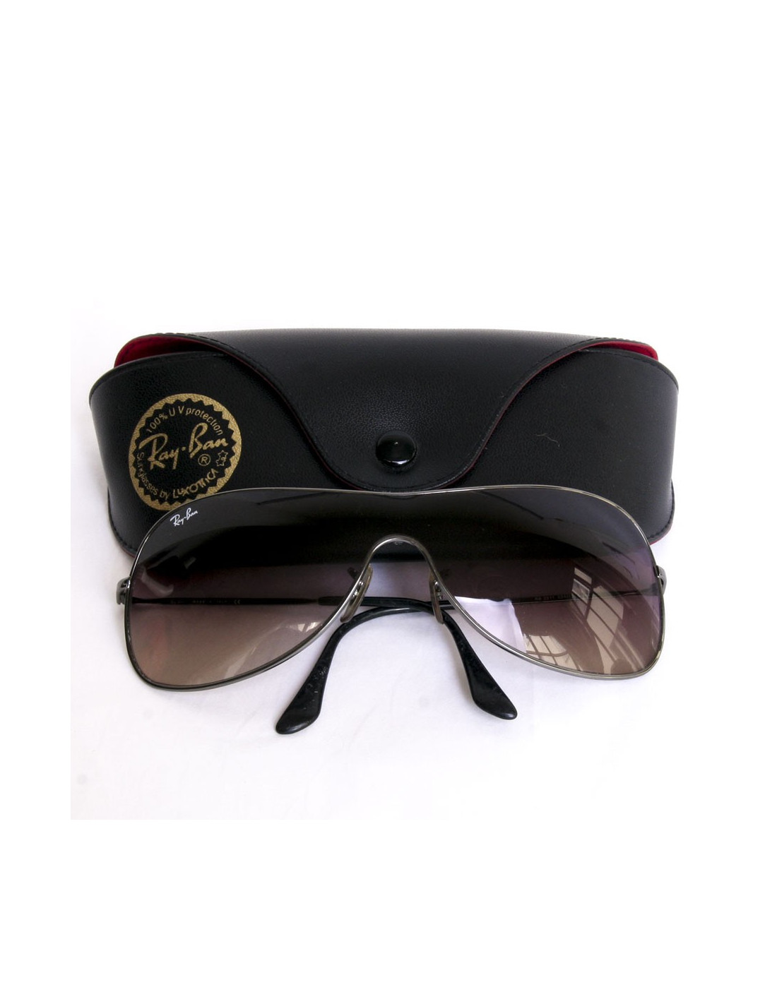 Lunettes de soleil Ray Ban, la monture est en métal de couleur ruthénium et les verres sont teintés de couleur marron. Les branches de la partie plastifiée sont abimées.