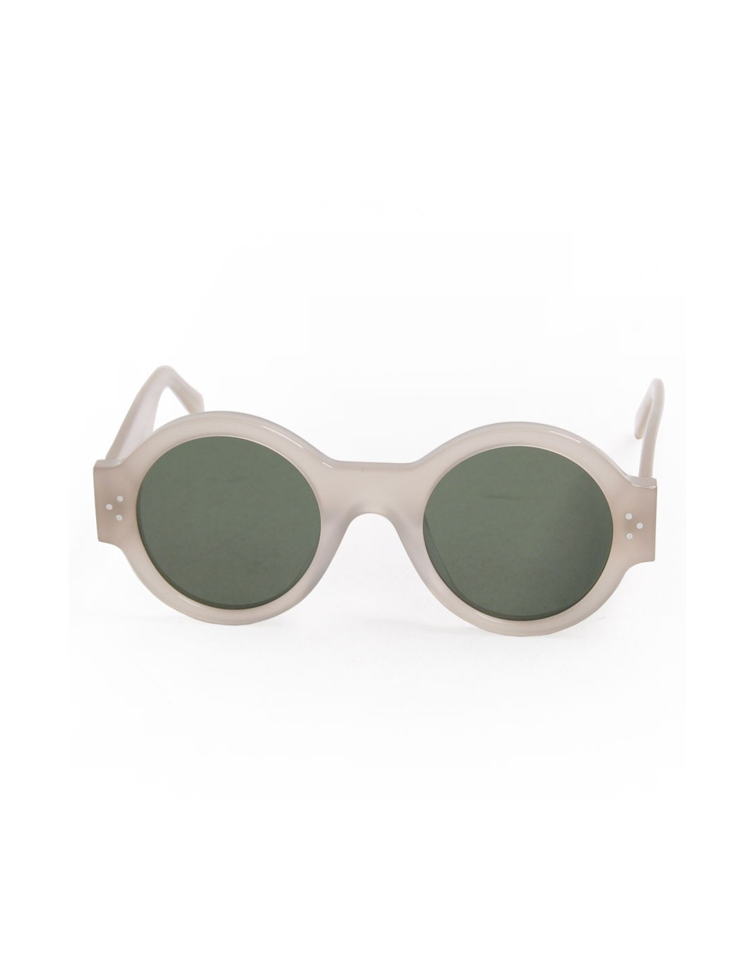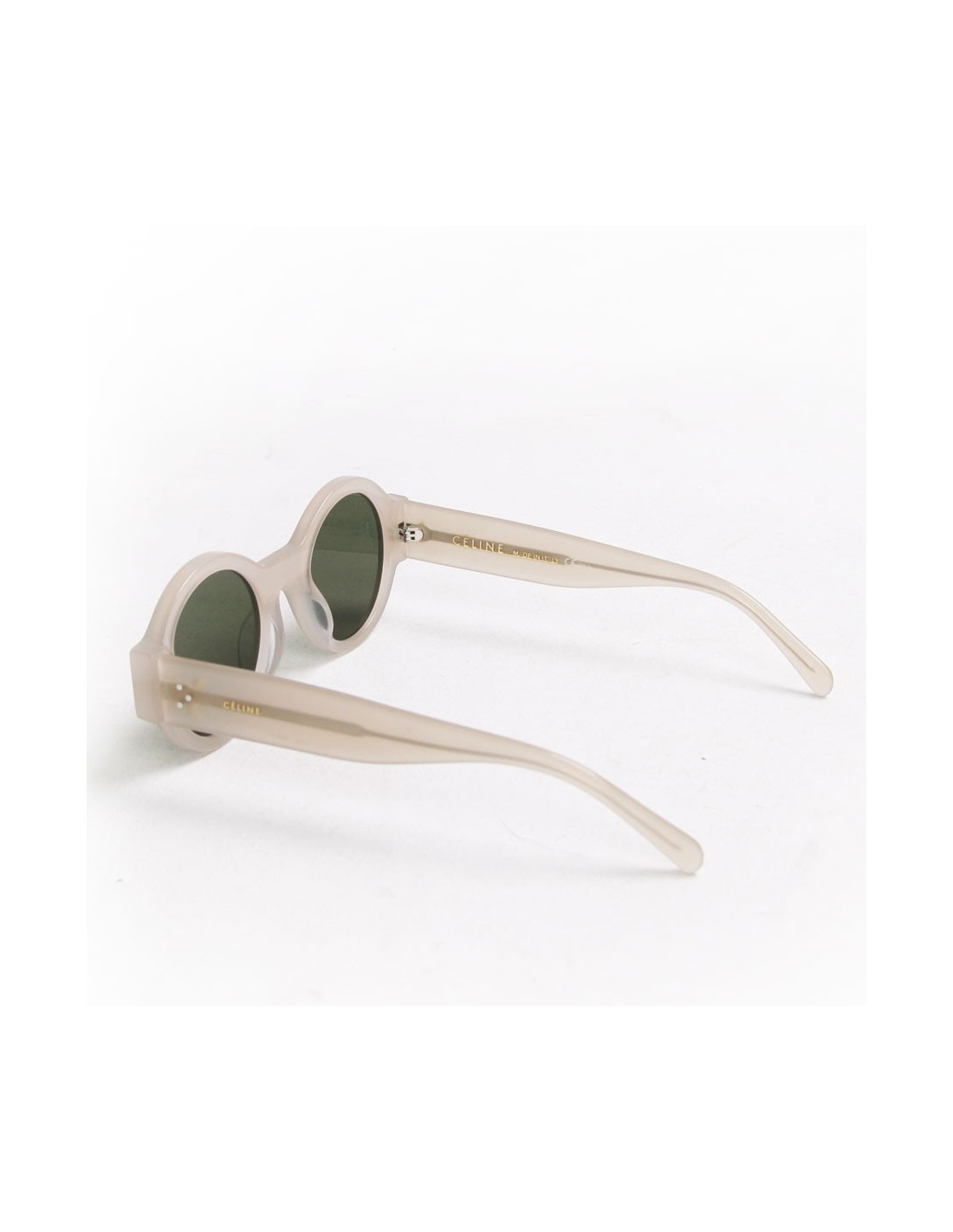 Lunettes de soleil rondes Céline, les lunettes sont en acétate matière noble, de couleur mat antique rose/gris, la teinte des verres est noire. En très bon état. Prix public 250 euros. diamètre des verres: 4.2cm, la largeur de la monture est de 13.5cm, la longueur des branches: 15cm
