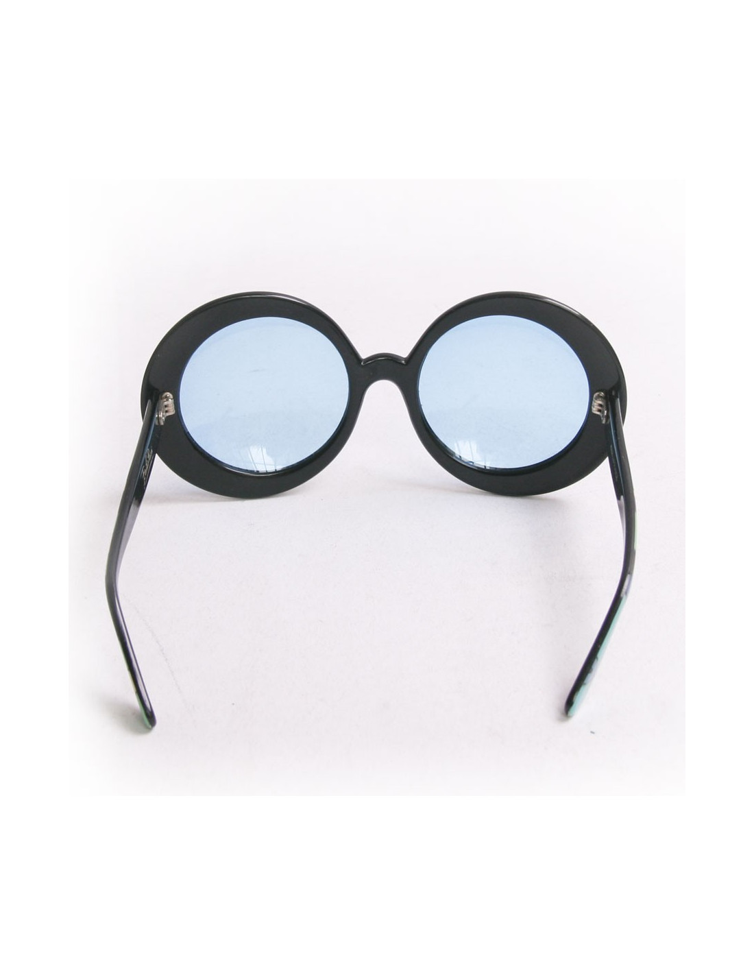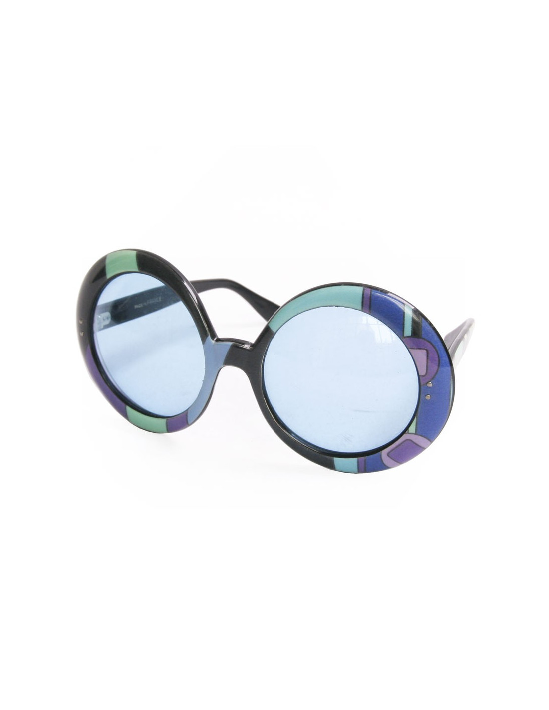 Emilio Pucci a créé ces lunettes dans les années 60 ! Il était célèbre pour ses imprimés géométriques et ses couleurs vives. Très Vintage, Lunettes de soleil rondes , dont les couleurs sont bleues, turquoises et violettes, la teinte des verres incurvés, est de couleur : bleu saphir. Elles ont des micro rayures. En bon état. Made in France.