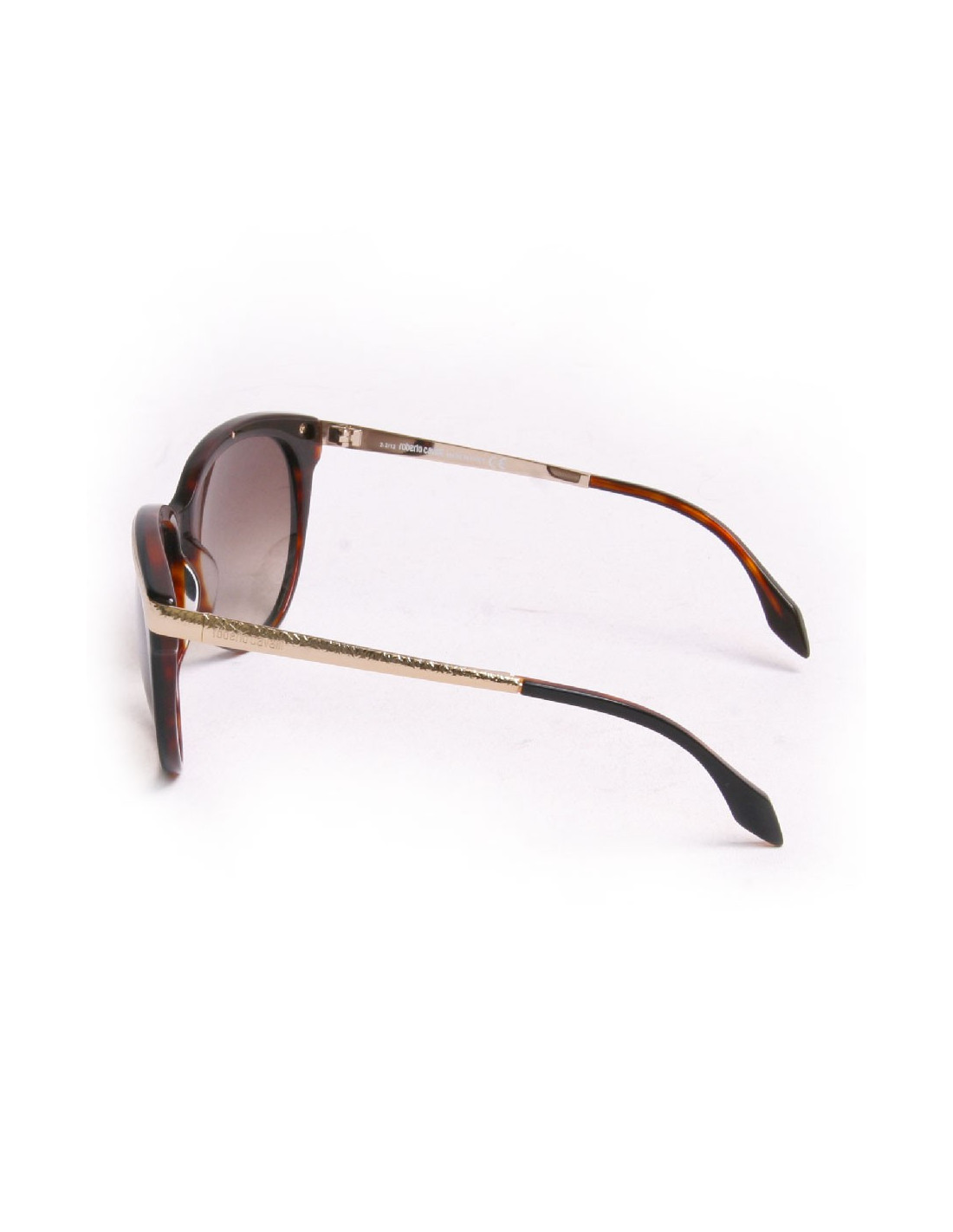 Lunettes de soleil ROBERTO CAVALLILunettes de soleil Roberto Cavalli, verres et cercles de couleur noire, l'intérieur est de couleur marron glacé, les demi- branches sont de couleur dorée. Des micros rayures sont présentent sur les verres. Très bon état.