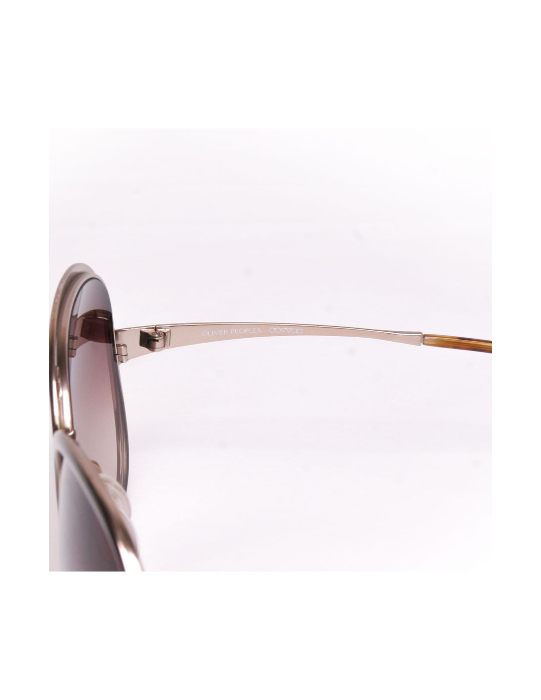 Paire de lunettes de soleil larges Oliver Peoples, la monture et les verres sont de couleur marron. Le métal est doré légèrement rosé. Elles sont en très bon état (deux micro traces blanches en bas à l'intérieur des verres)