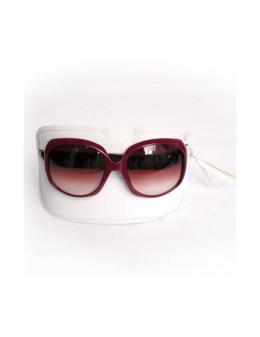 Flamboyante paire de lunettes de soleil Dior, la monture et les verres son teintés d'une somptueuse couleur framboise, l'inscription Dior est présente sur chaque branche des lunettes.