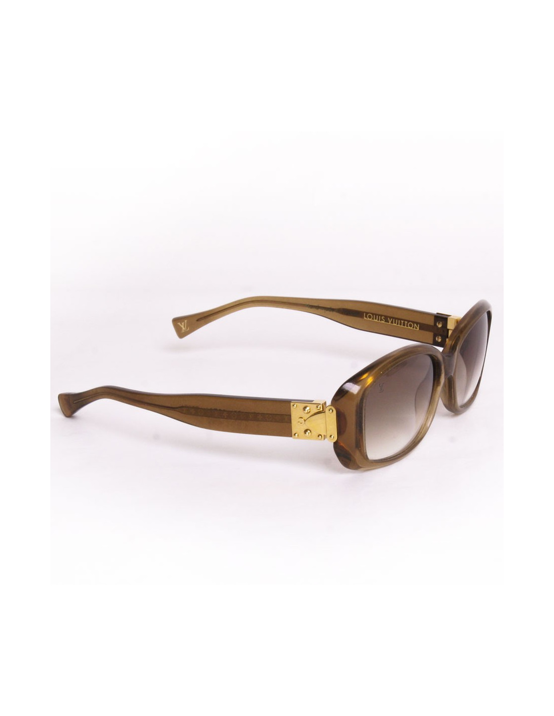 Paire de lunettes de soleil Louis Vuitton, la monture est de couleur jaune or avec incrustations de paillettes, les verres sont claires, très beau détail du logo Louis Vuitton sur les branches. Les parties sont en métal dorées à l'or fin - Prix public aux environs de 450 euros.