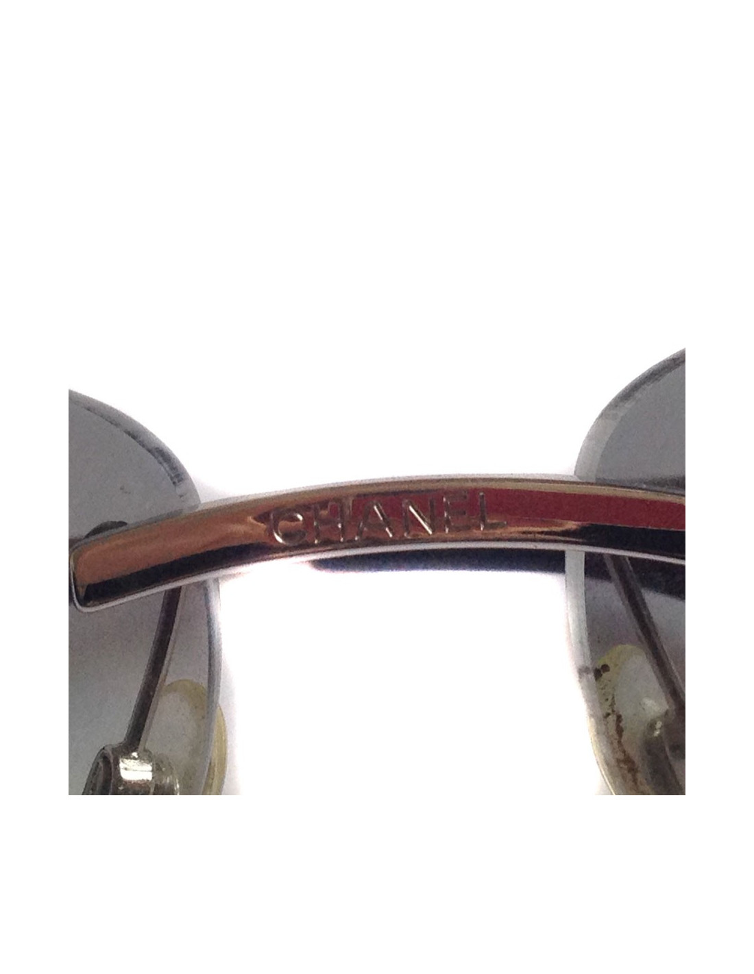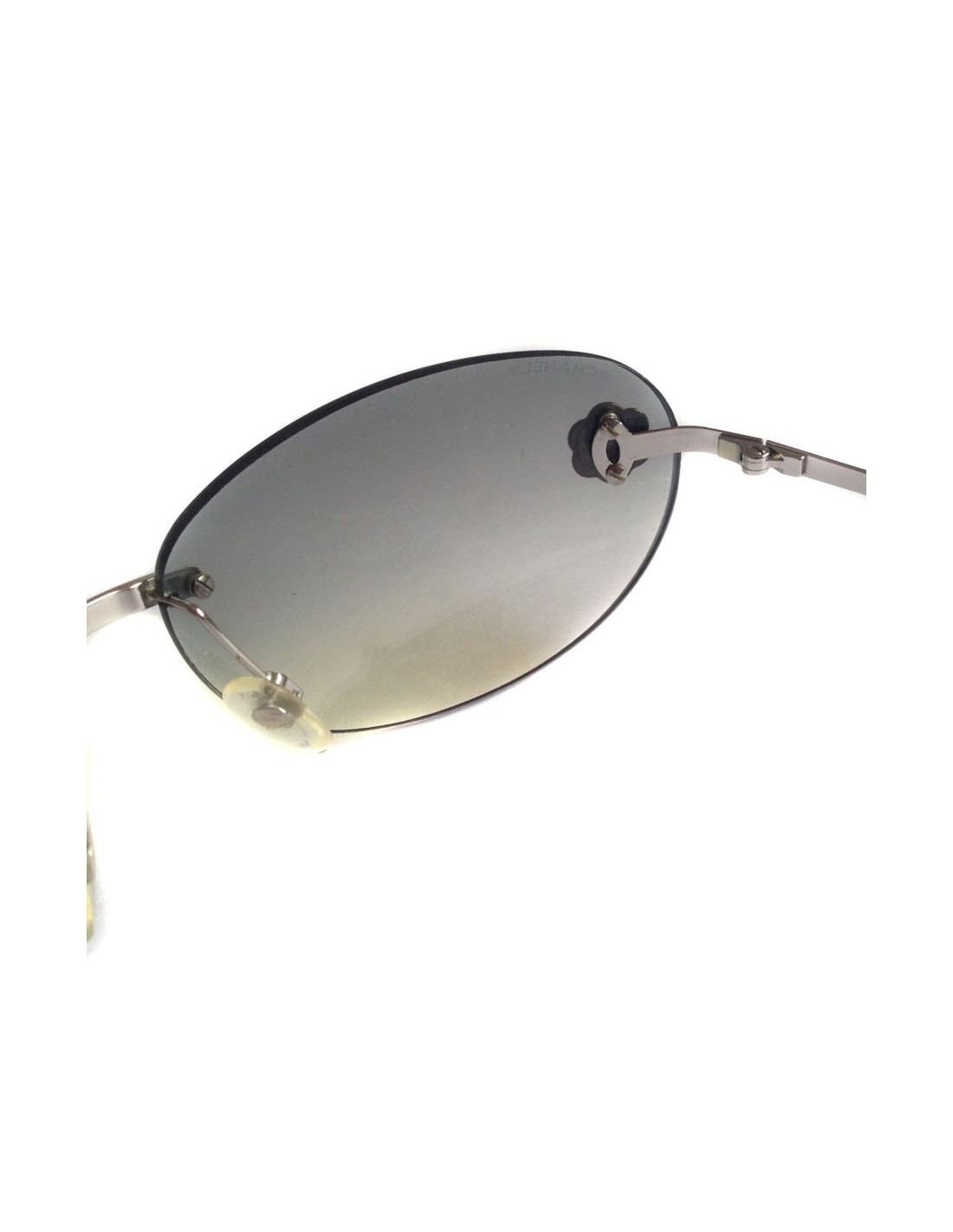 Très belle paire de lunettes de soleil Chanel. Les verres sont dans un dégradé de gris, les branches sont en métal argenté, de chaque côté des lunettes un petit camélia.