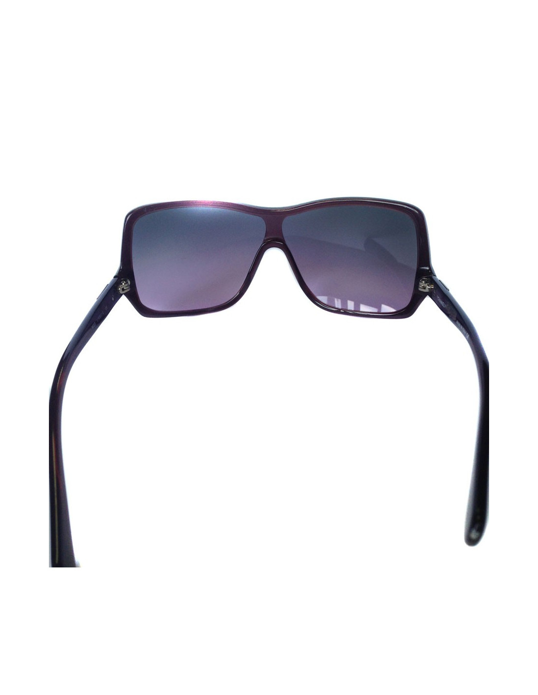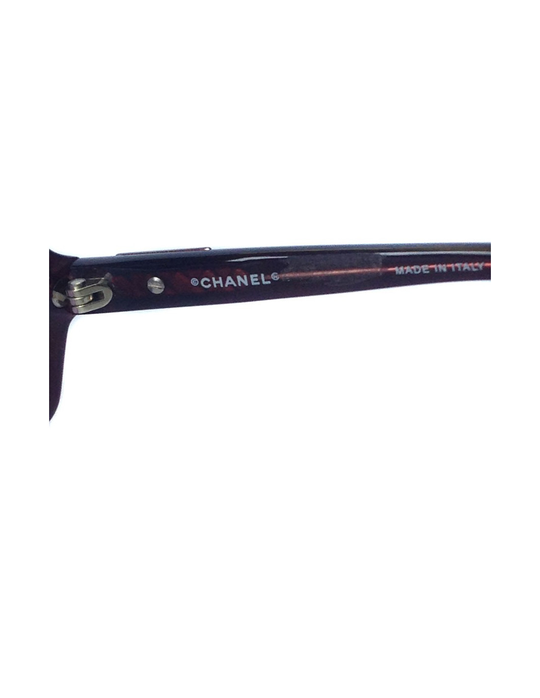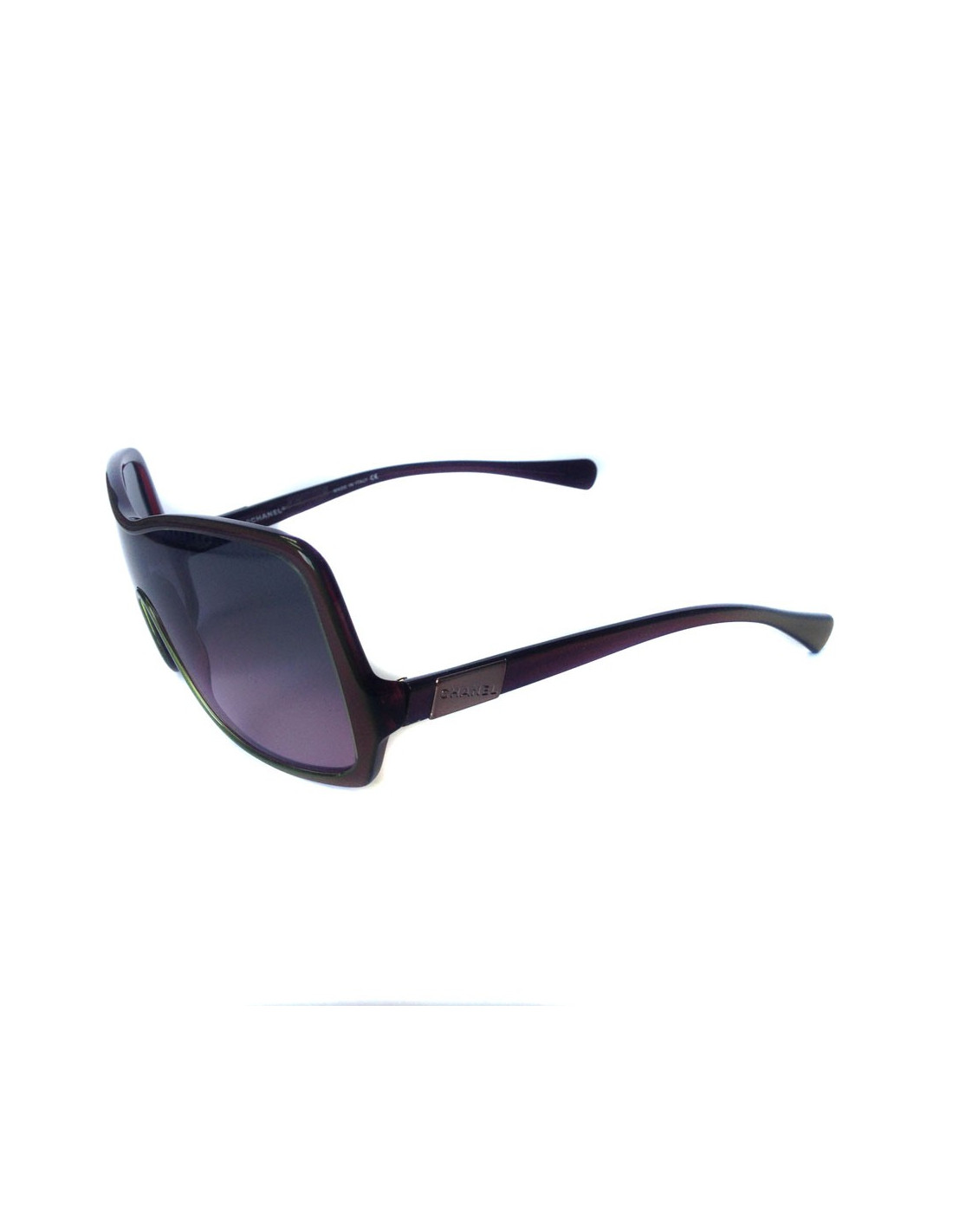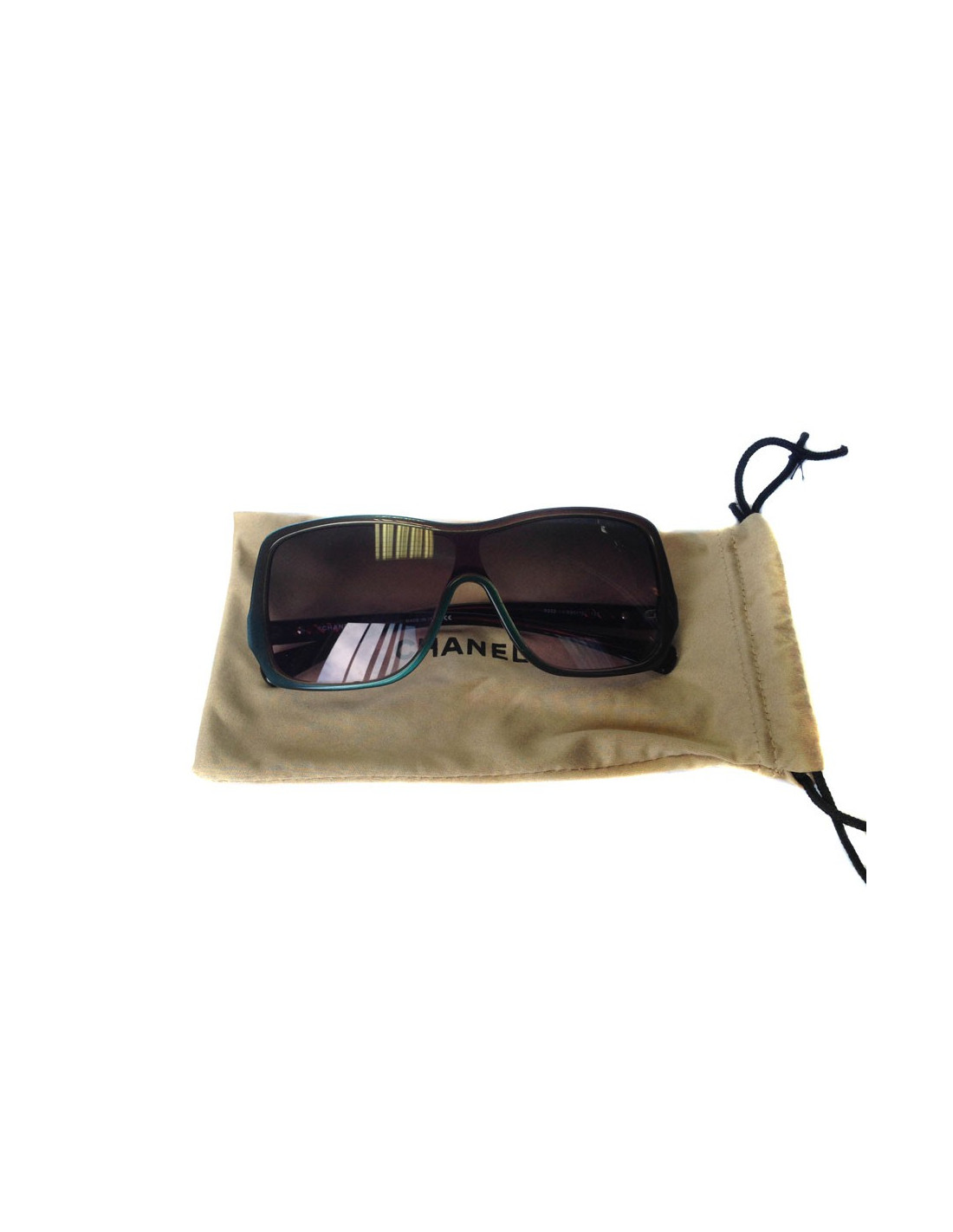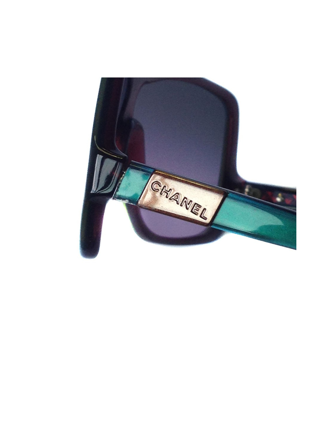 Paire de lunettes de soleil Chanel vintage, la monture est cerclée, l'extérieur est de couleur turquoise nacrée et l'intérieur de couleur bordeaux, les verres sont dégradé de teinte bordeaux, l'intérieur de la monture présente quelques rayures. Elles sont en très bon état.