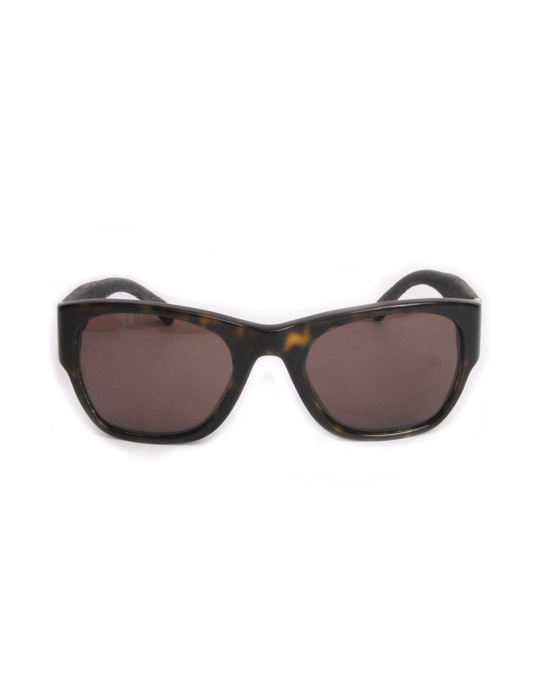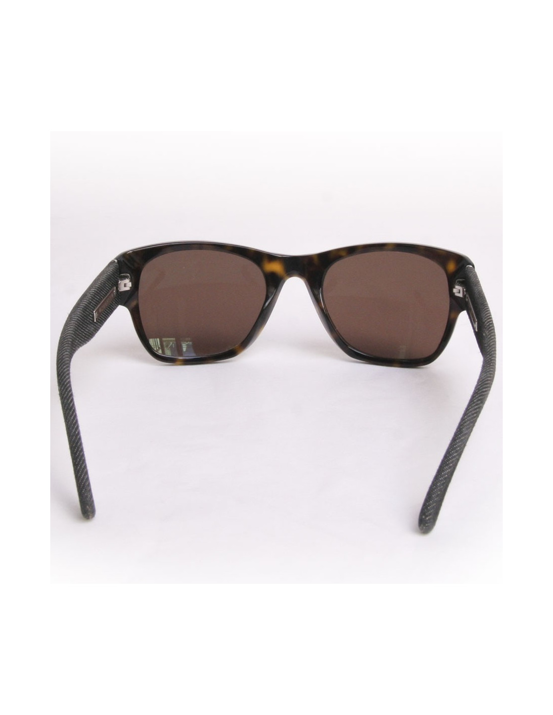 Lunettes de soleil fumées avec contour façon écaille de tortue. Les branches sont gainées de tissu en jean's gris. La bijouterie est en métal argenté.