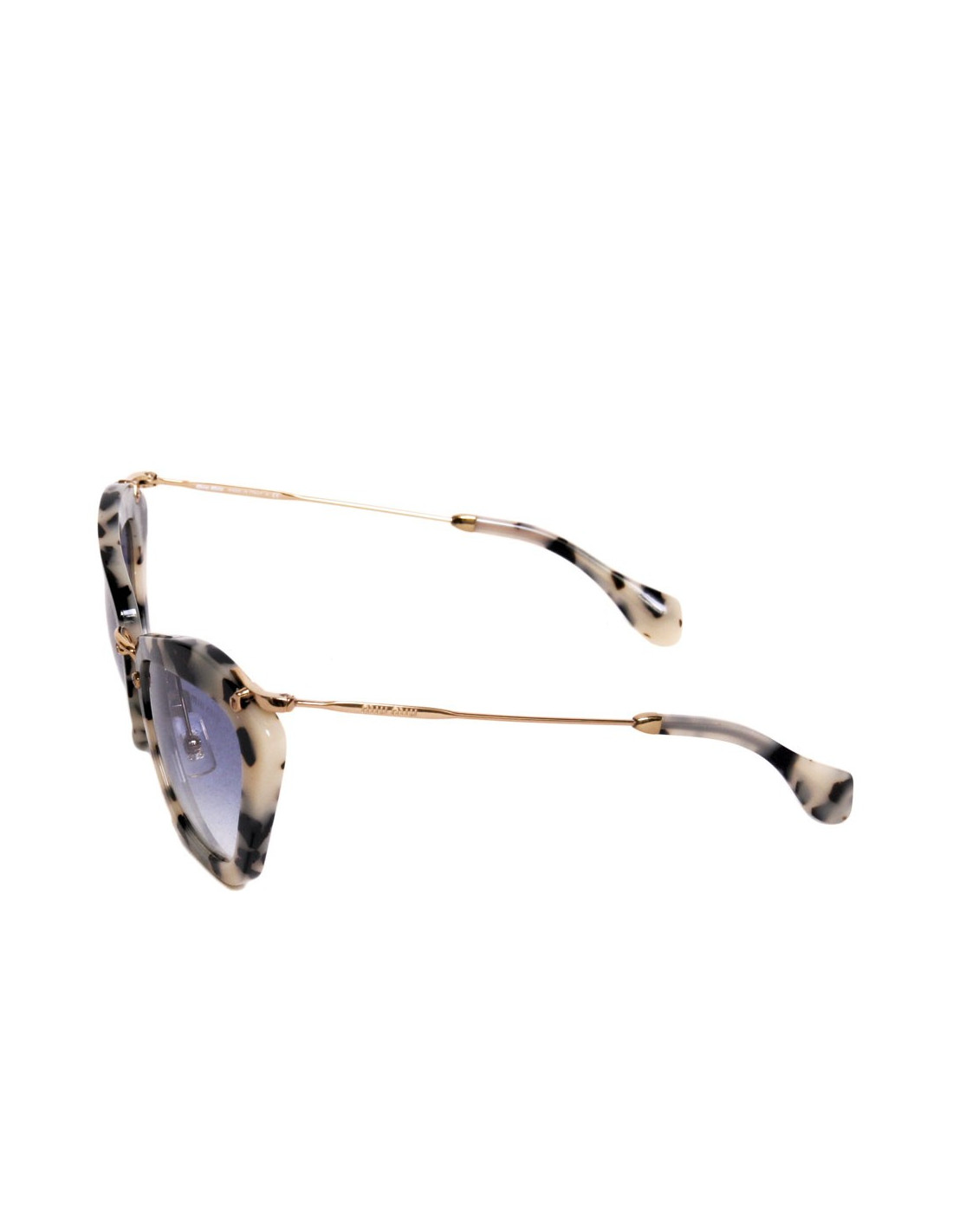 Dernière collection, modèle style années 40. Branches en métal doré, ornée d'une gravure "miu miu" sur chacune. Verres teintés en dégradé bleu.