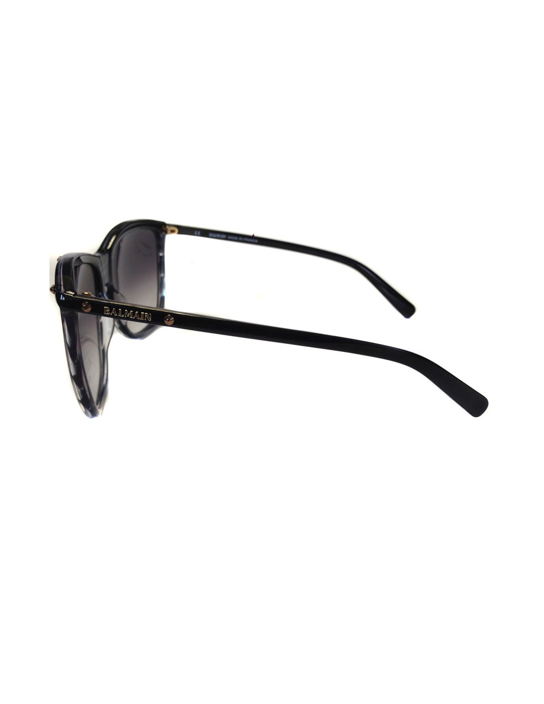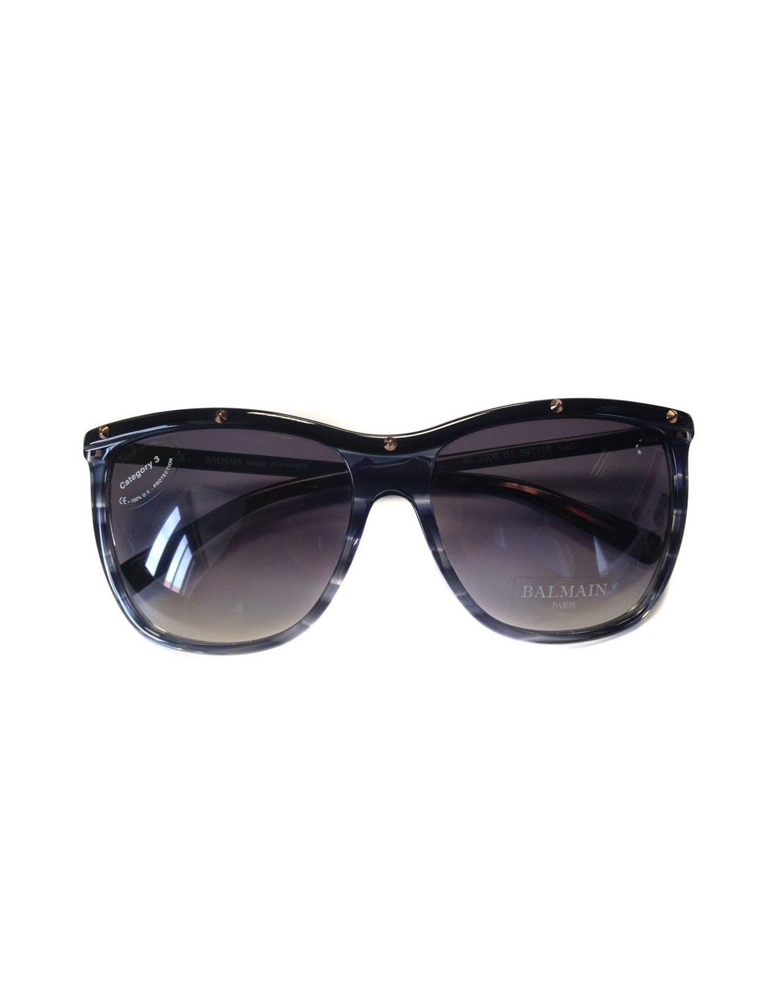 Lunettes de soleil Balmain, bleu gris, et verres fumés.Les branches sont noires.