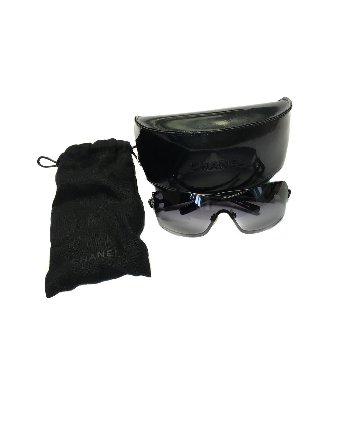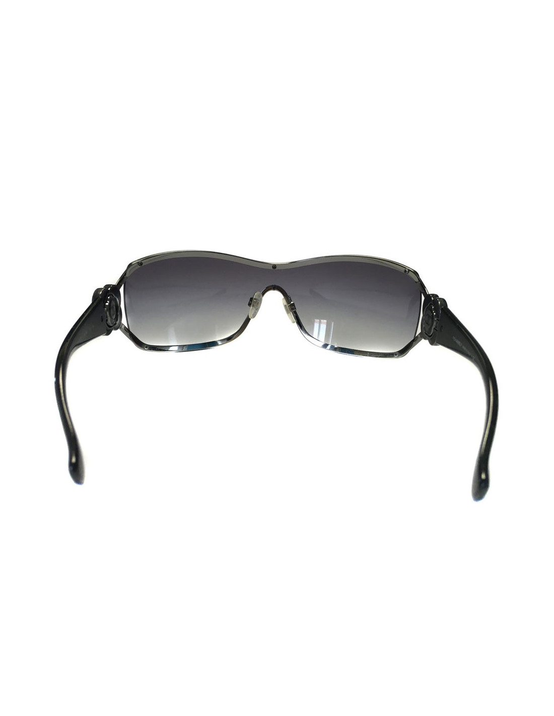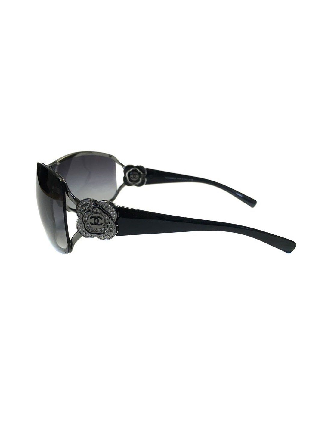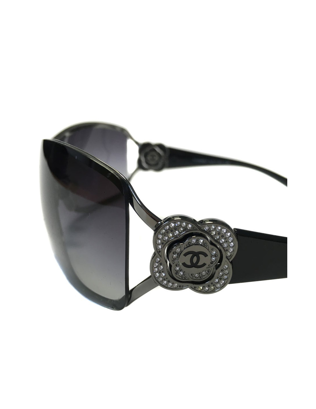 Ravissantes lunettes de soleil Chanel. Monture en métal, verres fumés dans un dégradé de bleu et branches en plastique noir. Camélia en strass sur les côtés et CC gravé dedans. Les verres et les branches ont quelques griffures.