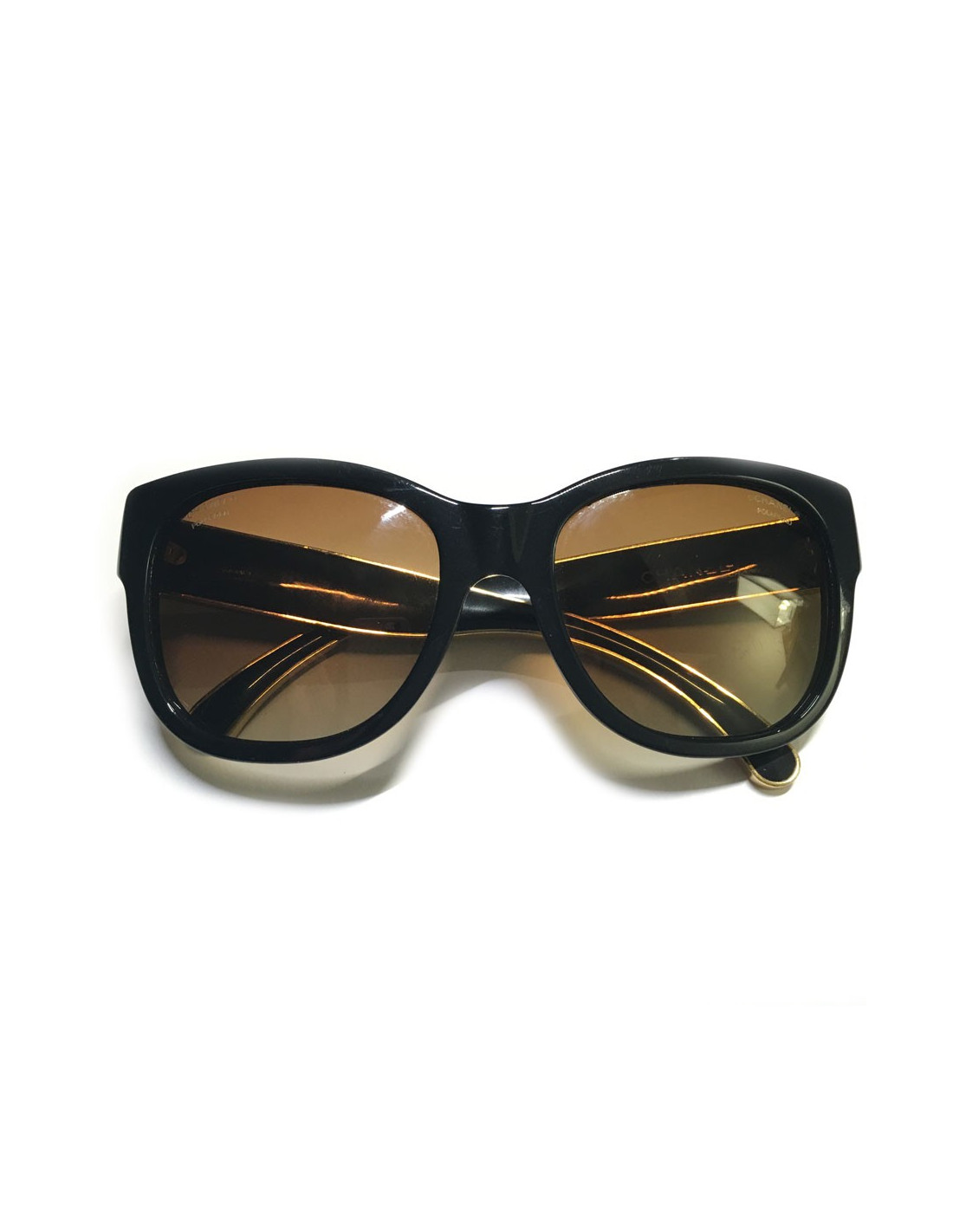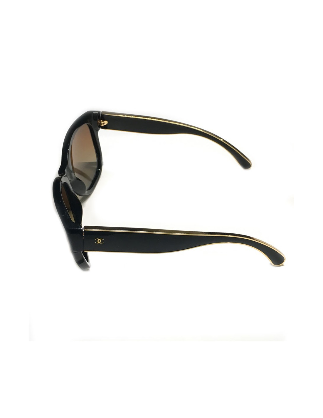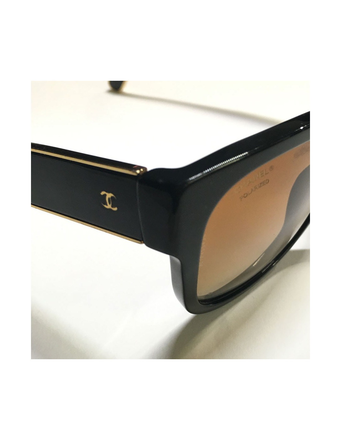 Lunettes de soleil CHANEL. Monture en plastique noire, contour des branches en métal doré. Verres fumés polarisés dans un dégradé de marron. Quelques micros rayures sur les verres. En bon état.