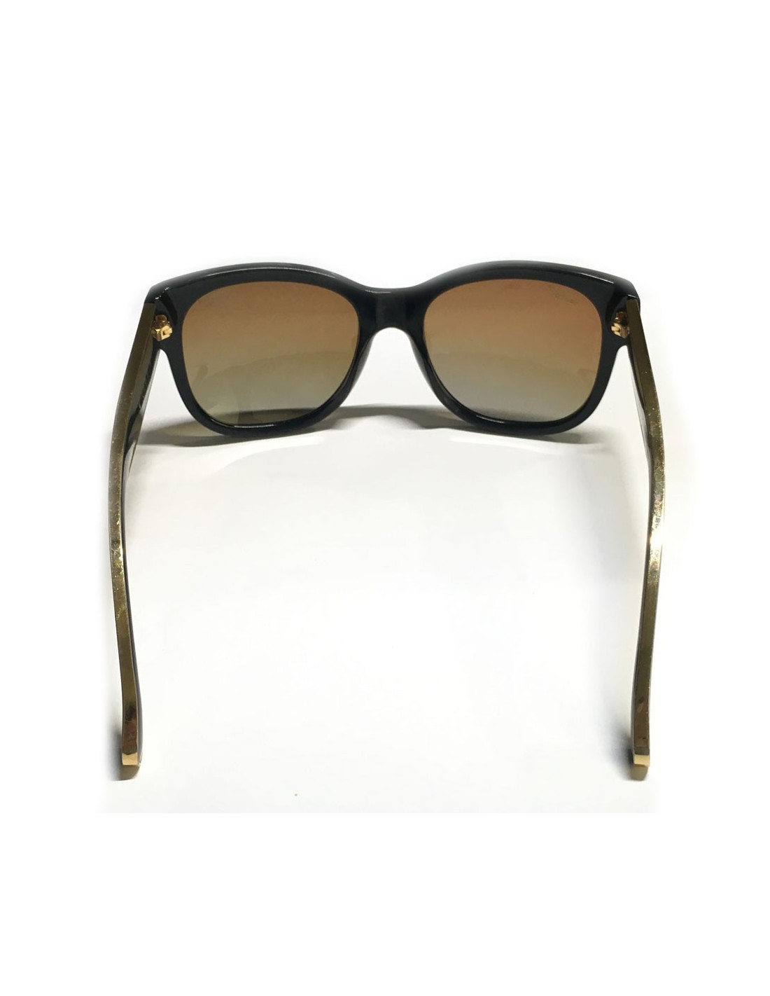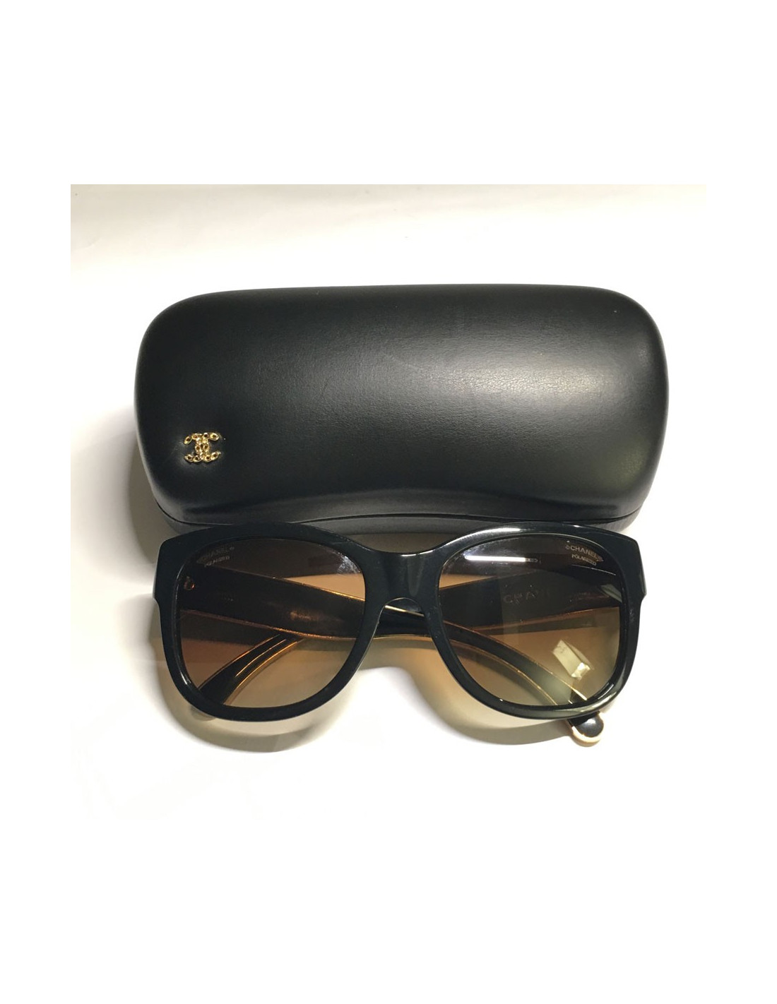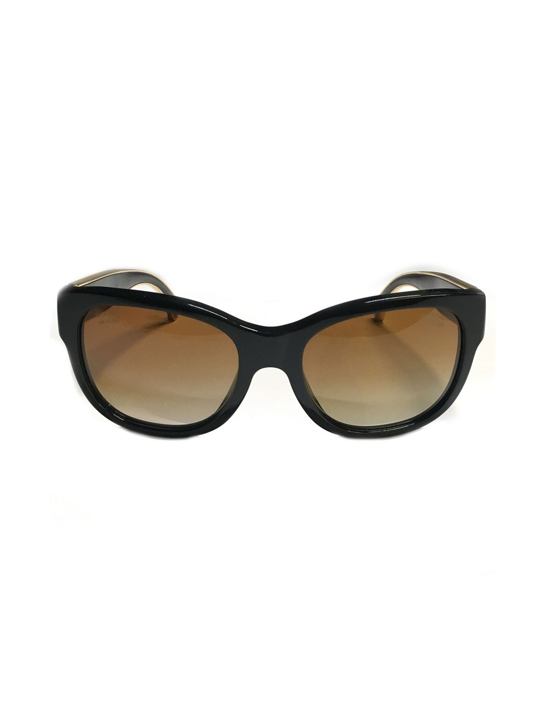 Lunettes de soleil CHANEL. Monture en plastique noire, contour des branches en métal doré. Verres fumés polarisés dans un dégradé de marron. Quelques micros rayures sur les verres. En bon état.