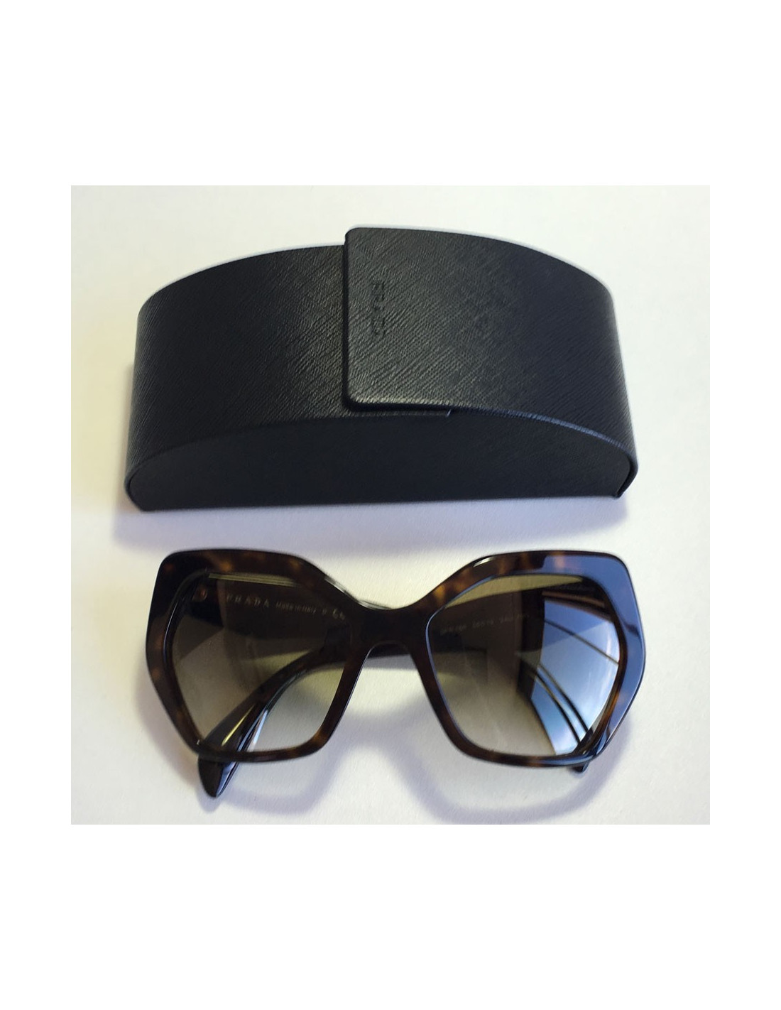 Belle paire de lunettes de soleil PRADA en plexi façon écaille de tortue marron. Couleur des verres: un dégradé de marron. En parfait état.