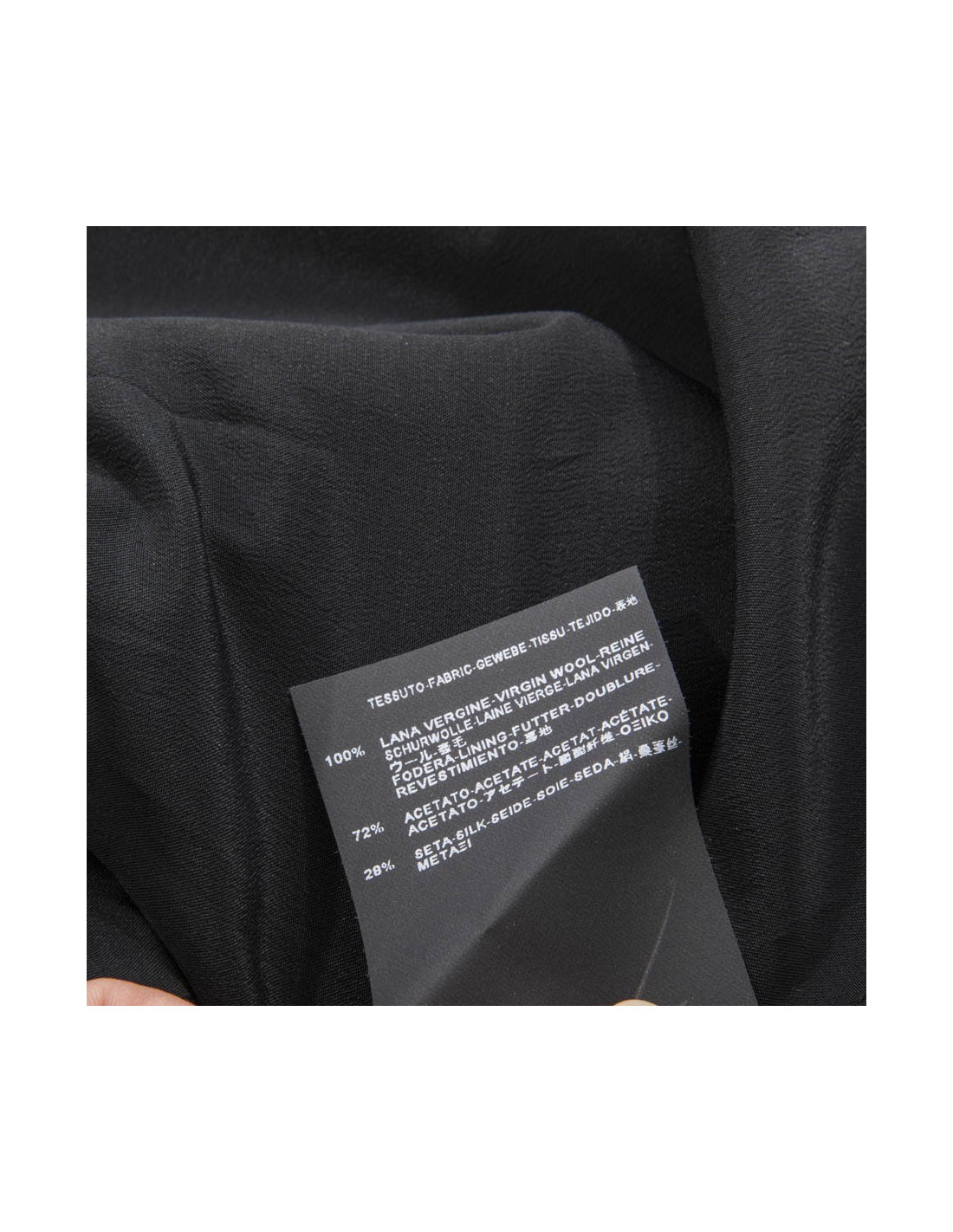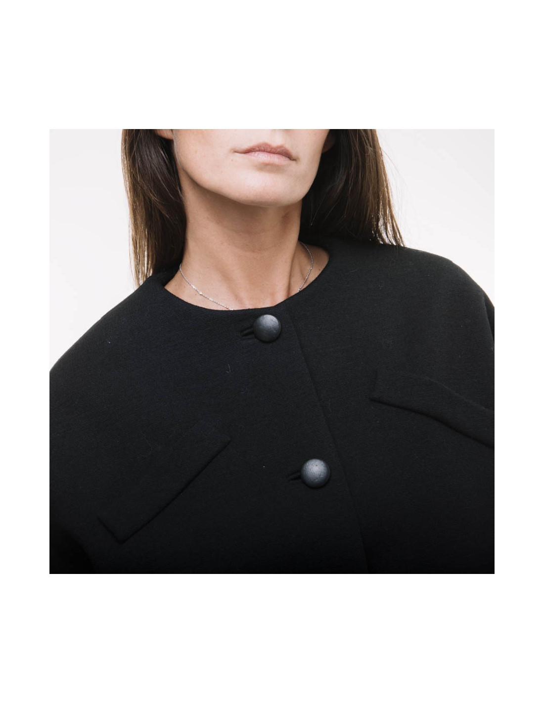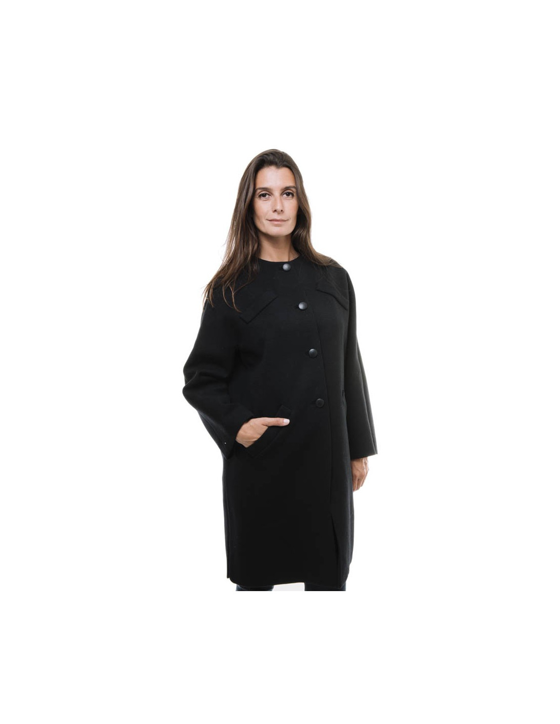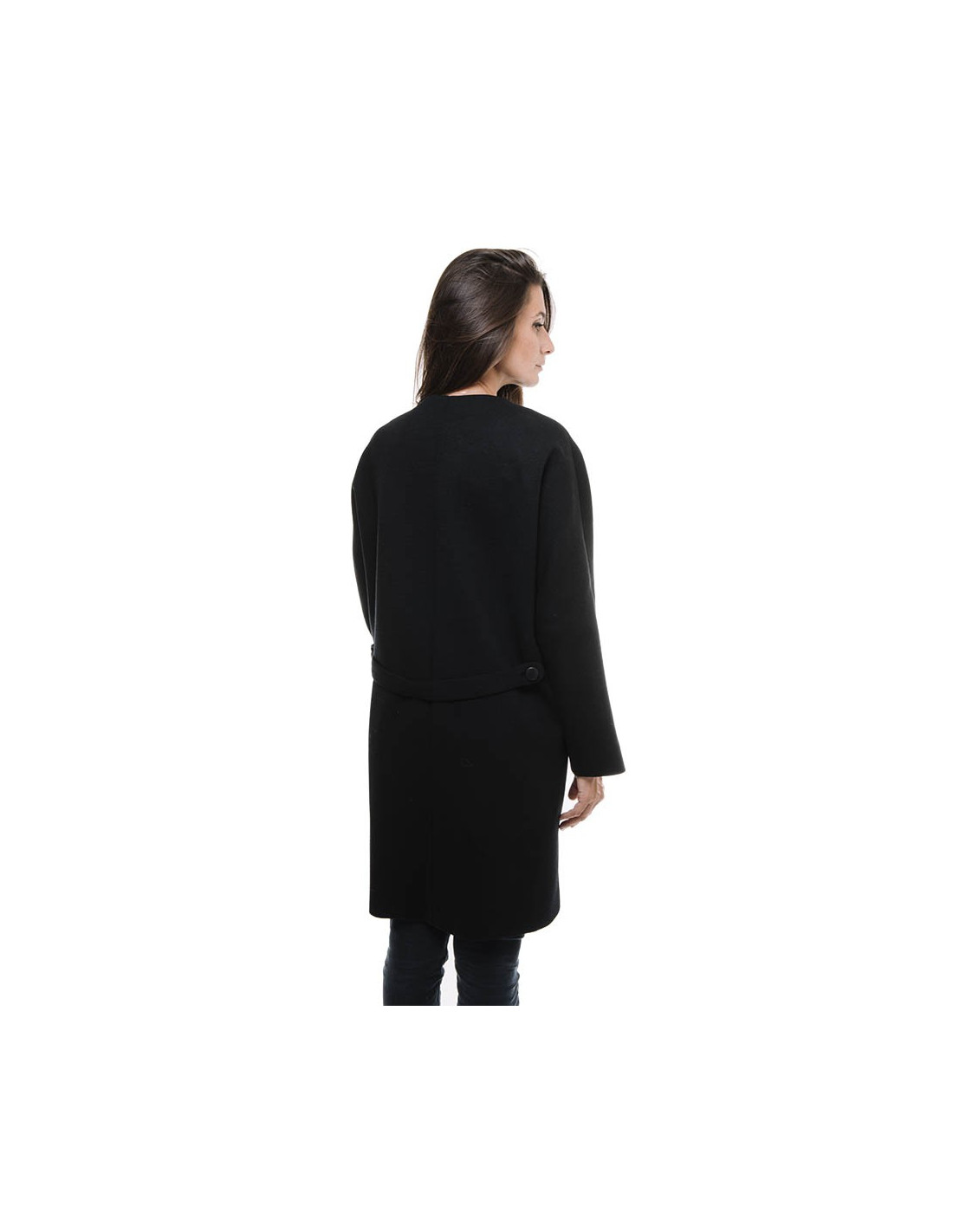 Une martingale dans le dos, ce manteau se ferme a l'aide de 4 boutons gainés de cuir noir. La doublure est en soie noire.