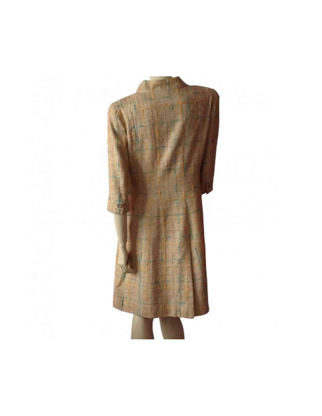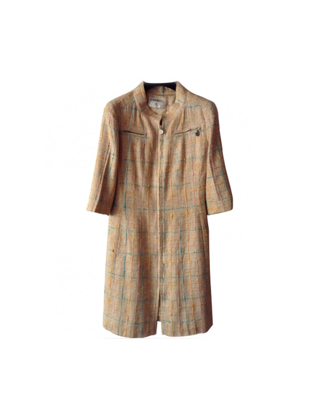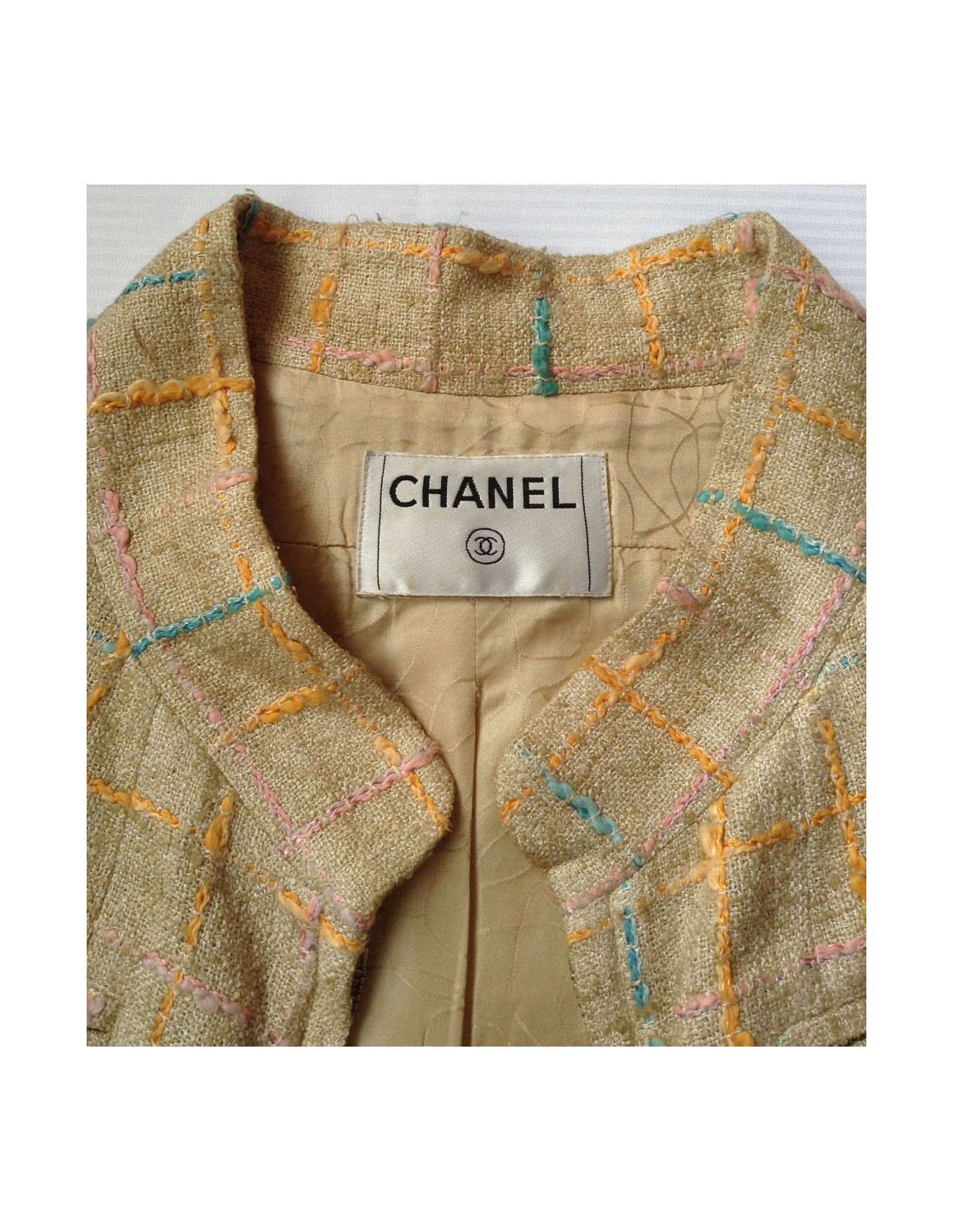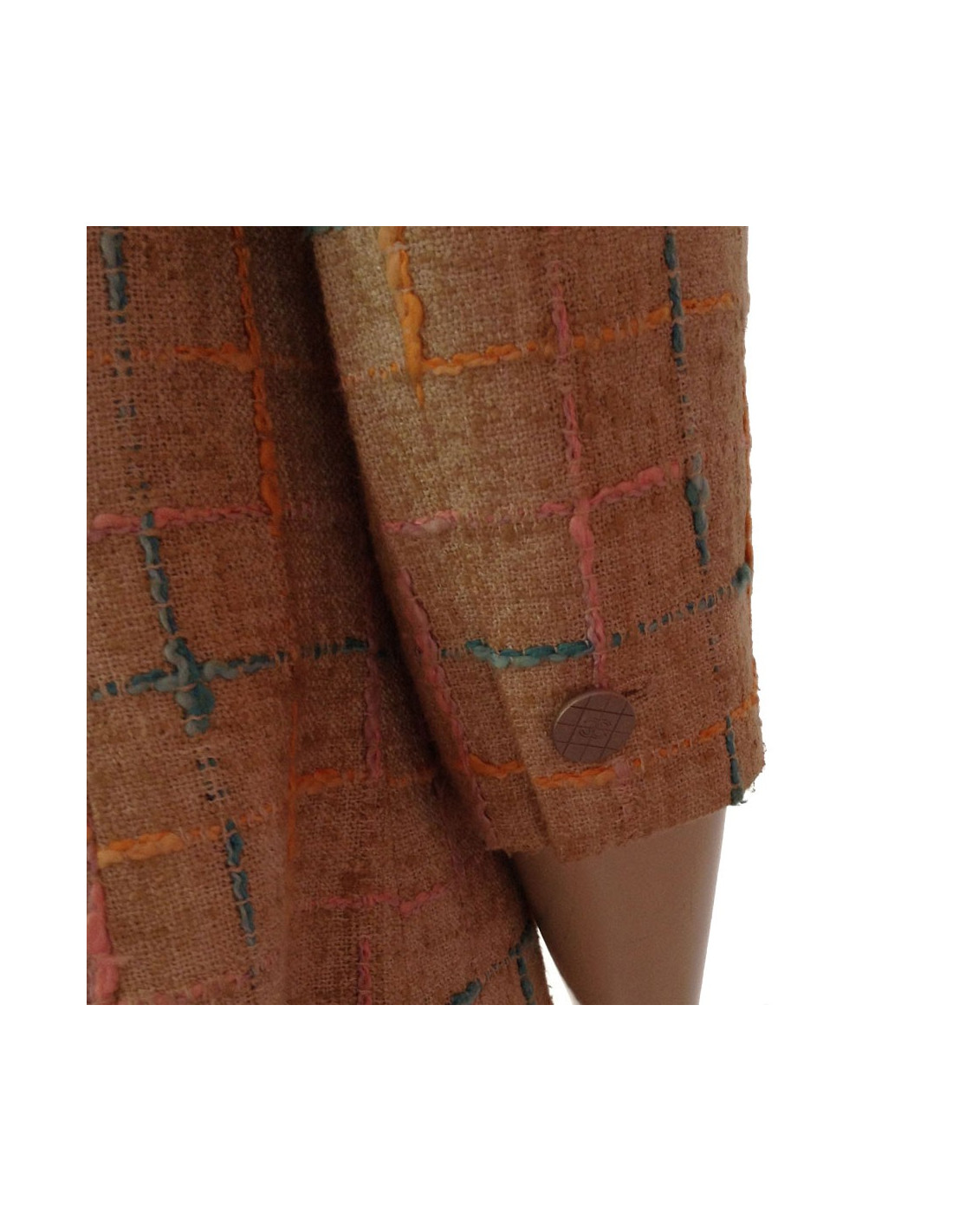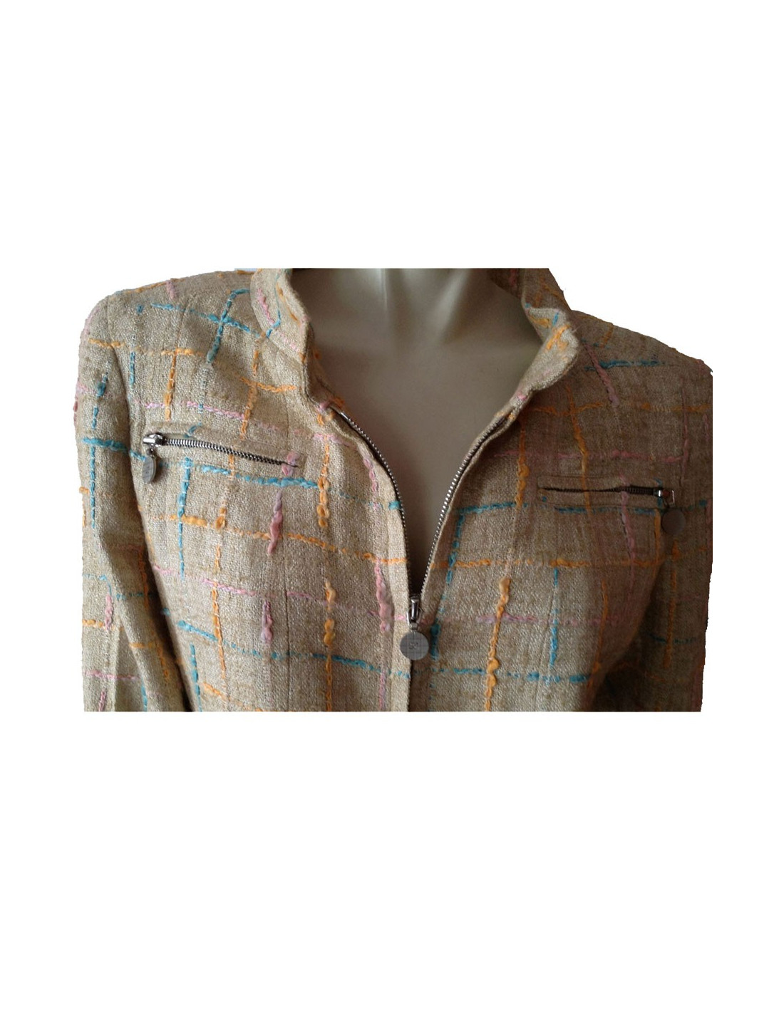 Manteau Chanel en Tweed, surpiqué de fils aux formes géométriques de couleur bleu ciel, rose, orange sur fond beige.