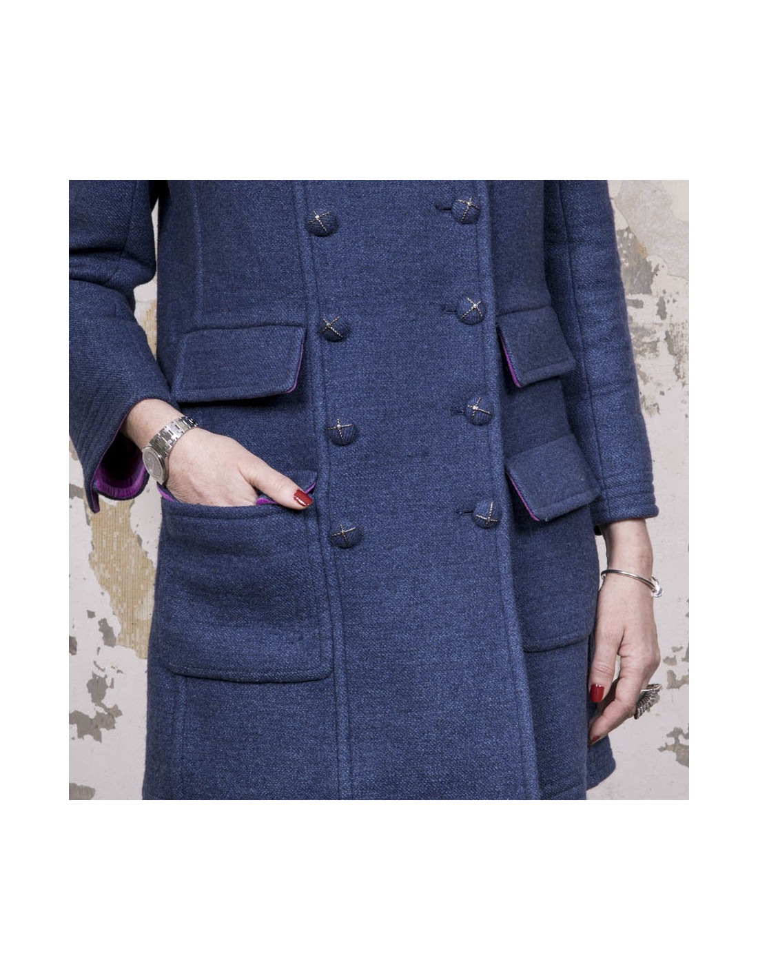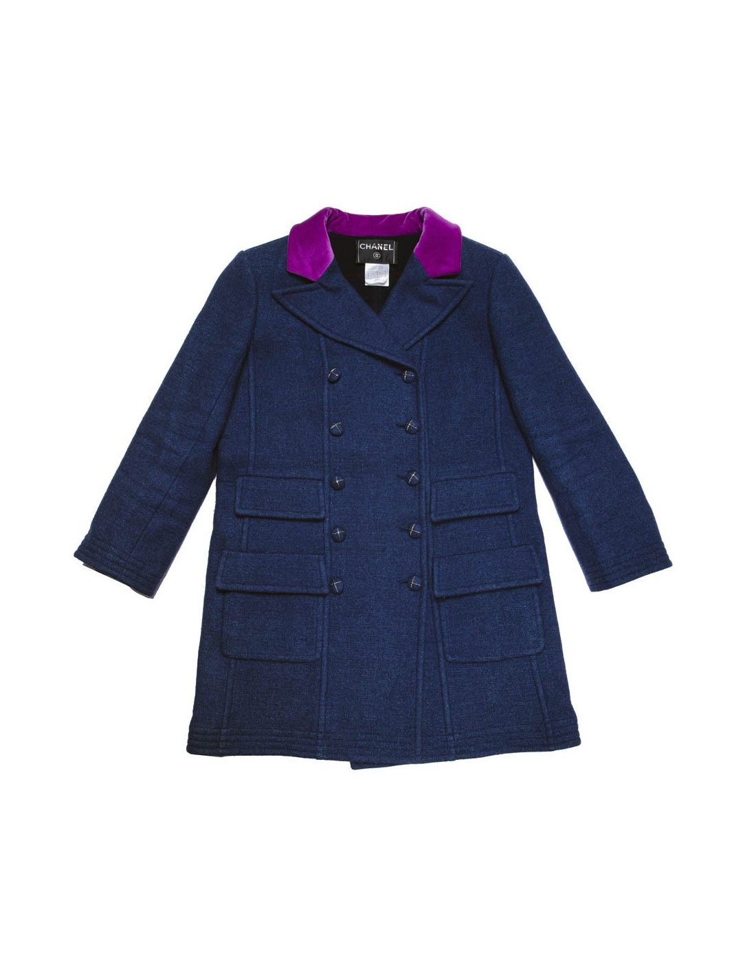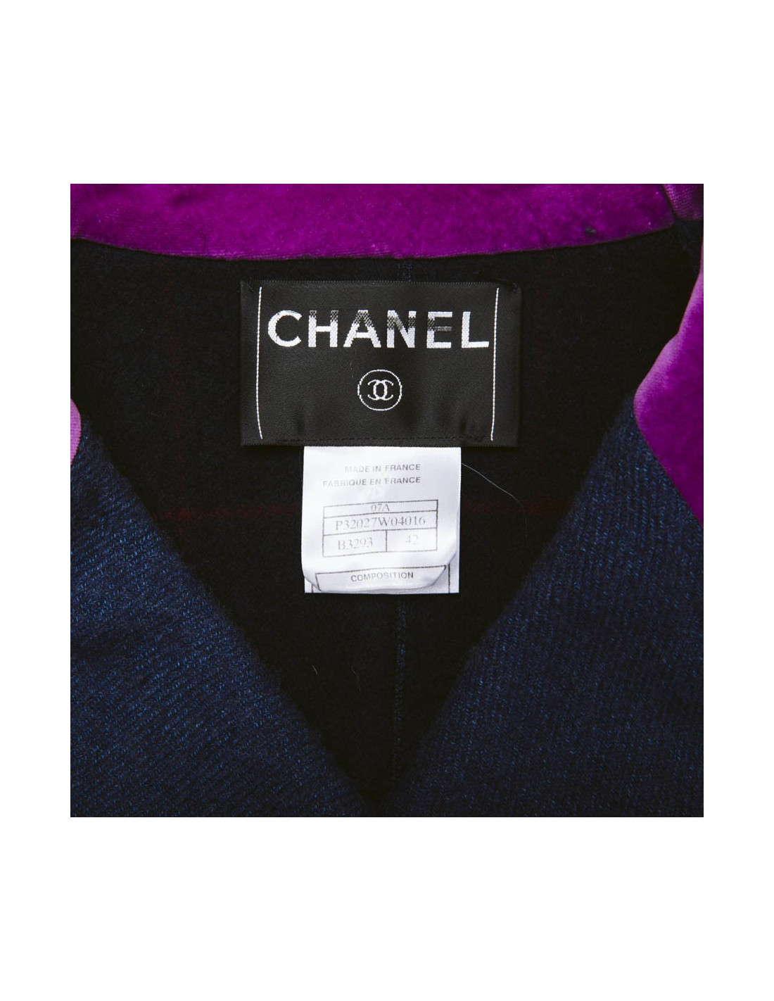 Caban taille 42 Chanel en cachemire, laine et coton bleu avec le col en velours violet. Collection Automne Hiver 2007. Se ferme à l'aide de dix boutons bleus avec une forme de croix en métal argent. On retrouve le même bouton au niveau des manches : deux à chaque poignet. Il y a aussi quatre poches avec rabat. Le caban n'est pas doublé. En très bon état. Made in France.