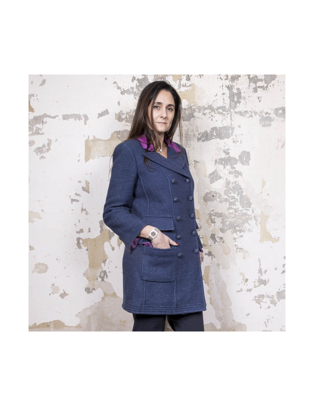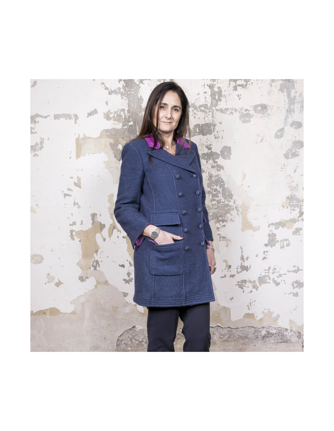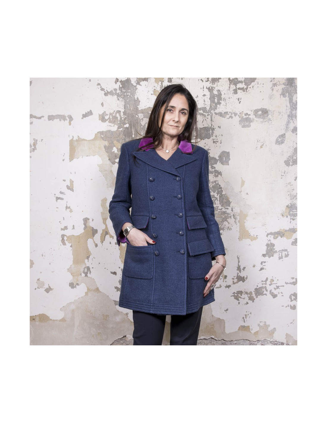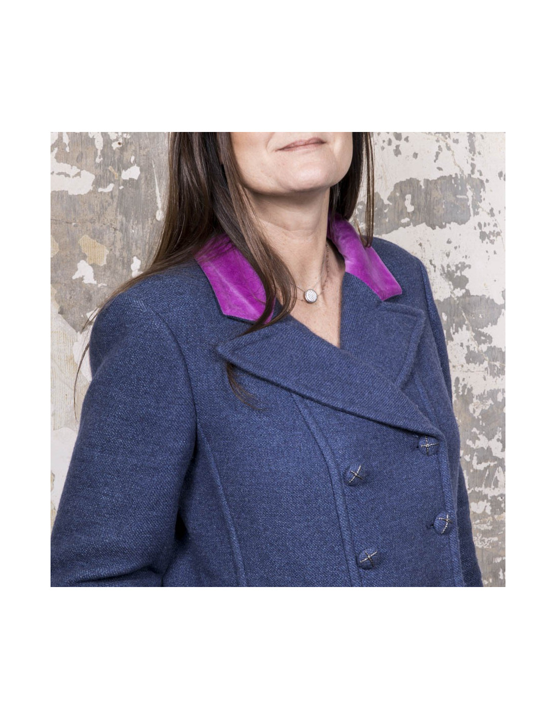 Caban taille 42 Chanel en cachemire, laine et coton bleu avec le col en velours violet. Collection Automne Hiver 2007. Se ferme à l'aide de dix boutons bleus avec une forme de croix en métal argent. On retrouve le même bouton au niveau des manches : deux à chaque poignet. Il y a aussi quatre poches avec rabat. Le caban n'est pas doublé. En très bon état. Made in France.