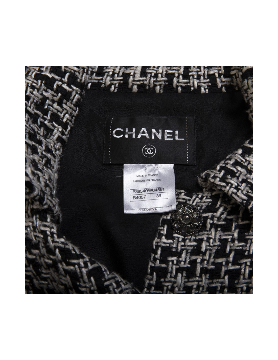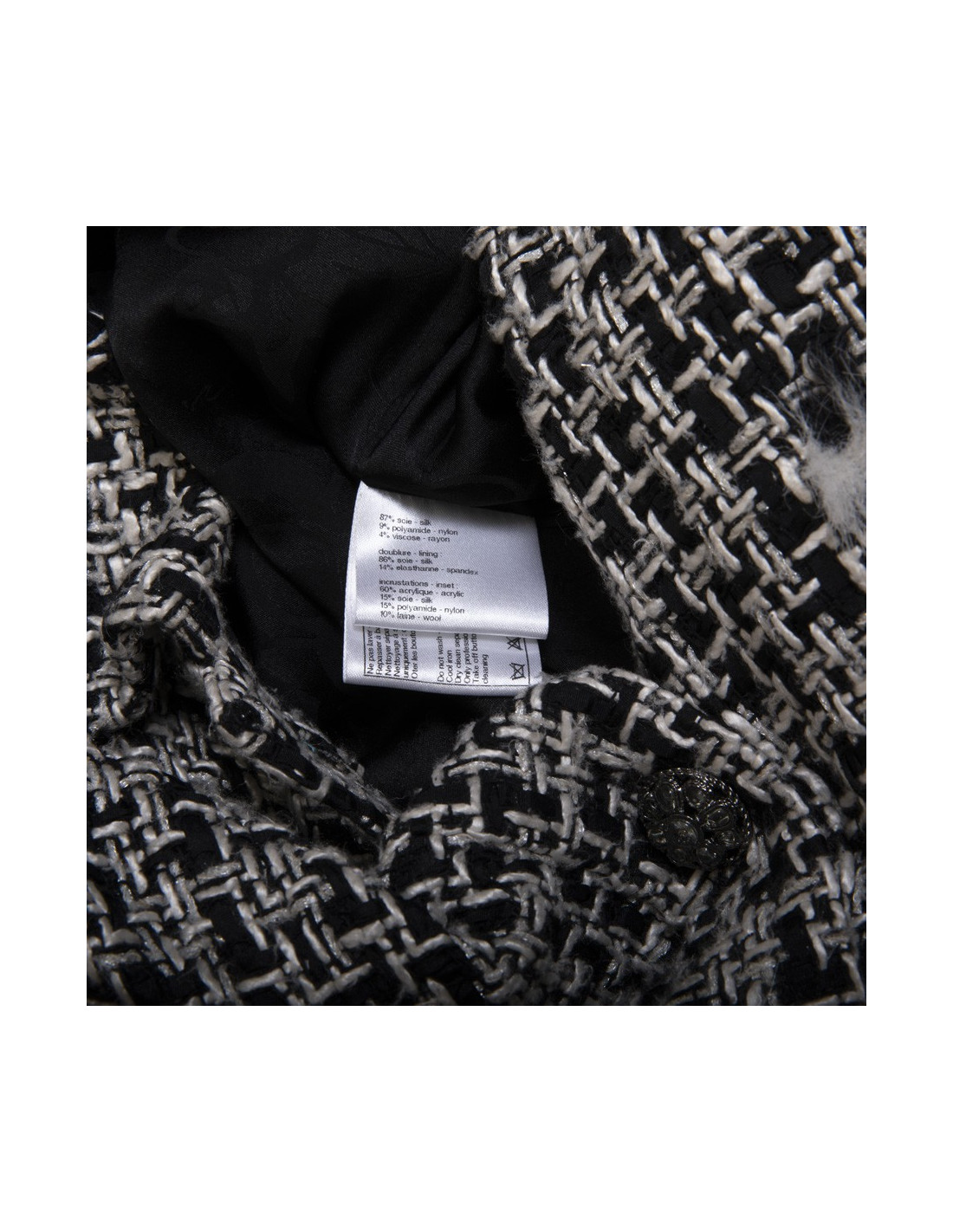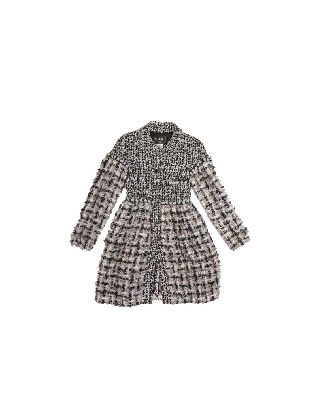 Manteau mi-long CHANEL T36 en tweed noir et blanc (et fils argentés) sur le haut, et multicolore (rose, bleu clair, violet, jaune, etc.) sur le bas et les manches. Doublure en soie imprimée noire. Boutons en pâte de verre grise signés CC. Grande poches plates dans le bas du manteau, et deux petites fausses poches au niveau de la poitrine.