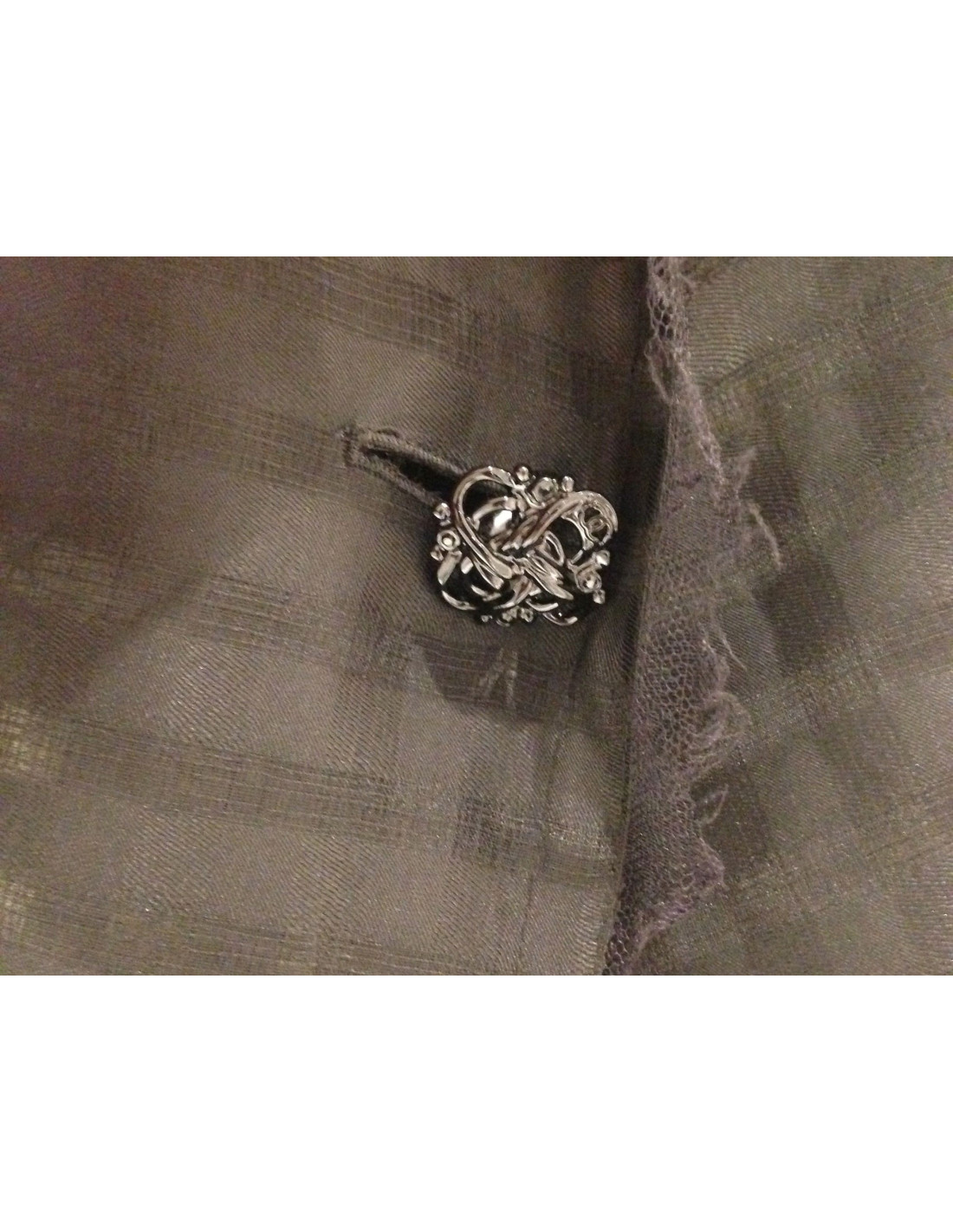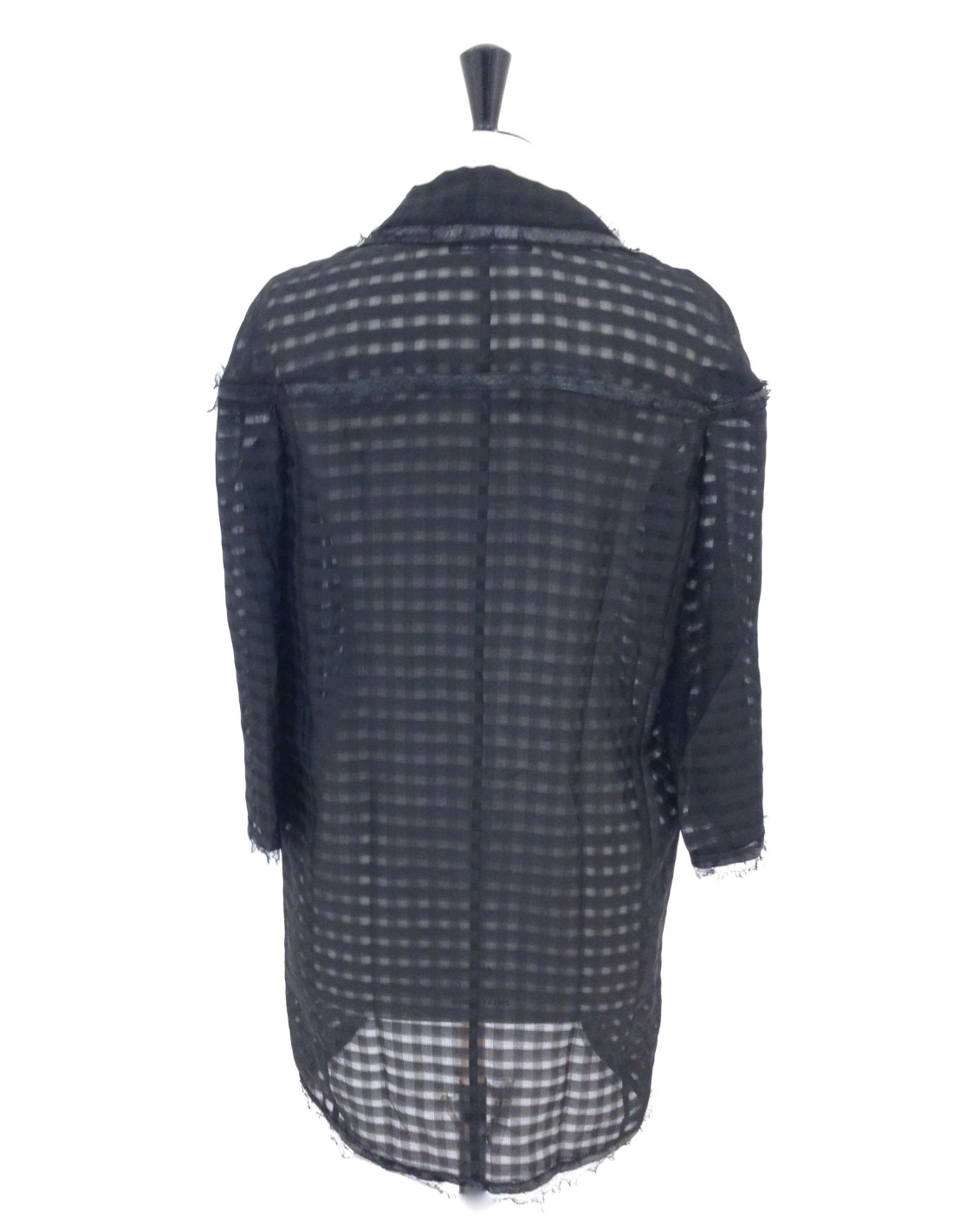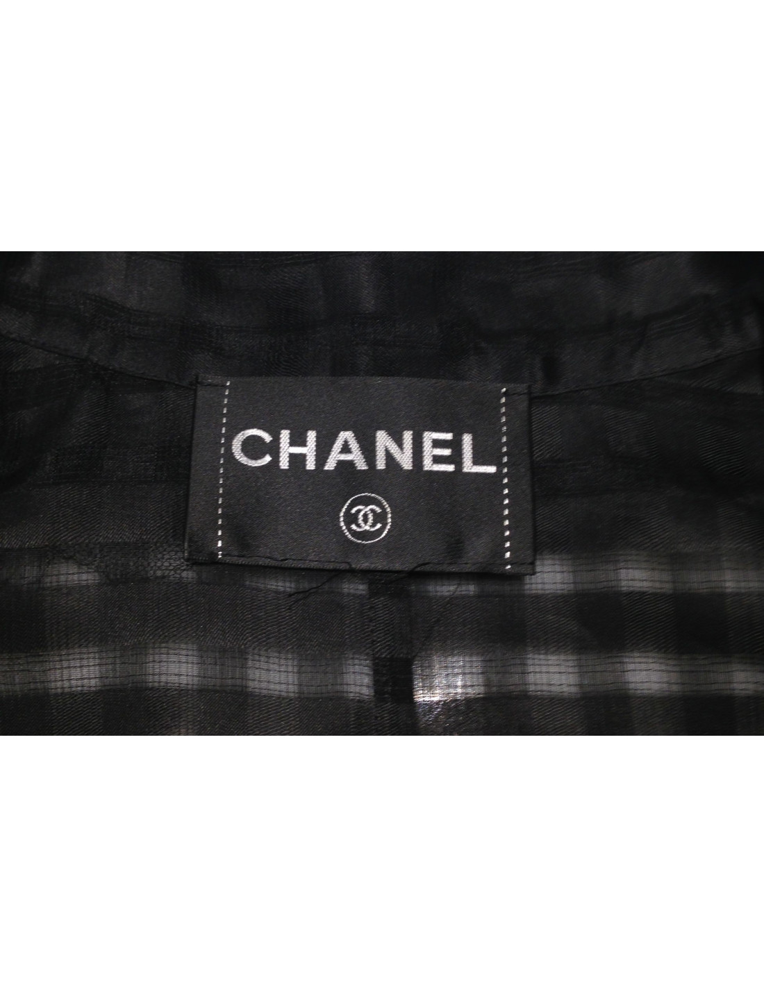 Veste longue CHANEL exceptionnelle en organza, modèle couture, taille 42. Cette pièce unique est un par-dessus transparent à superposer sur un ensemble, une robe, ou une veste. L'effet damier créé par les rayures du tissu apporte du relief. La veste se ferme à l'aide d'un bouton couture en argent rodié noir en forme de fleurs entrecroisées, orné de petits strass noirs, et d'un sigle CC. Chaque bordure de tissu est agrémentée de franges délicates de résille noire, ainsi que par de liserés de cuir craquelé noir. Prix public : 2500€.