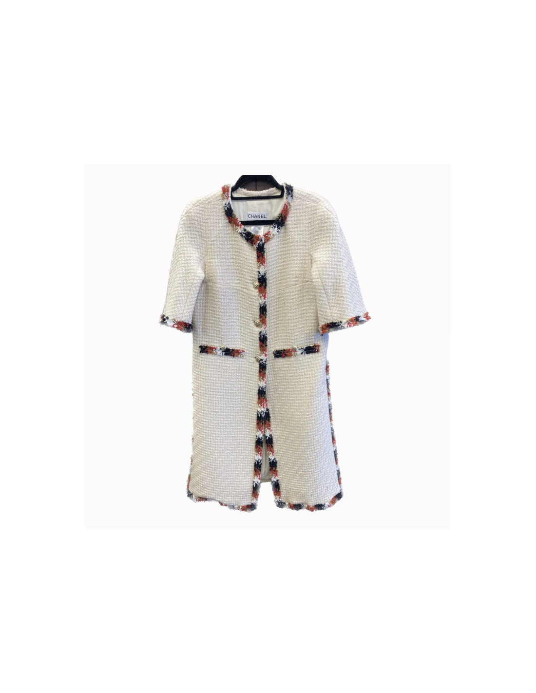 Manteau beige CHANEL T42 tweed beige gansée rouge et noir