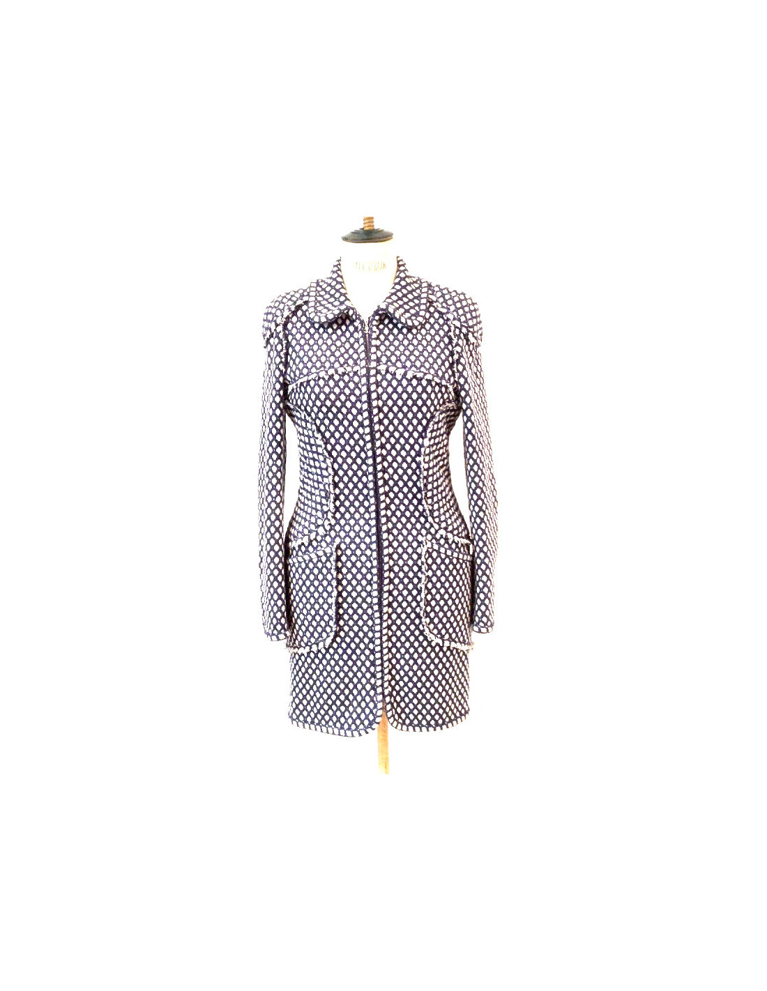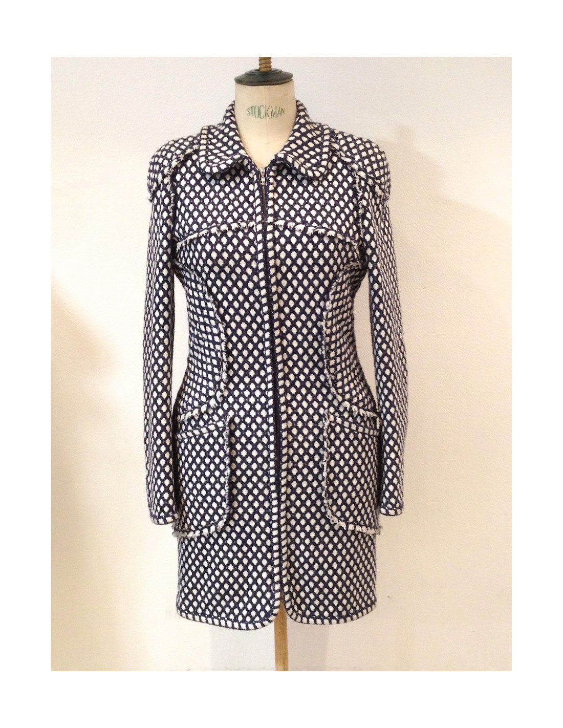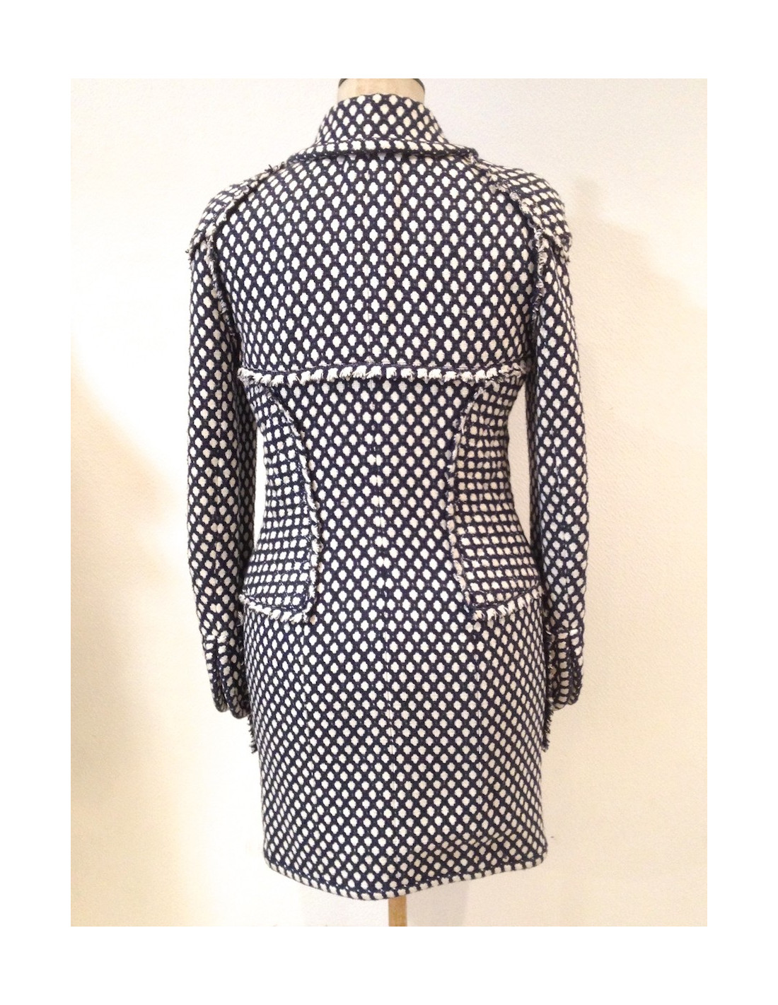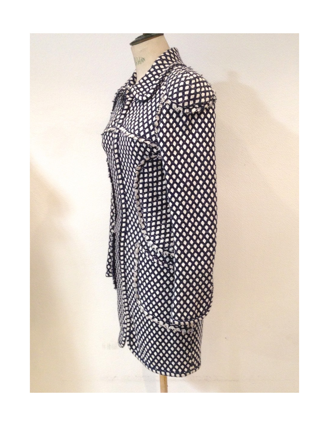 Détails : robe manteau en tweed bleu marine et blanc CHANEL de taille 38. La doublure est entièrement en 100% soie, en très bon état. Se porte soit en robe ou en manteau.