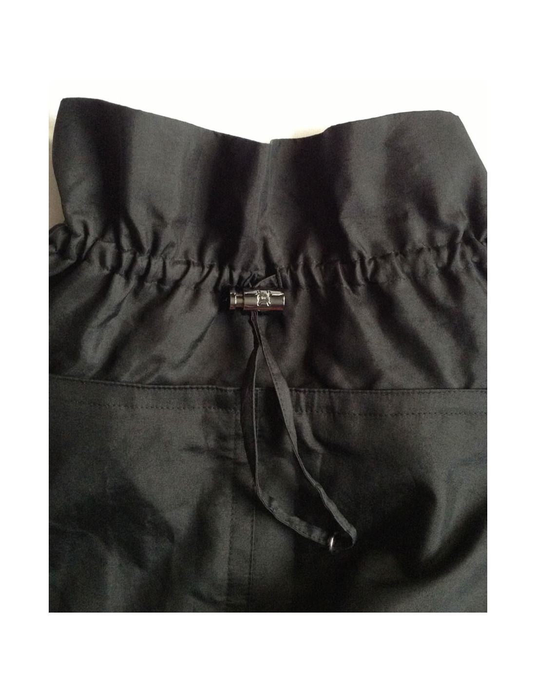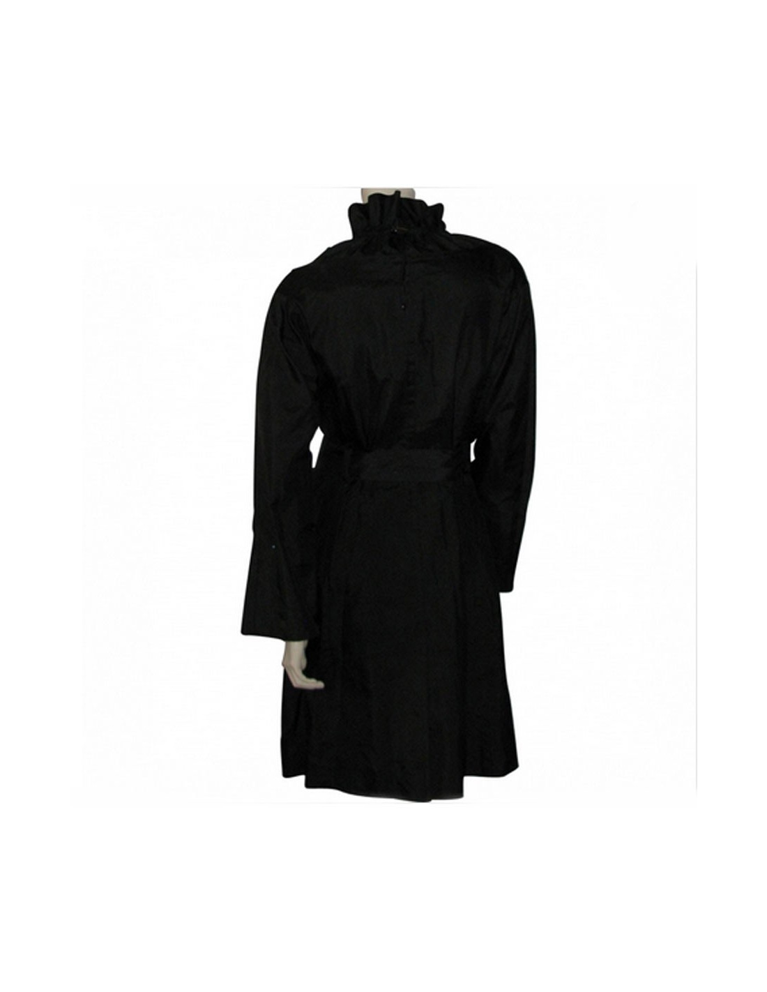 Ce trench bi-matière est imperméable uni noir au dos et en laine à l'avant. Il a un boutonnage de fermeture centrale recouvert d'une bande imperméable noire accompagnée d'une ceinture intégrée avec deux poches invisibles en biais au niveau des hanches.