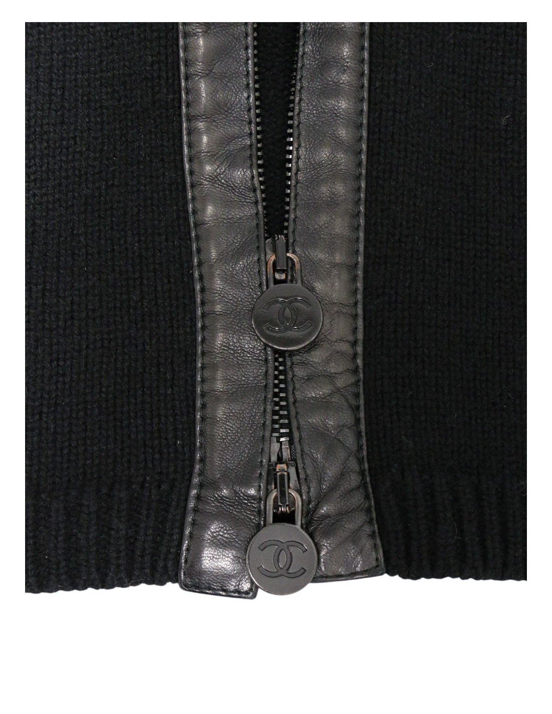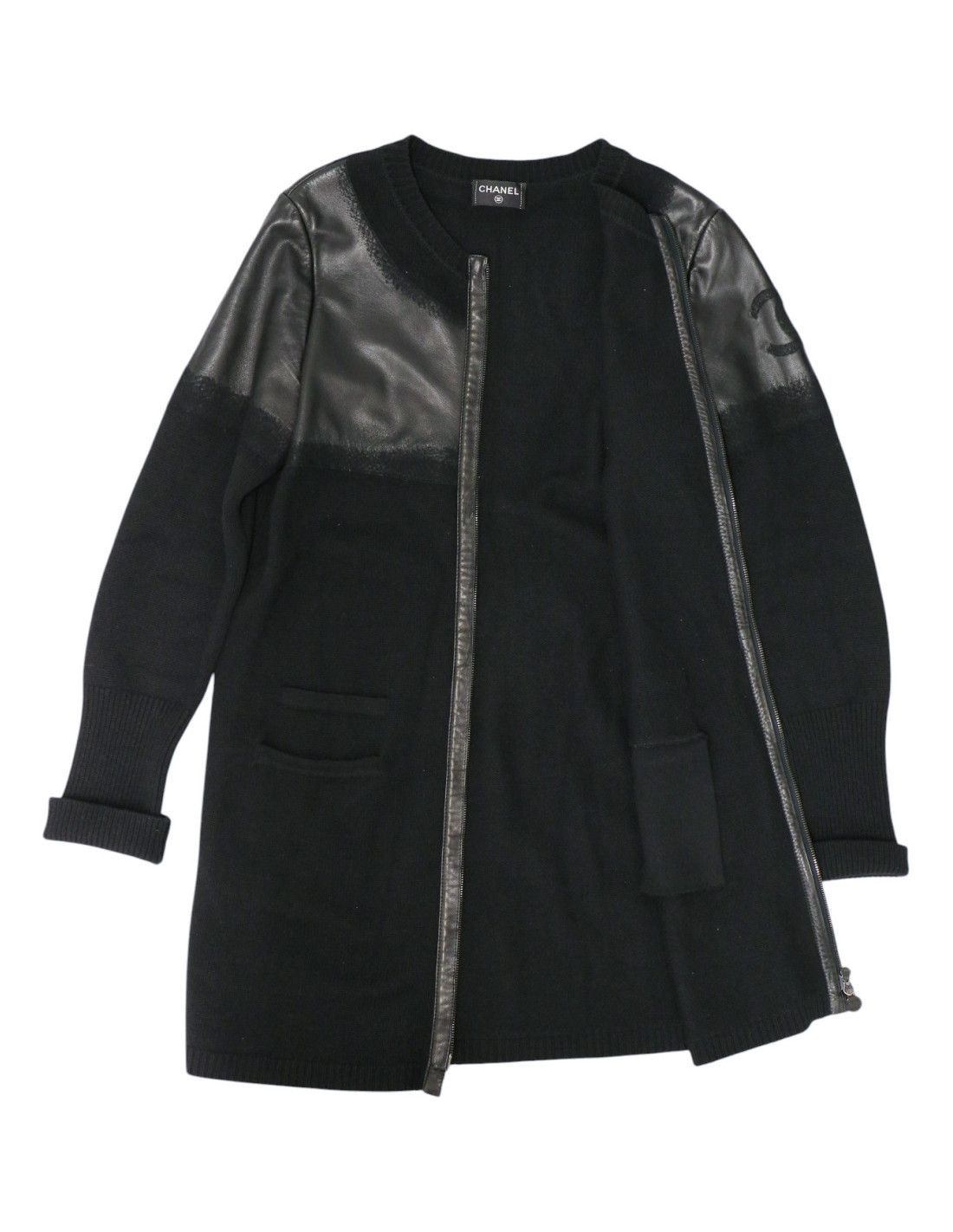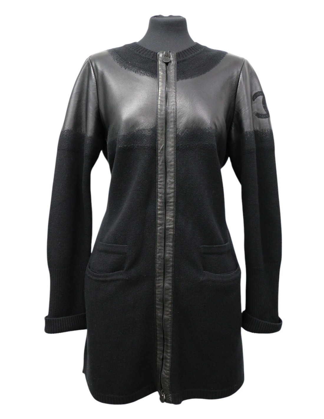 Manteau CHANEL T42 laine et cuir d'agneau noir