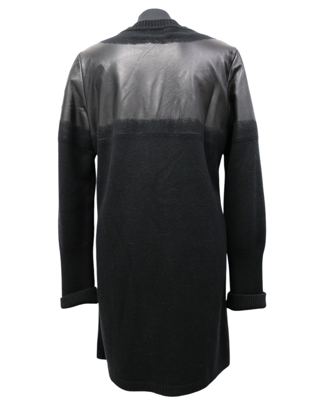 Détails : manteau bi-matière en laine avec empiècements en cuir d'agneau. Logo CC sur l'épaule gauche. Il a deux poches avant et se ferme par une double fermeture éclaire. L'étiquette de composition est toujours présente. Le cuir et la laine se mélangent subtilement sans véritable démarcation, magnifique travail de couture.