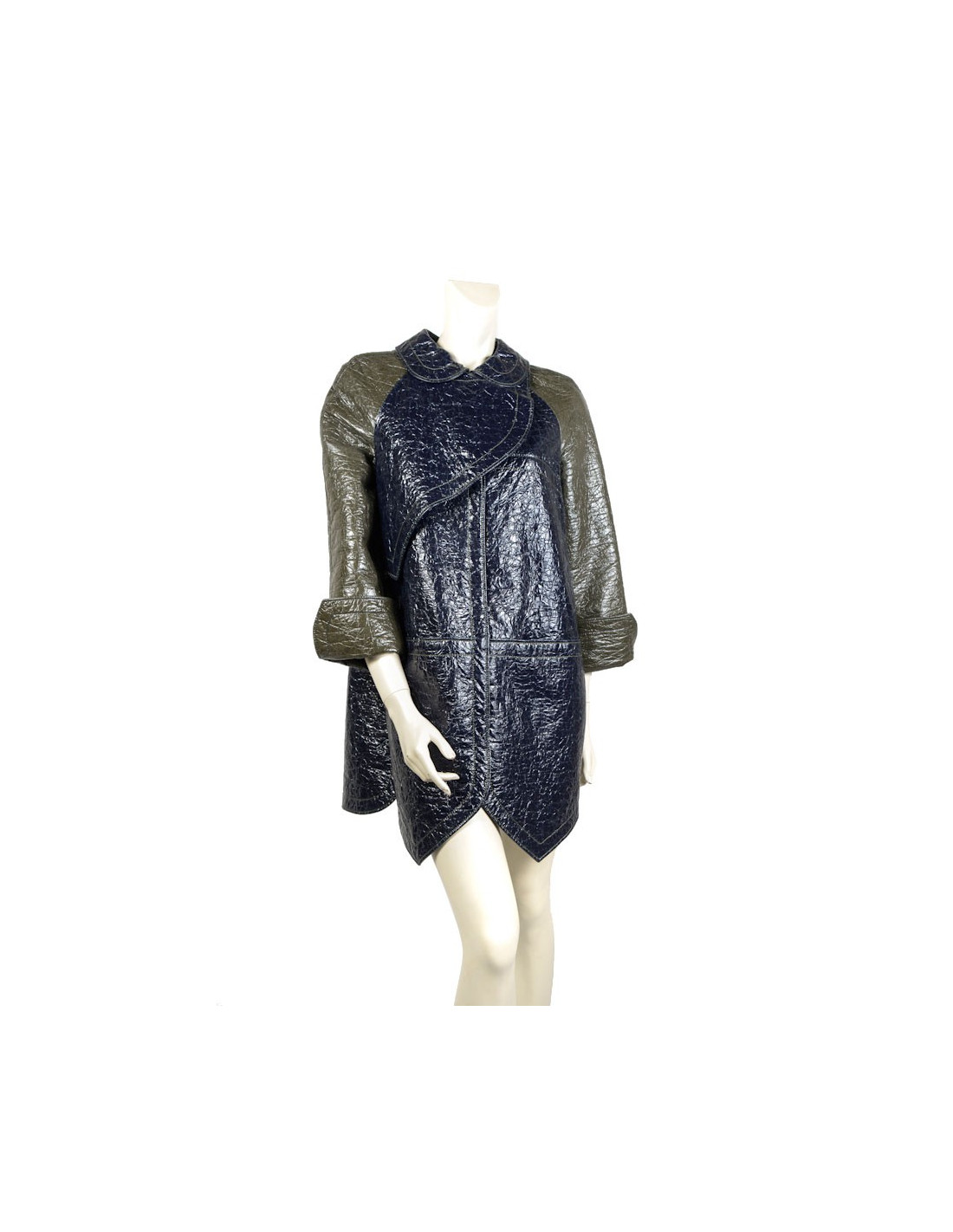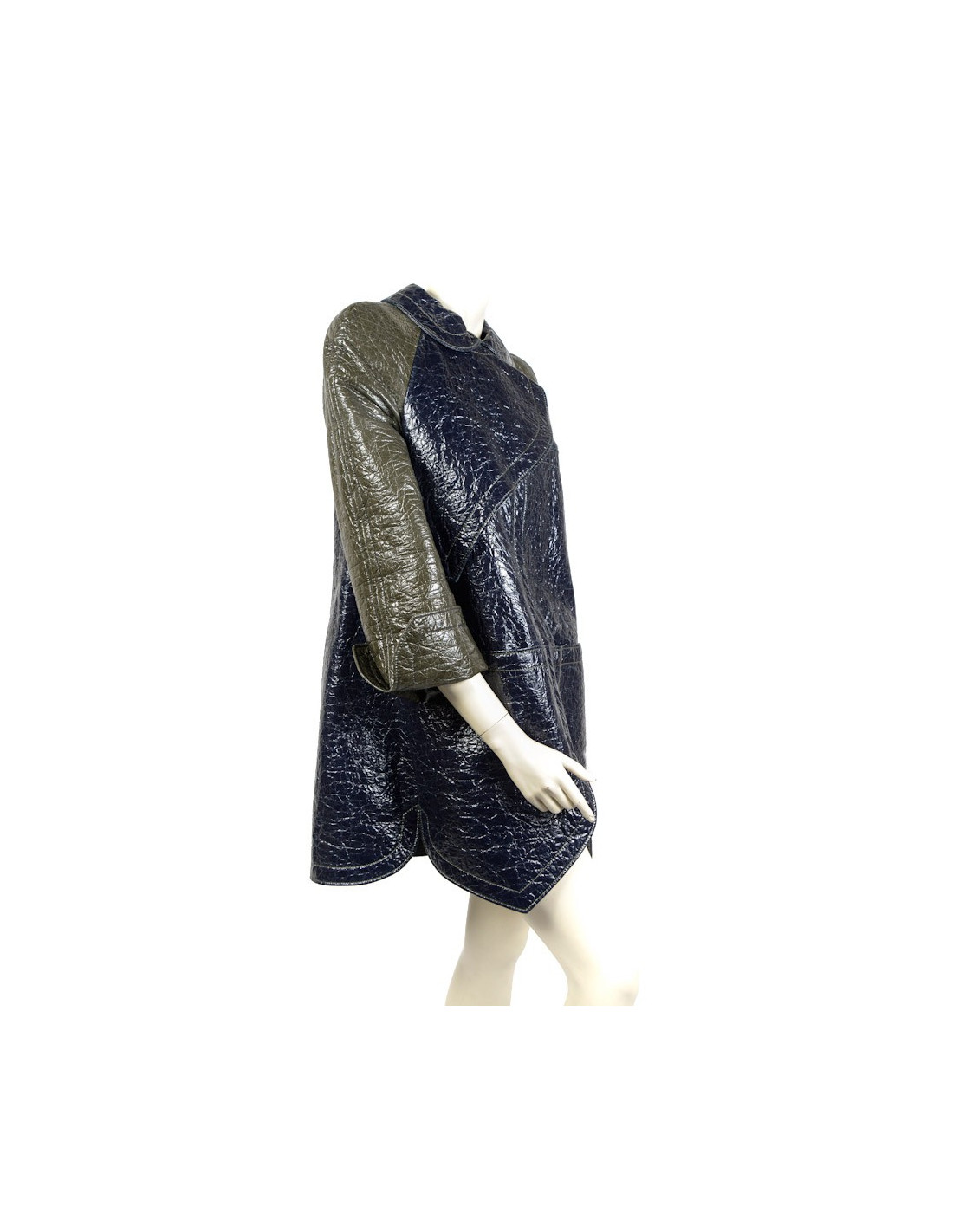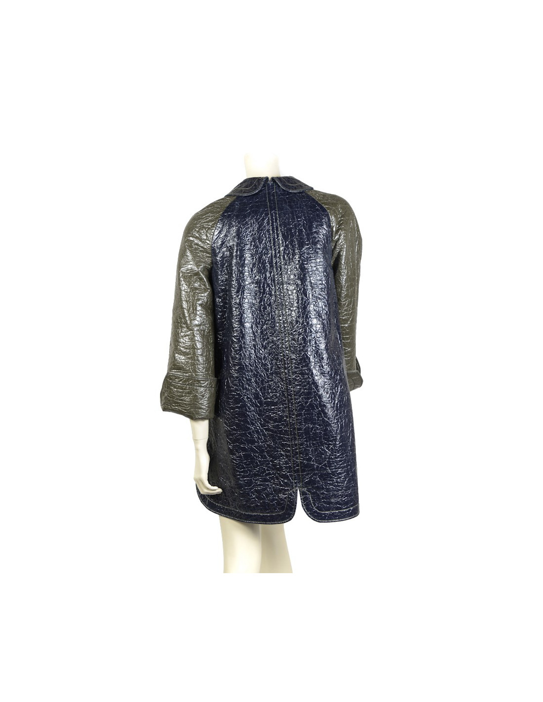 Imperméable Balenciaga en coton ciré bleu marine et vert kaki. Taille 40 (taille petit). Manches raglans. Col Claudine. Doublure 100% soie vert kaki. Fermeture pression. Une poche plaquée de chaque côté. En très bon état.