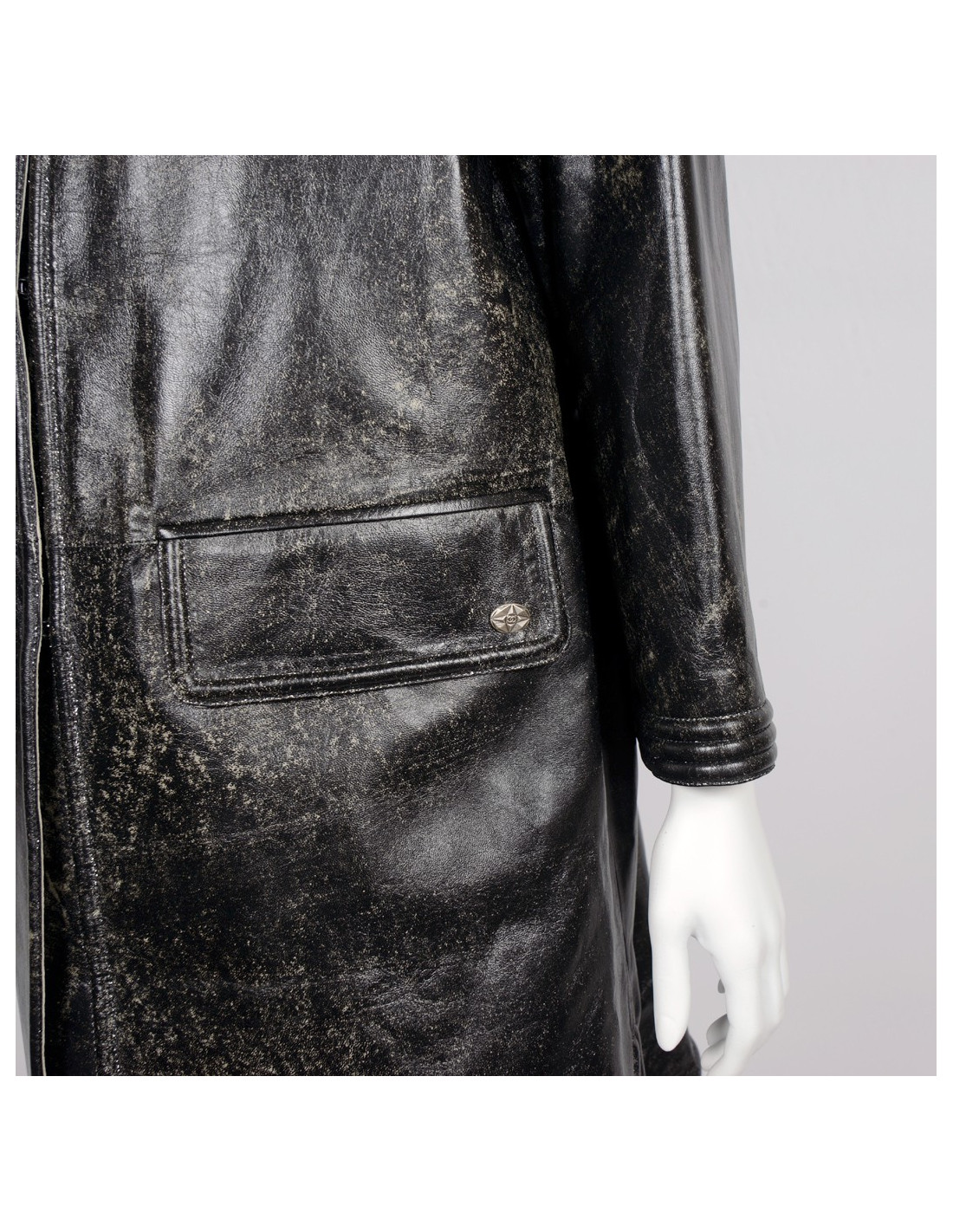 Manteau Chanel en cuir d'agneau noir tacheté de blanc, collection récente. Taille 44, gansé d'un fil d'argent. Fermeture par crochets. 4 poches plaquées à l'avant. Col rond. La doublure est en soie noire avec des motifs qui représentent des camélias, des "CC", etc. Provient des soldes. En très bon état.