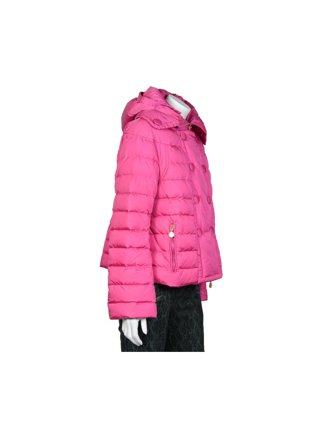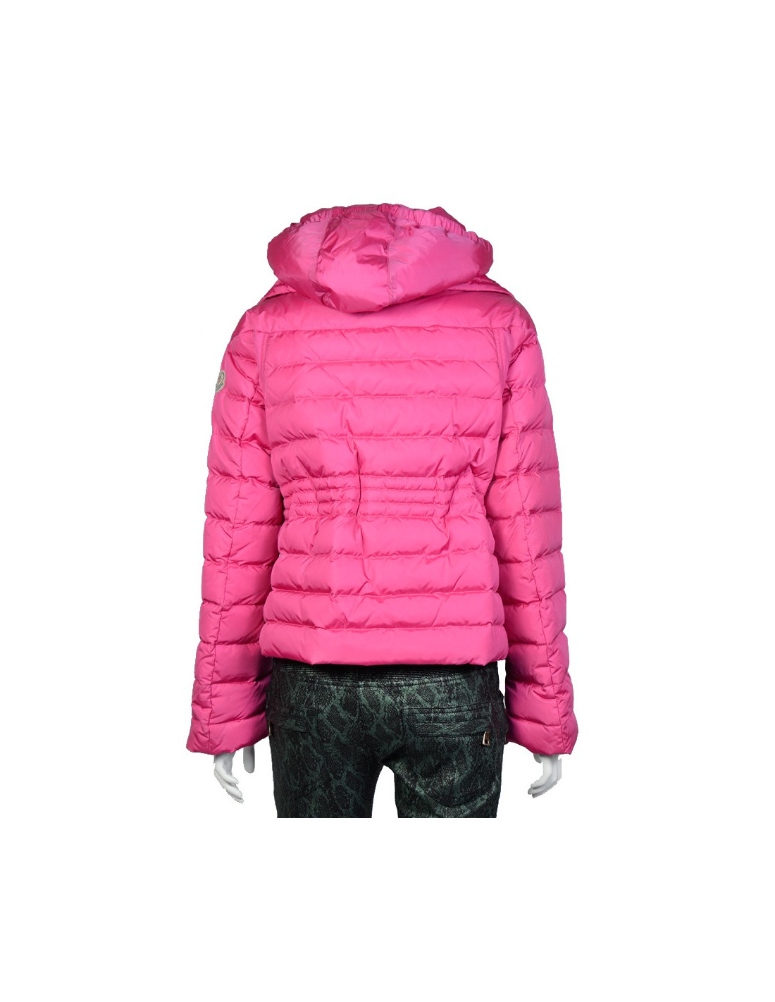 Mythique doudoune Moncler en toile cirée de couleur fuschia. T0 équivaut à un 36 français. Fermeture zippée en métal doré et par bouton pression par dessus. Elle dispose d'une capuche amovible. A l'intérieur, vous y trouverez un cordon qui permet de resserrer la taille. Une poche en biais de chaque côté zippée. En très bon état.