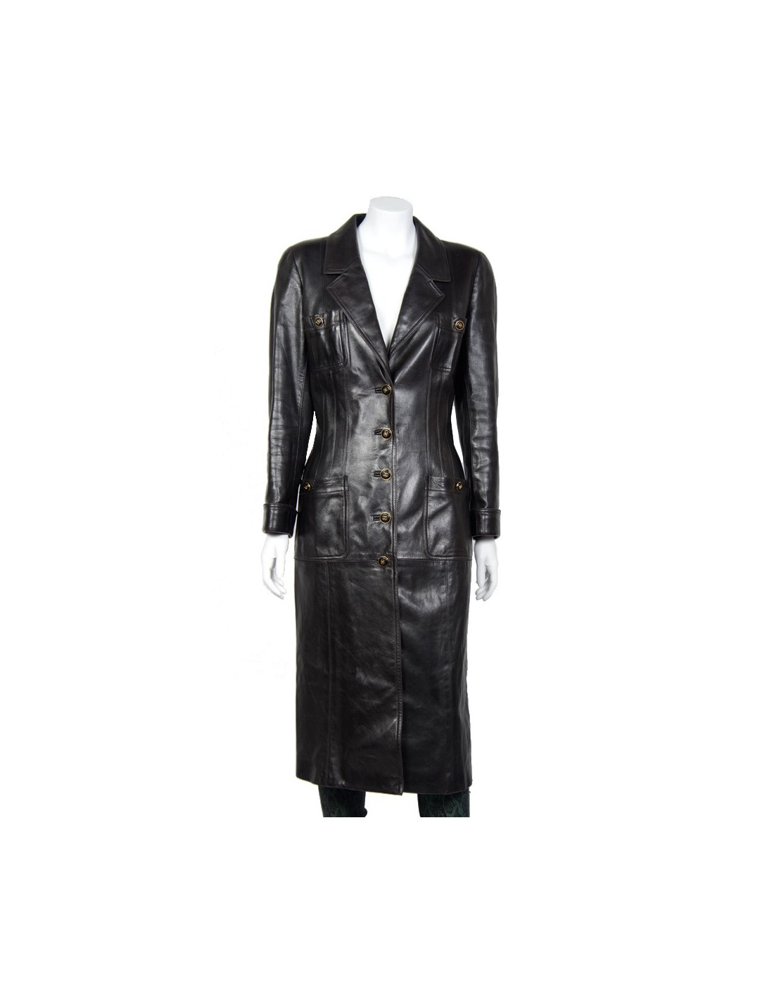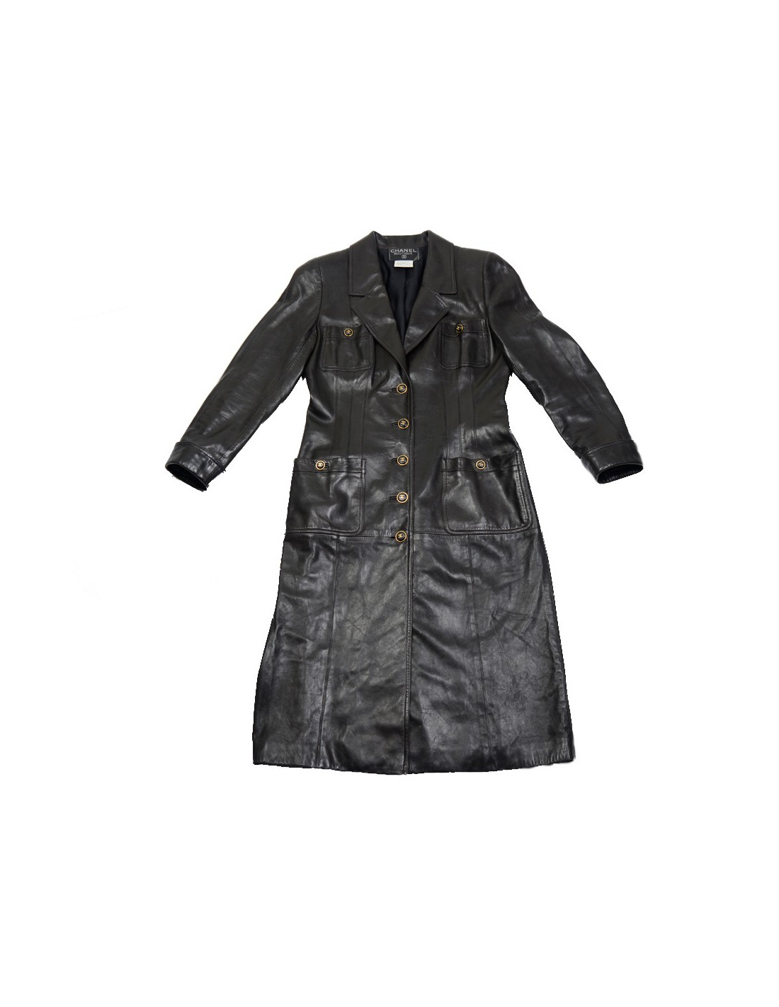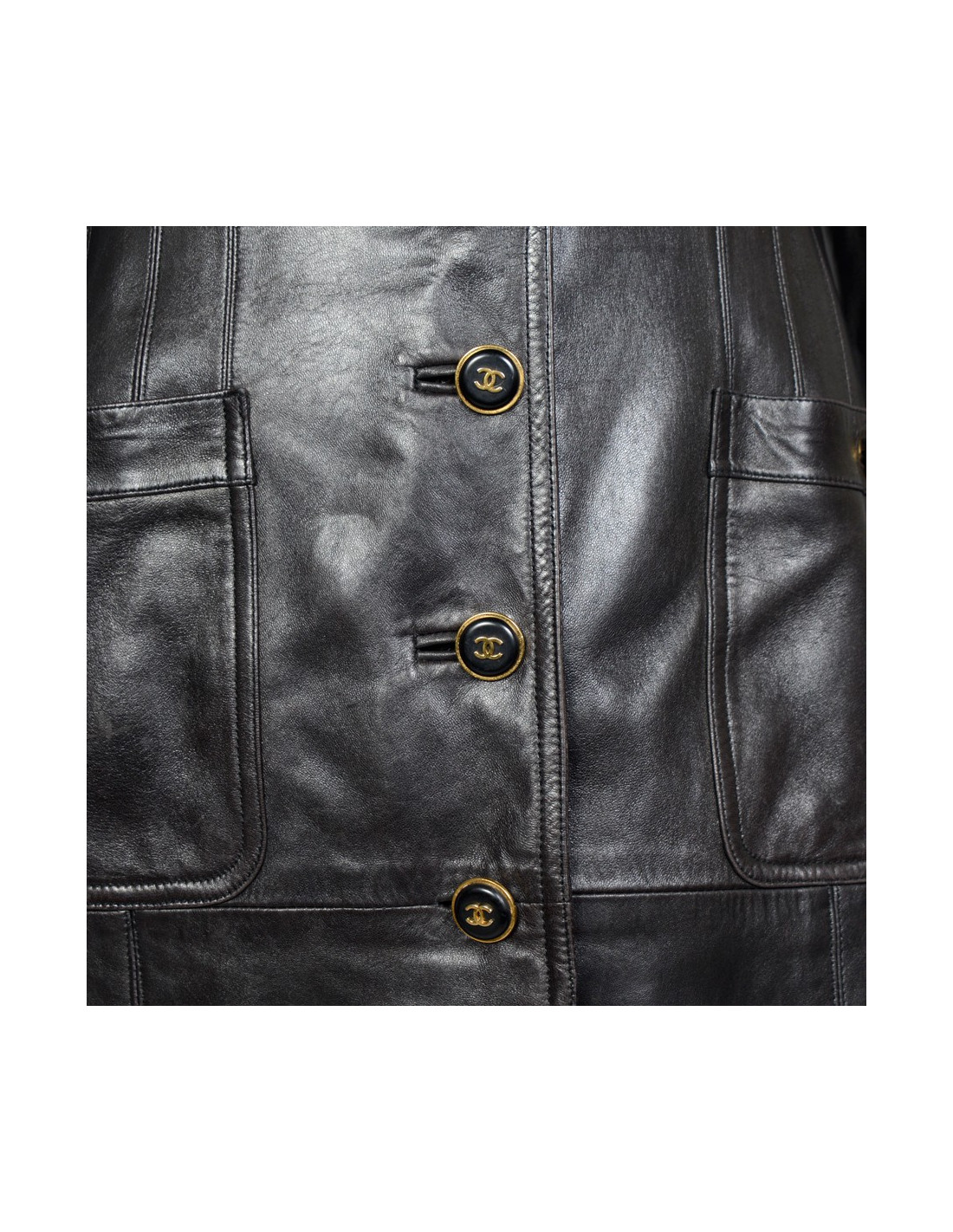 Manteau Chanel en cuir d'agneau noir vintage. Taille 40. Fermeture 5 boutons dorés et noirs siglés "CC". Il dispose de 4 poches plaquées à l'avant fermés par des boutons. La doublure est en soie noire monogram. Epaulettes. En très bon état.