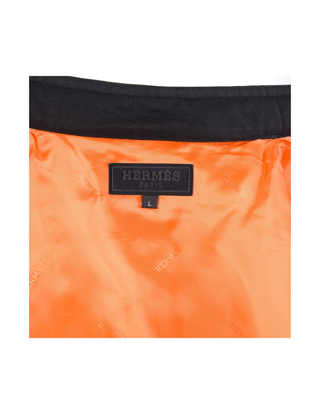 Parka Hermès noire taille L munie de trois poches sur l'avant, et une sur une des deux manches. Elle se ferme par fermeture zippée. Il y a une ceinture élastique à la taille. La doublure est de couleur orange signée Hermès, elle comporte également une poche. La parka n'a jamais été portée. Made in France. Le détail de la fermeture éclair: se termine par un étrier.