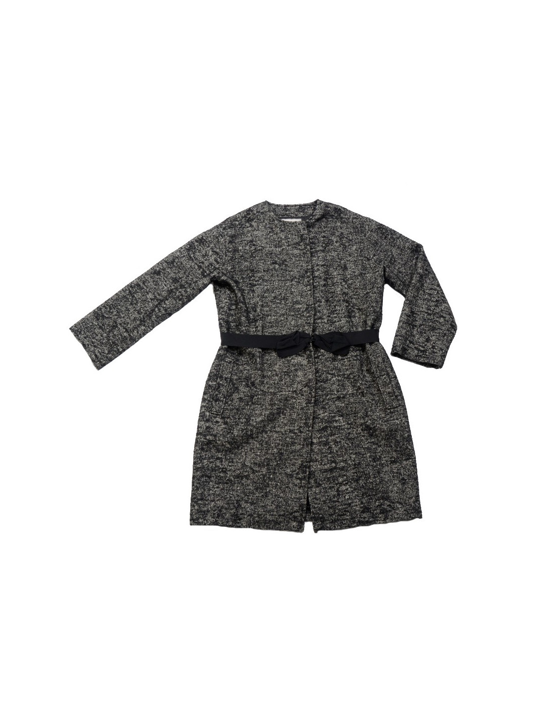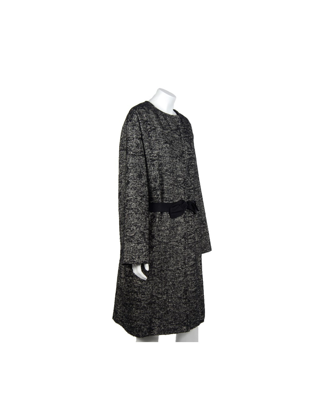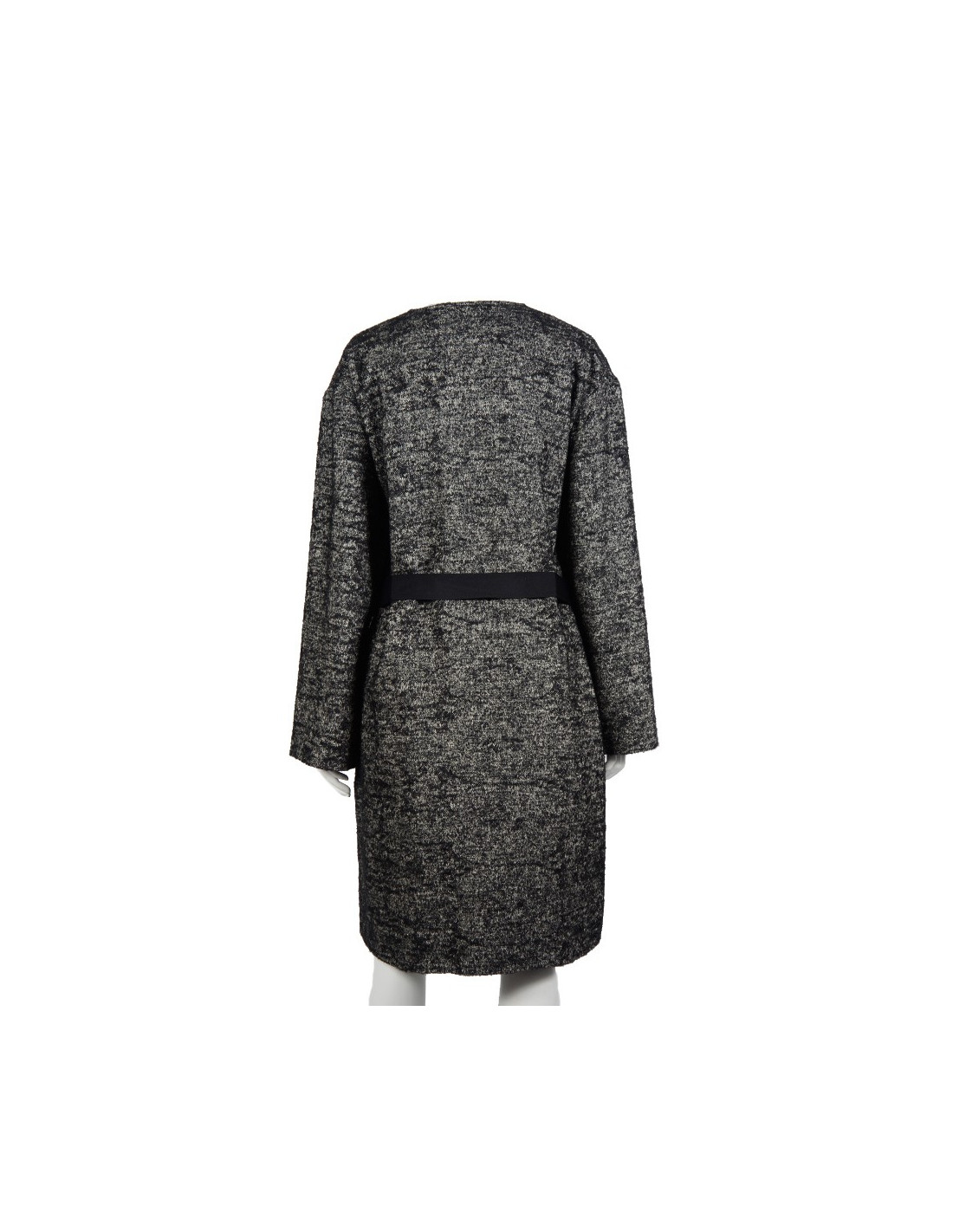 Long manteau Lanvin en lin, laine et alpaga noir et blanc chiné taille 44. Il se ferme par un bouton-pression se trouvant à l'intérieur du manteau. Une ceinture en tissu noir entoure la taille et se ferme par un crochet. Une poche de chaque côté du manteau. Il est en très bon état.