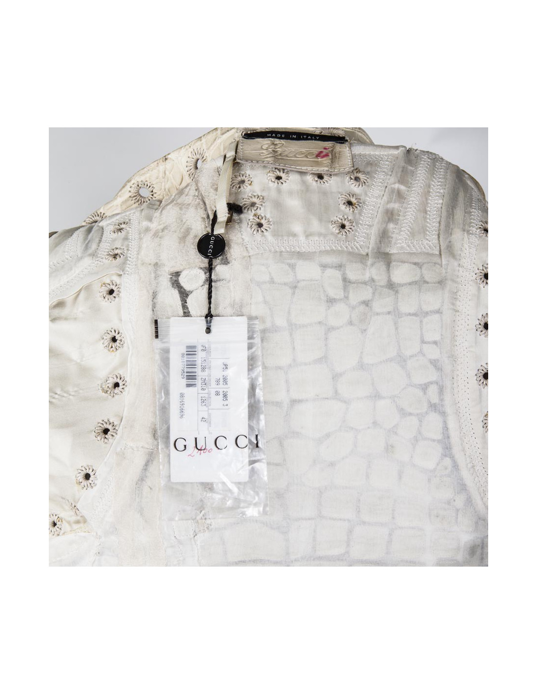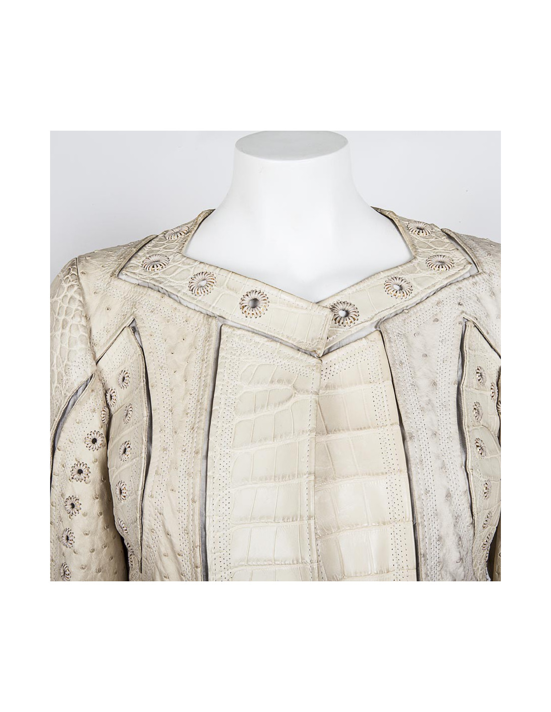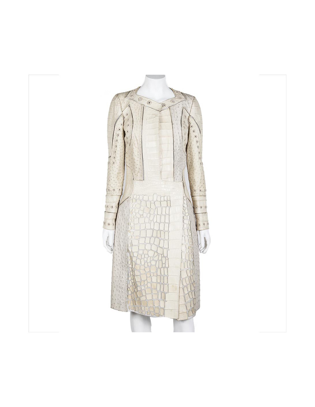 Pièce d'exception. Manteau beige en cuir Gucci taille 42 italien (38 FR). Fendu sur 28 cm des deux côtés arrière. Composé de cuir d'autruche et de crocodile, orné de fils dorés autour du col rond large et sur les manches.