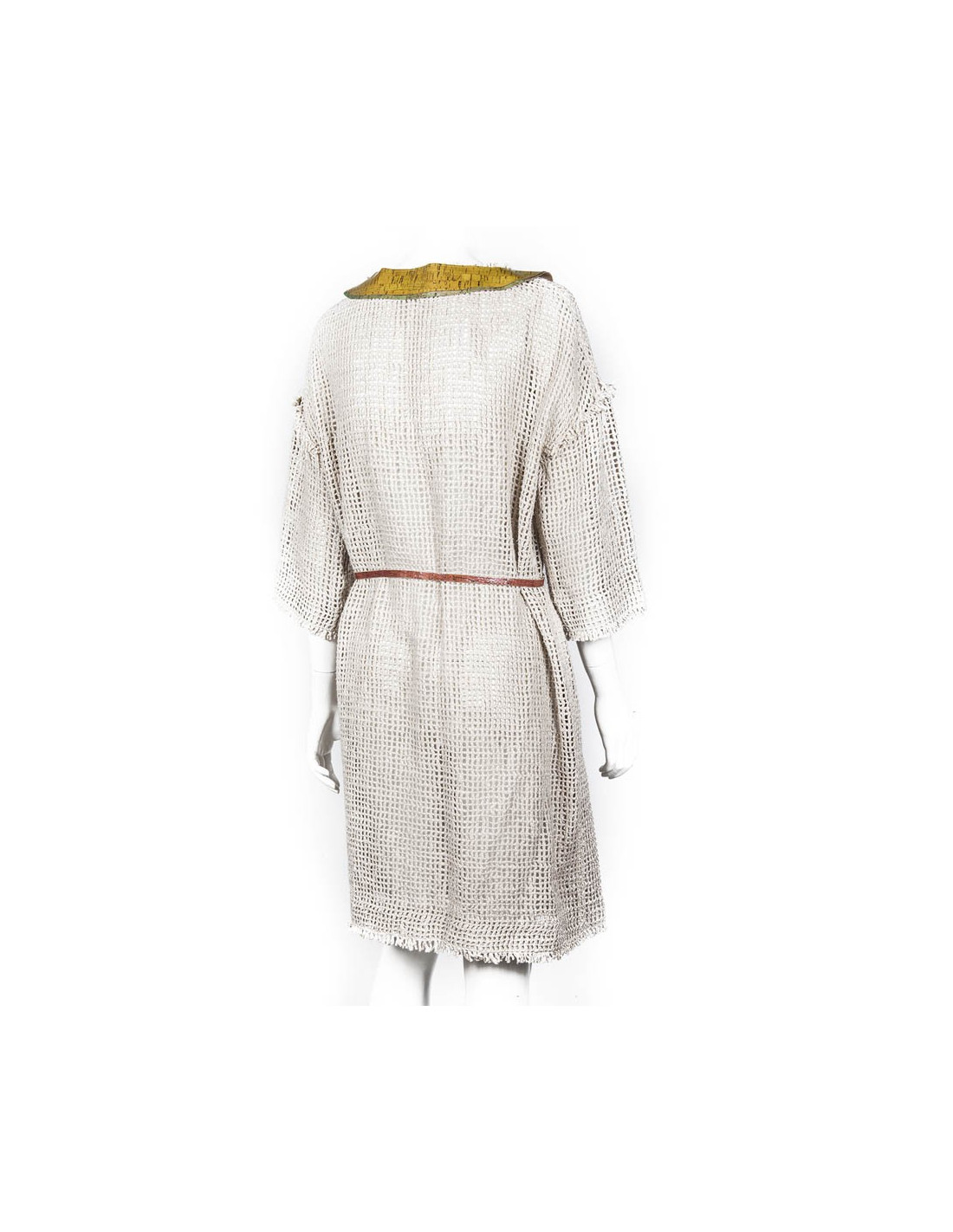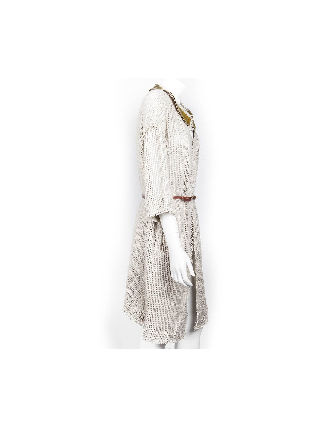 Manteau Maurizio Pecoraro. 100% soie beige. Taille 44 IT équivaut à un 40 FR. Col jaune et vert ainsi qu'une ceinture fine en cuir marron verni. Manches 3/4. En très bon état.
