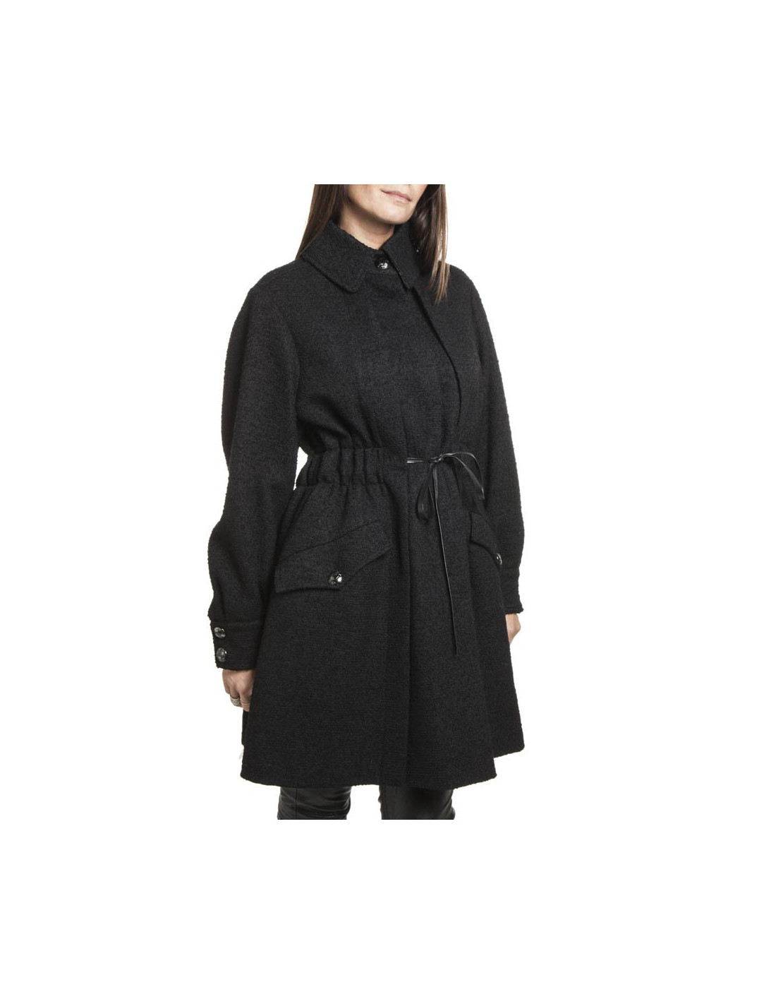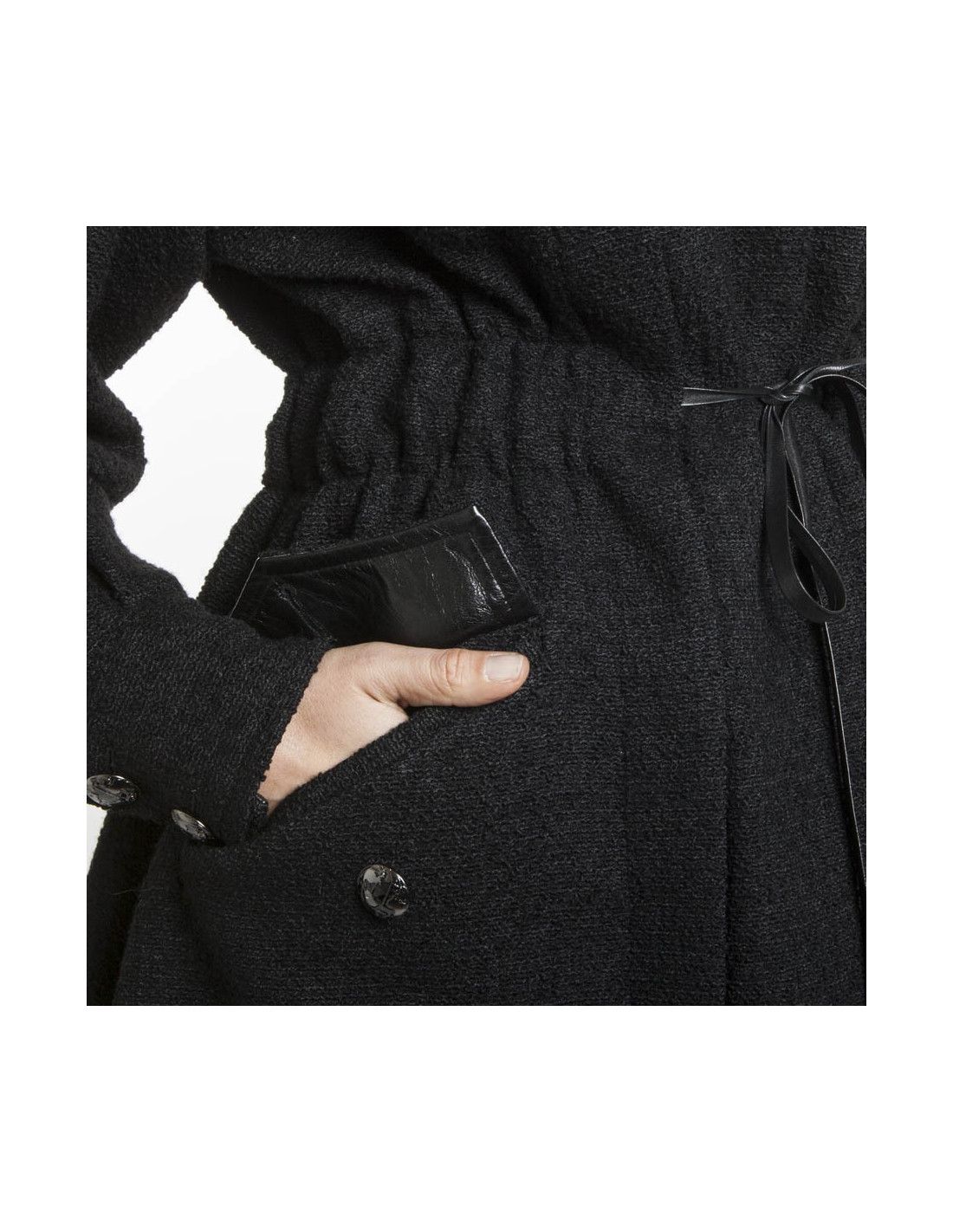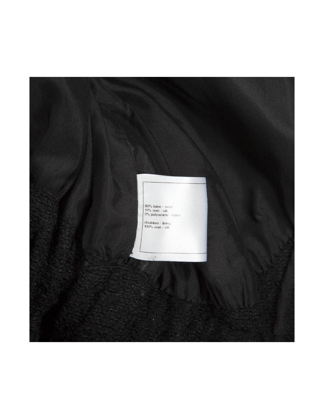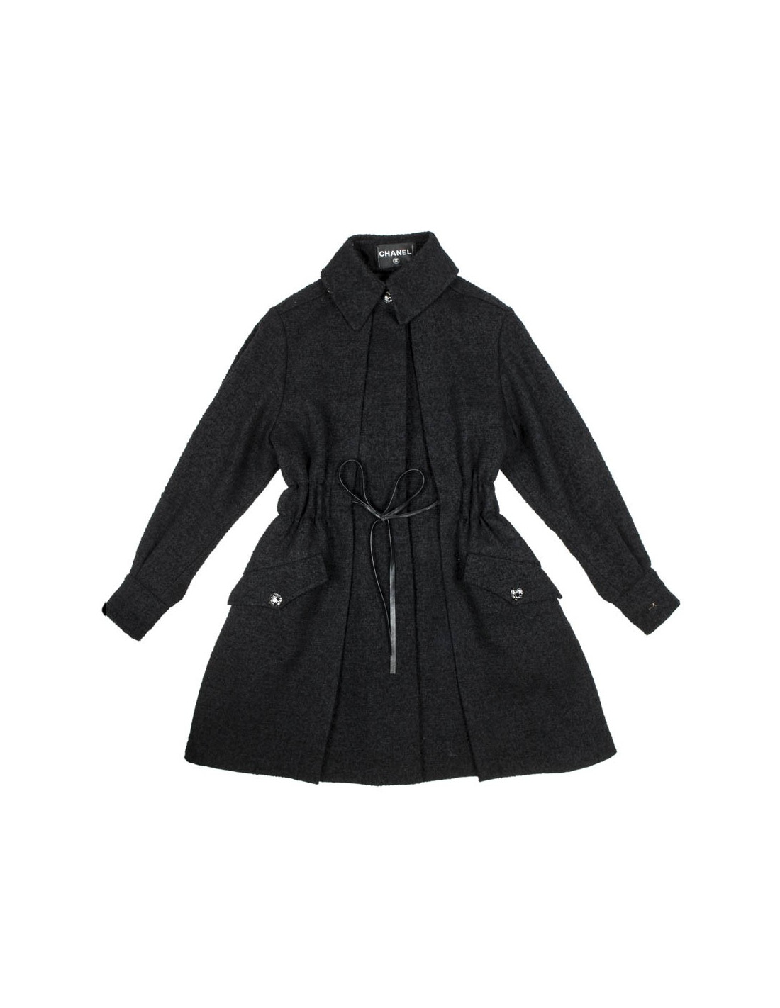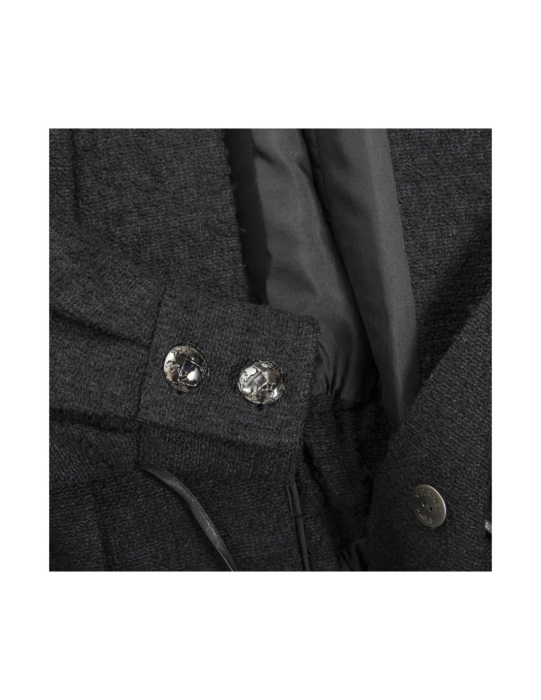 Il se ferme par 6 boutons siglés Chanel et des lanières de cuir noir coulissantes au niveau de la taille. La doublure est en soie noire.