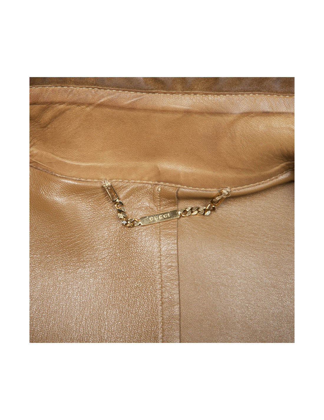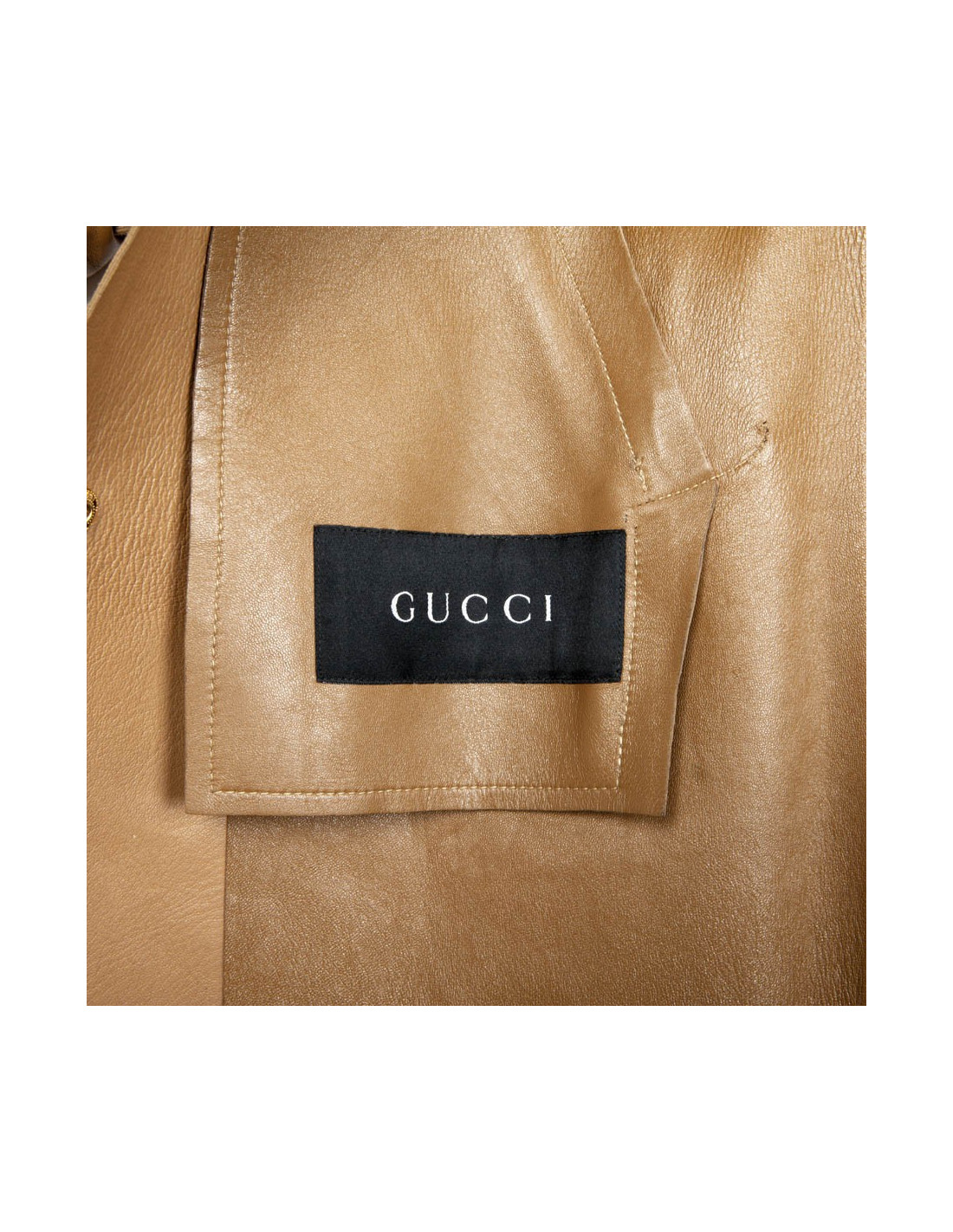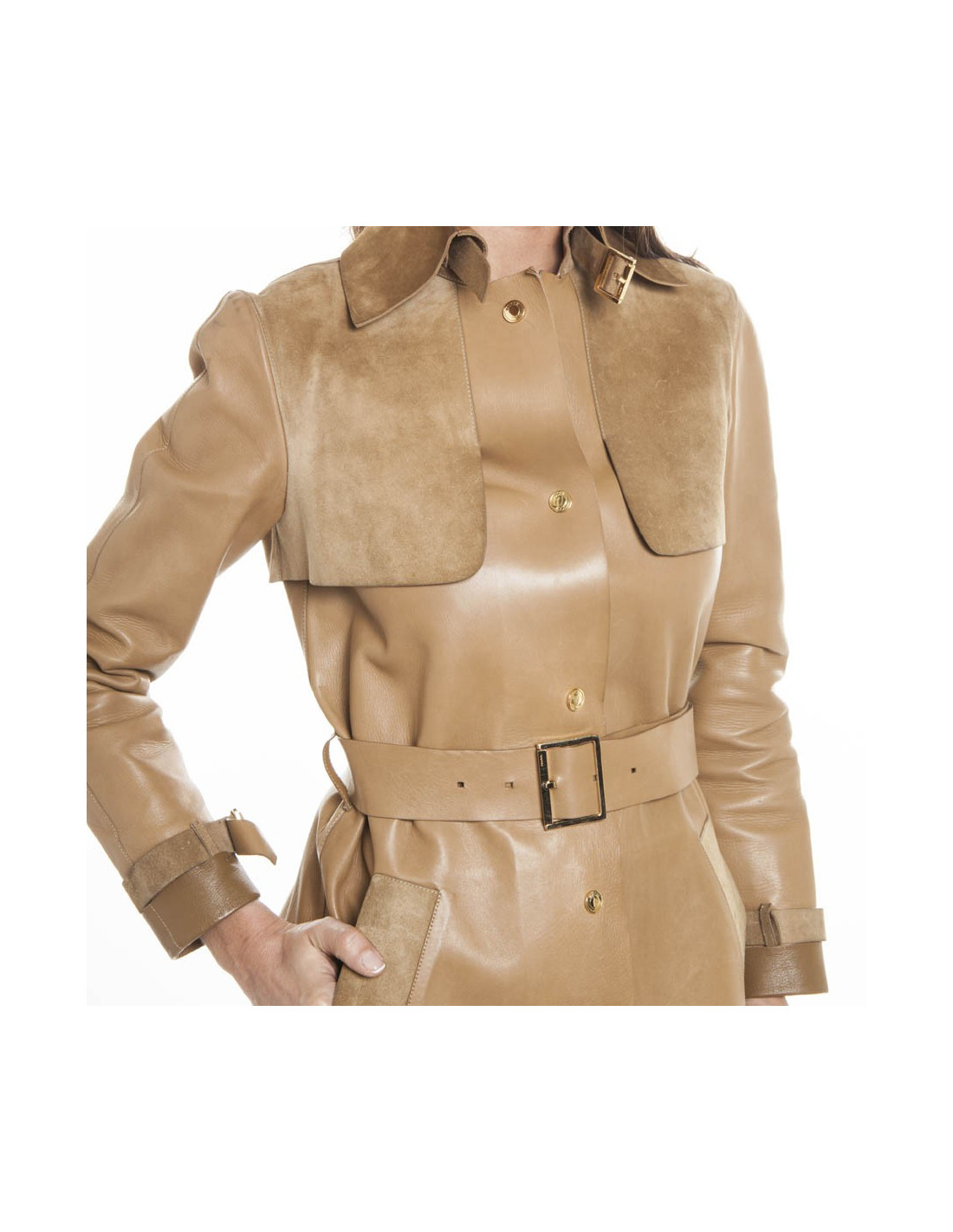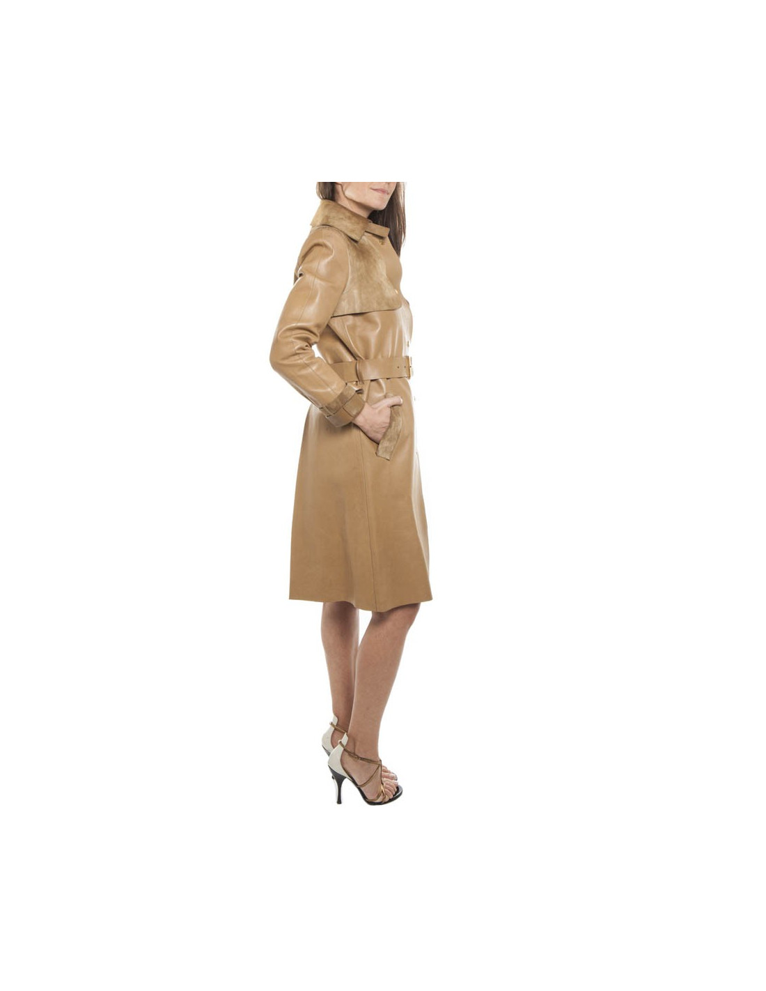 Trench de la Maison Gucci en cuir et daim camel. Pas d'étiquette de taille équivaut à un 36. Fermeture par bouton pression doré. Deux poches en biais à l'avant. Surpiqûres beiges. En très bon état. Quelques traces sur le col et sur l'épaule droite ainsi qu'une petite sur le côté gauche en bas (très peu visible).
