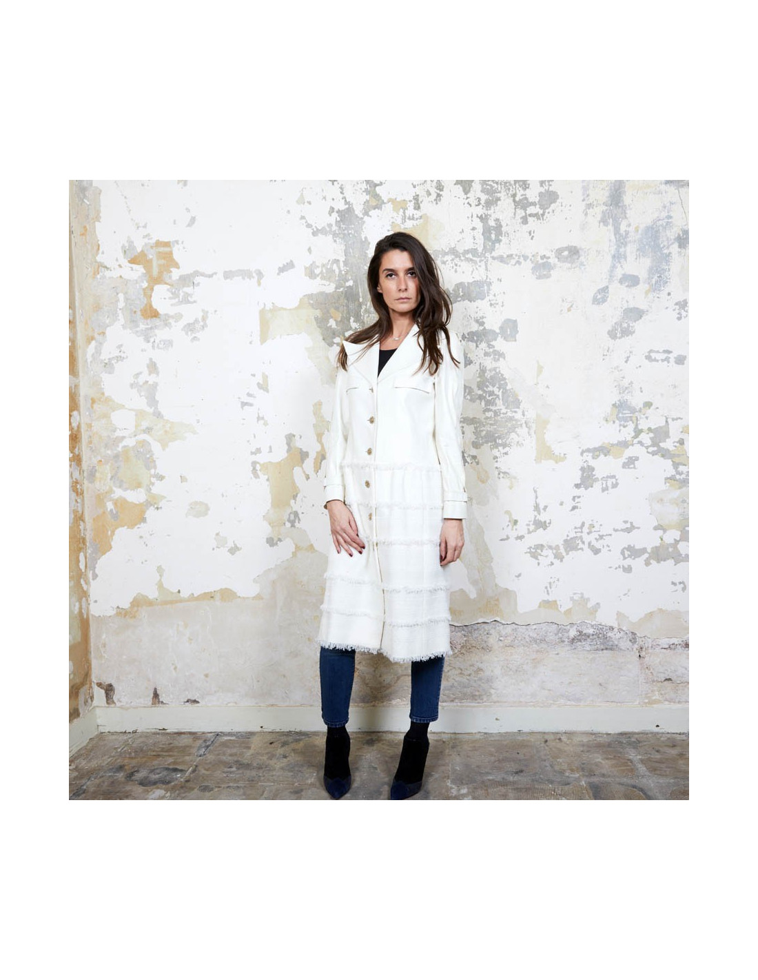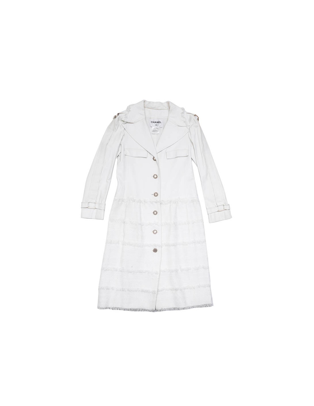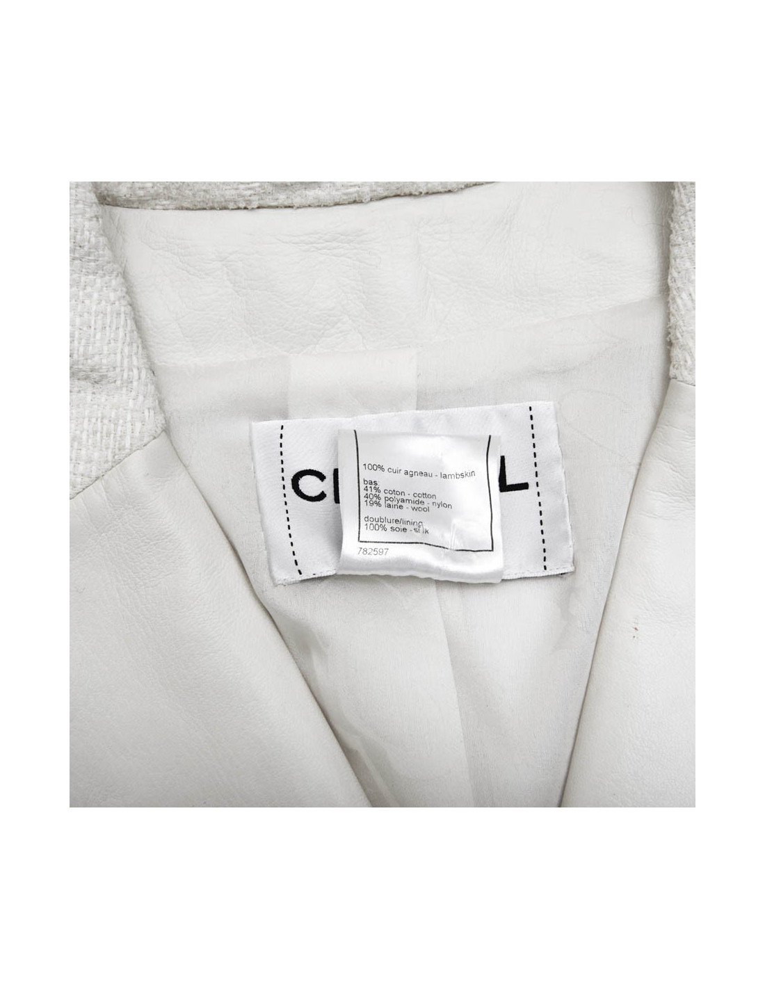 Derniers articles en stock MANTEAUX-TRENCHS Manteau CHANEL tweed blanc et noir CHANEL 35311 5 300,00 € Manteau long CHANEL cuir et tweed Condition : très bon étatPays de fabrication : ItalieTaille : 40Matière : 46% laine, 29% polyamide, 25% alpaga. Incrustations en cuir de veauDoublure : 64% coton, 36% soieCouleur : noir, blancDimensions à plat: épaules : 48 cm, sous la poitrine : 49 cm, hauteur : 130 cm, longueur des manches : 56 cm, tour de poignet : 34... Ajouter au panier